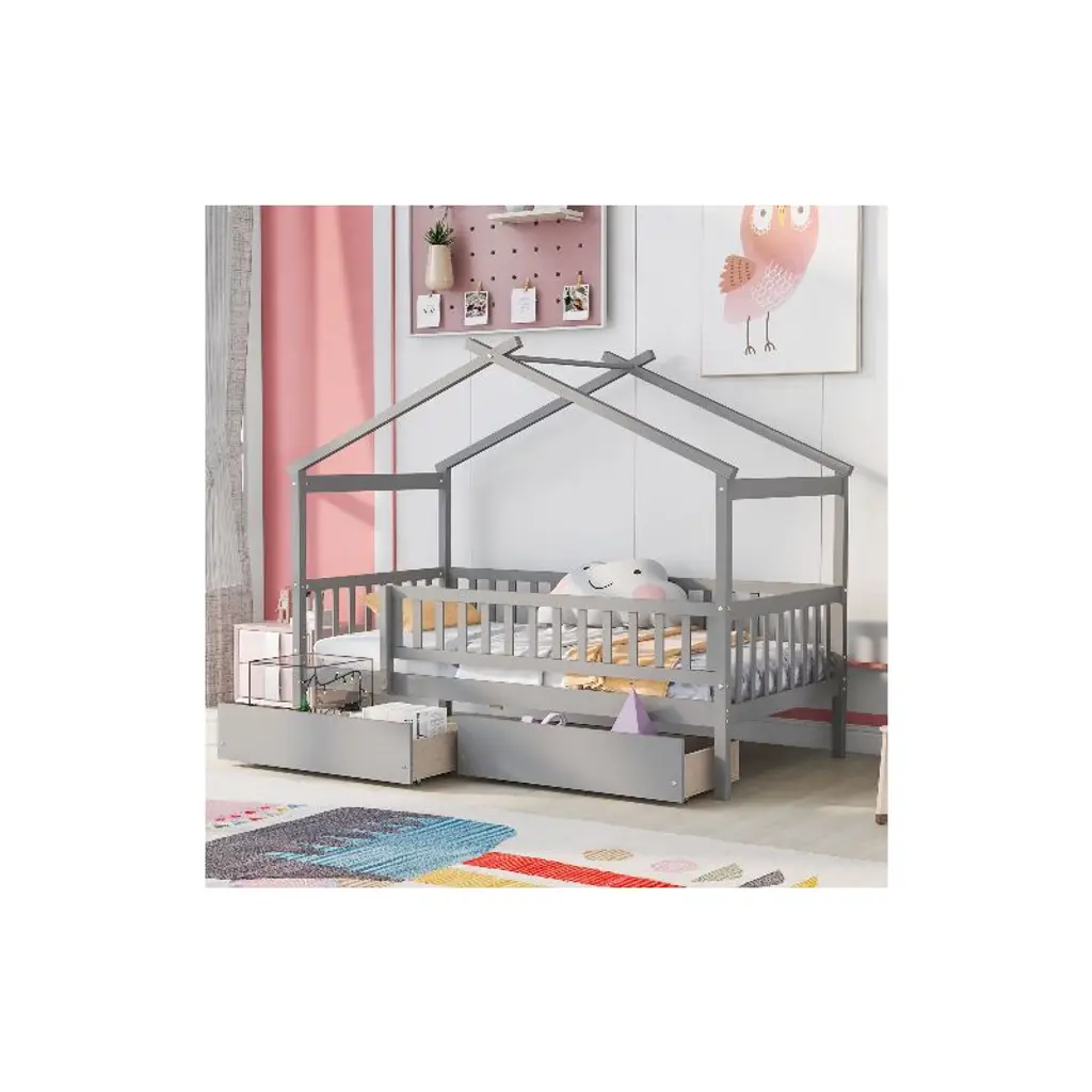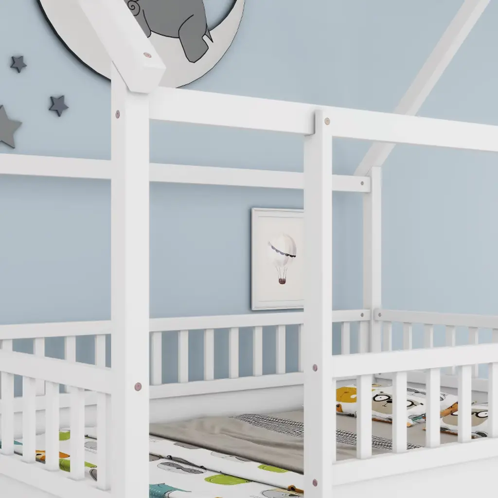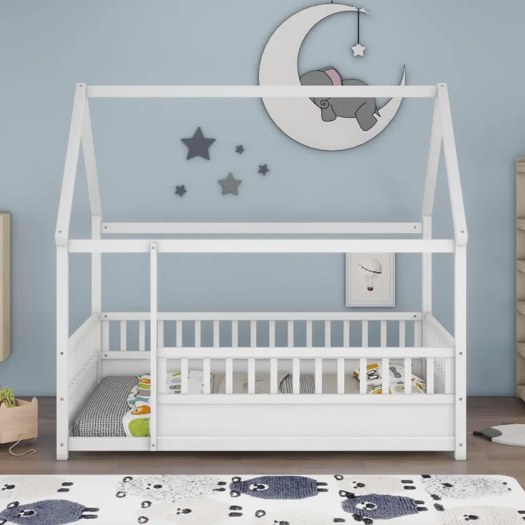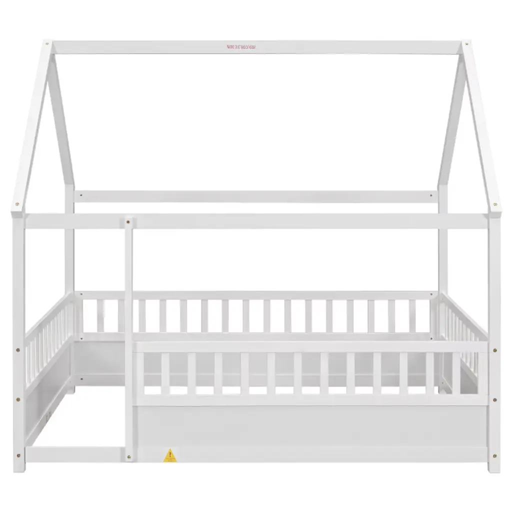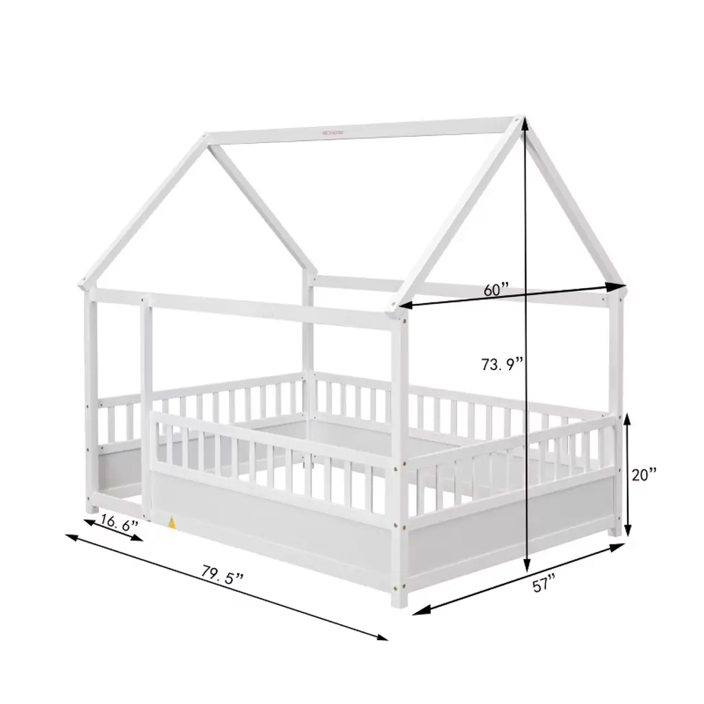 This full-size house frame floor bed brings a whimsical charm to any child’s bedroom. Crafted from durable pine wood, the bed features a unique wood roof design that allows creative decoration and imaginative play. The surrounding fence guardrails offer enhanced safety and a sense of privacy, while the large open entrance makes it easy to get in and out. Solid construction ensures long-term stability. The elevated design accommodates thicker sleeping surfaces for added comfort. With its modern artistic appeal and functional layout, it creates a cozy and fun space for rest and imagination. Comes with an assembly kit and a step-by-step guide for easy setup. Dimensions: 79.53'' W x 59.96'' D x 73.86'' H.