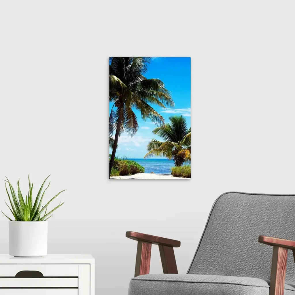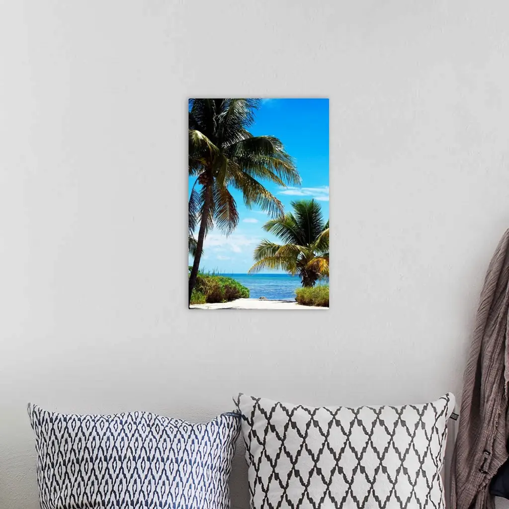 A sandy pathway between palm trees leading down to the ocean.