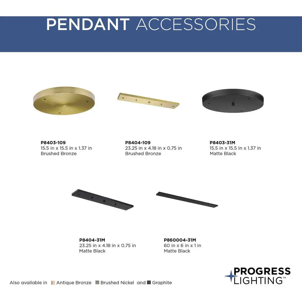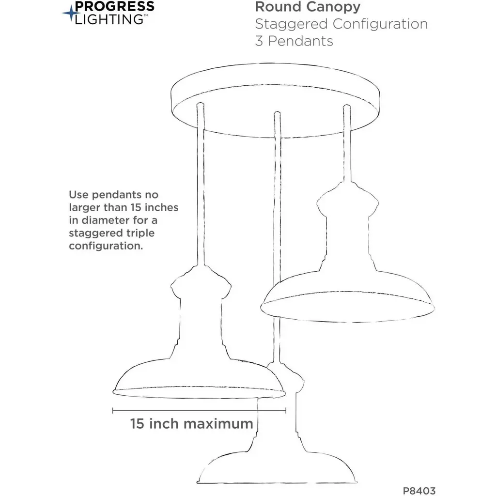 Progress Lighting's canopy accessory offers a convenient way to mount groupings of pendants. Pendants are versatile lighting options for many rooms in your home. Smaller-scale mini-pendants look great when hung in groupings of 3 or more over a kitchen island or table. This round pendant accessory allows for the hanging of 3 pendants off of one outlet box. Pendants can be hung straight or staggered.
