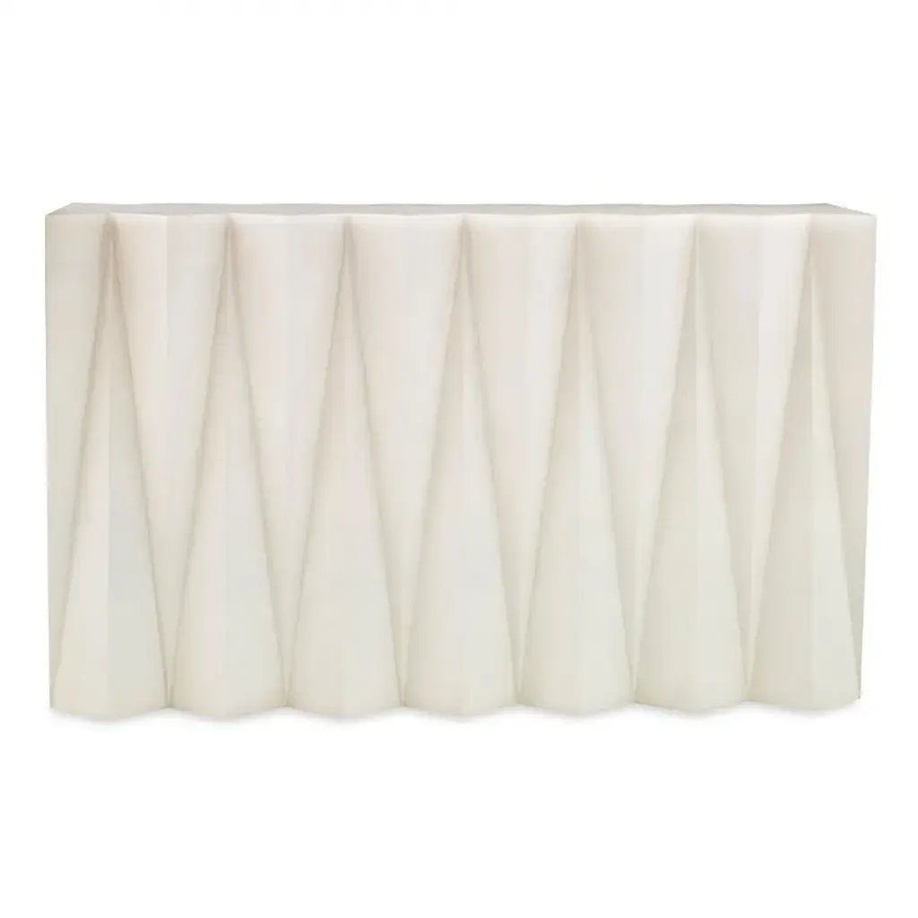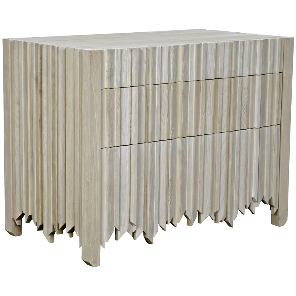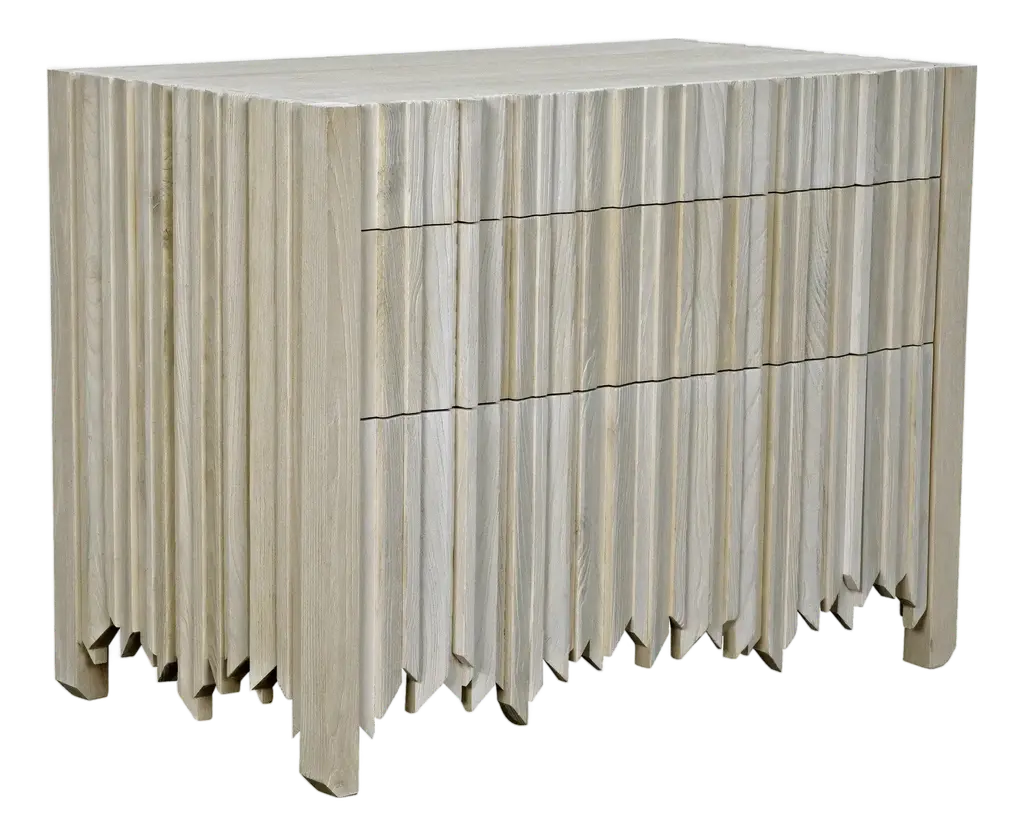 Made of brushed American white oak with a pearlized platinum finish. Four adjustable metal glide feet.