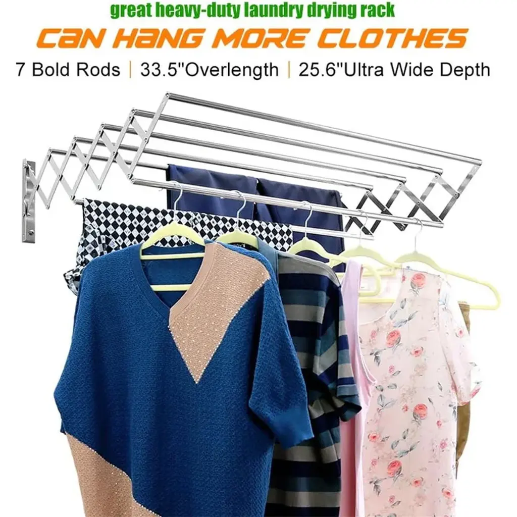 1. **Easy Installation**: Designed with ascrew hole distance of 32 inches, this clothes drying rack can be easilymounted directly on drywall studs, eliminating the need for wooden boards.2. **One-Piece Rods**: Featuring upgradedone-piece rods with a thicker diameter, this drying rack can support animpressive weight of up to 250 pounds, making it perfect for heavy laundryloads.3. **Spacious Drying Area**: With a widthof 33.5 inches and a depth of 16 inches, this wall-mounted rack offers 19.5feet of drying space across 7 rods, accommodating clothes, towels, and more.4. **Enhanced Ventilation**: The greaterunfolding depth of 25.6 inches improves air circulation and drying efficiency,allowing for easier hanging and retrieval of clothes.5. **Quality Assurance**: Backed by a1-year manufacturer warranty, this rack promises durability and reliability.Customer support is readily available to assist you with any inquiries.