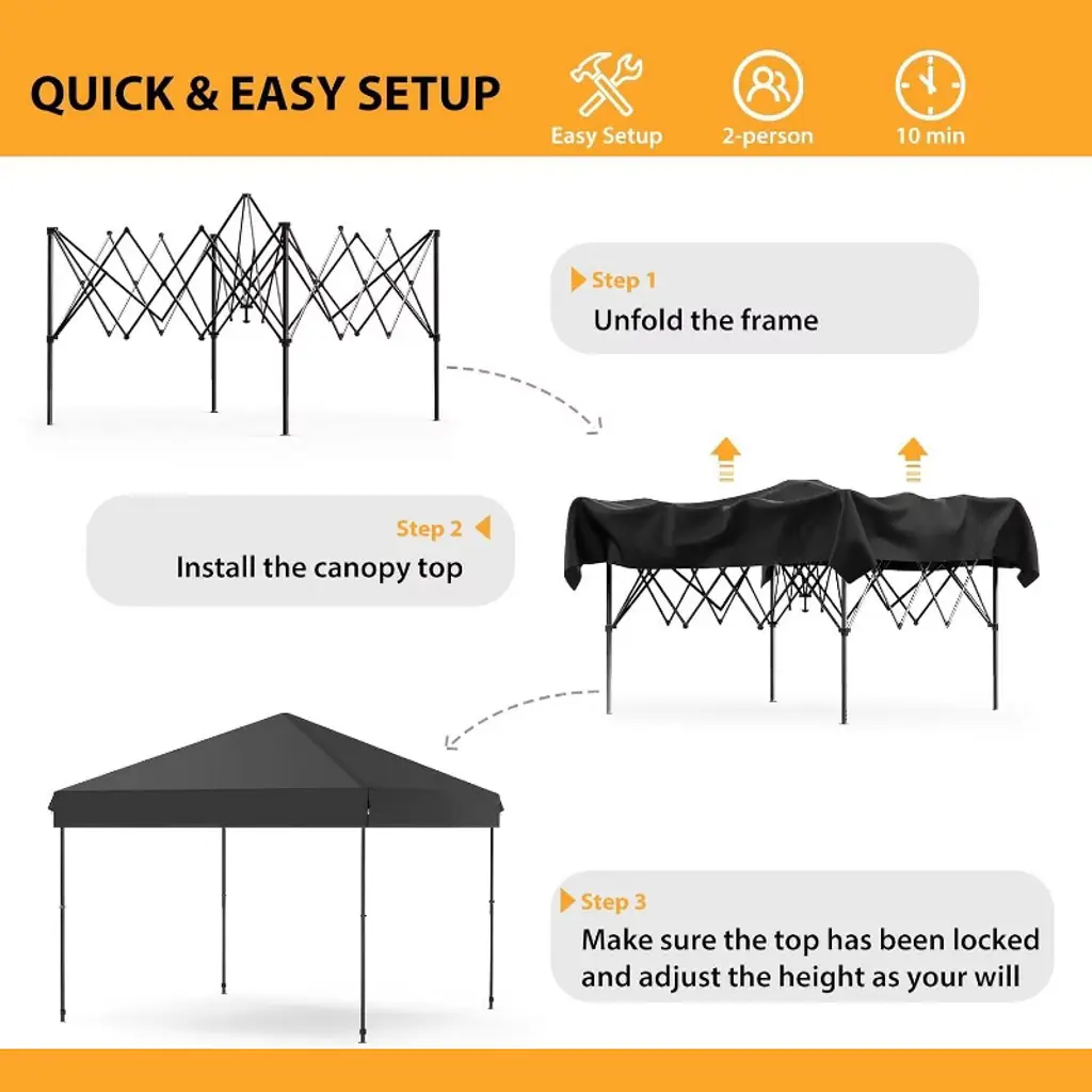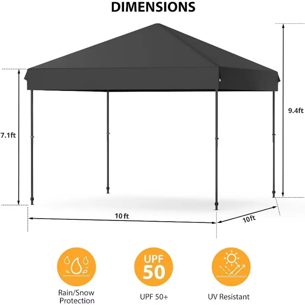 Product Overview: The Acekool pop-up canopy tent brings quick, effective shade to any outdoor space. Set it up solo with the push of a button, and enjoy flexible height options for added comfort. Whether you need shelter for the beach, park, backyard, or a busy outdoor event, this canopy helps you create an inviting space for friends, family, or customers. Key Features: This canopy includes a water-resistant, UV-protected top that blocks up to 98% of harmful rays, giving you peace of mind against sun and rain. The sturdy steel frame and reinforced connections keep your tent stable on multiple surfaces. Adjustable heights and wide shade coverage make it suitable for many uses, from fairs to parties. Four sandbags, guy ropes, and stakes help anchor the tent securely, so you can relax and enjoy your event. Specs & What's Included: The canopy can be set at three different heights for custom shade. Each kit comes with a steel frame, canopy top, 4 sandbags, 4 ropes, 4 stakes, and a wheeled carry bag for easy setup and transport. Choose from five classic colors to suit your style and needs for any outdoor activity or gathering.