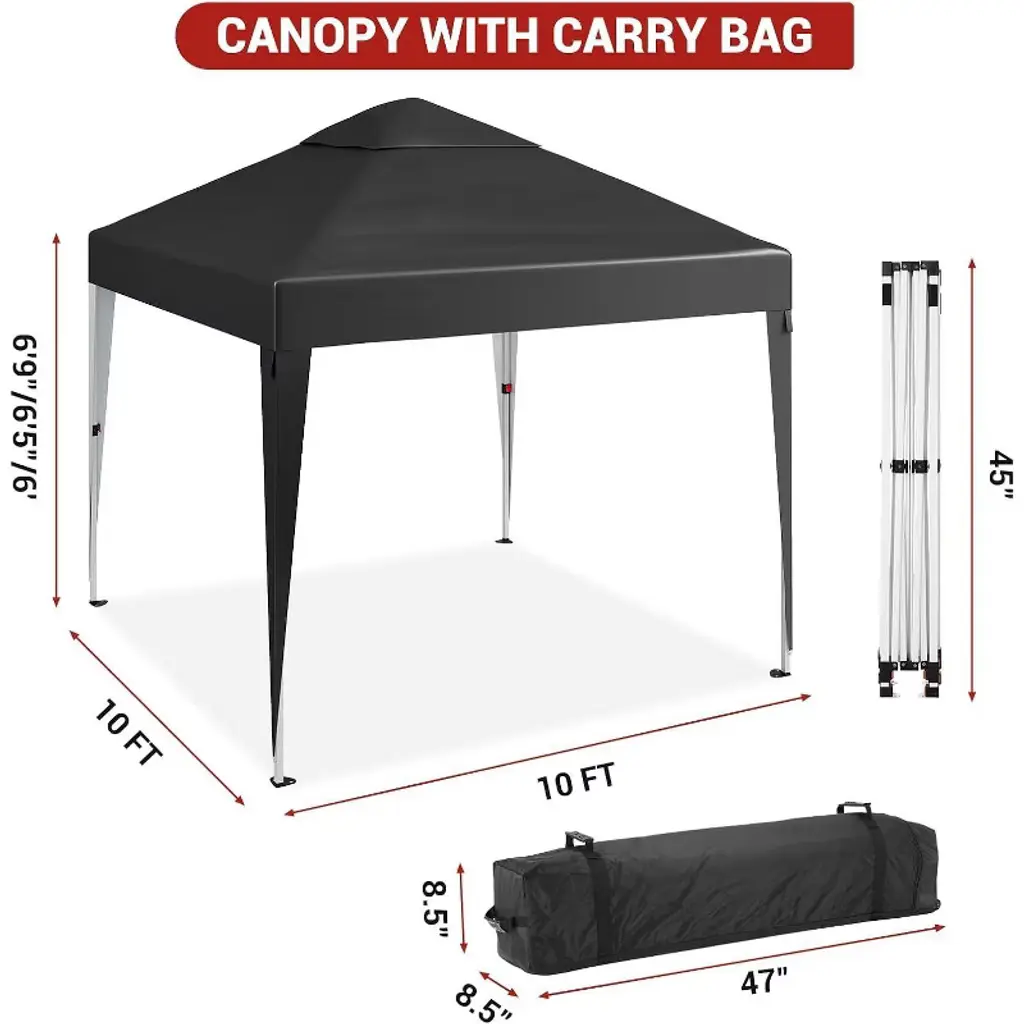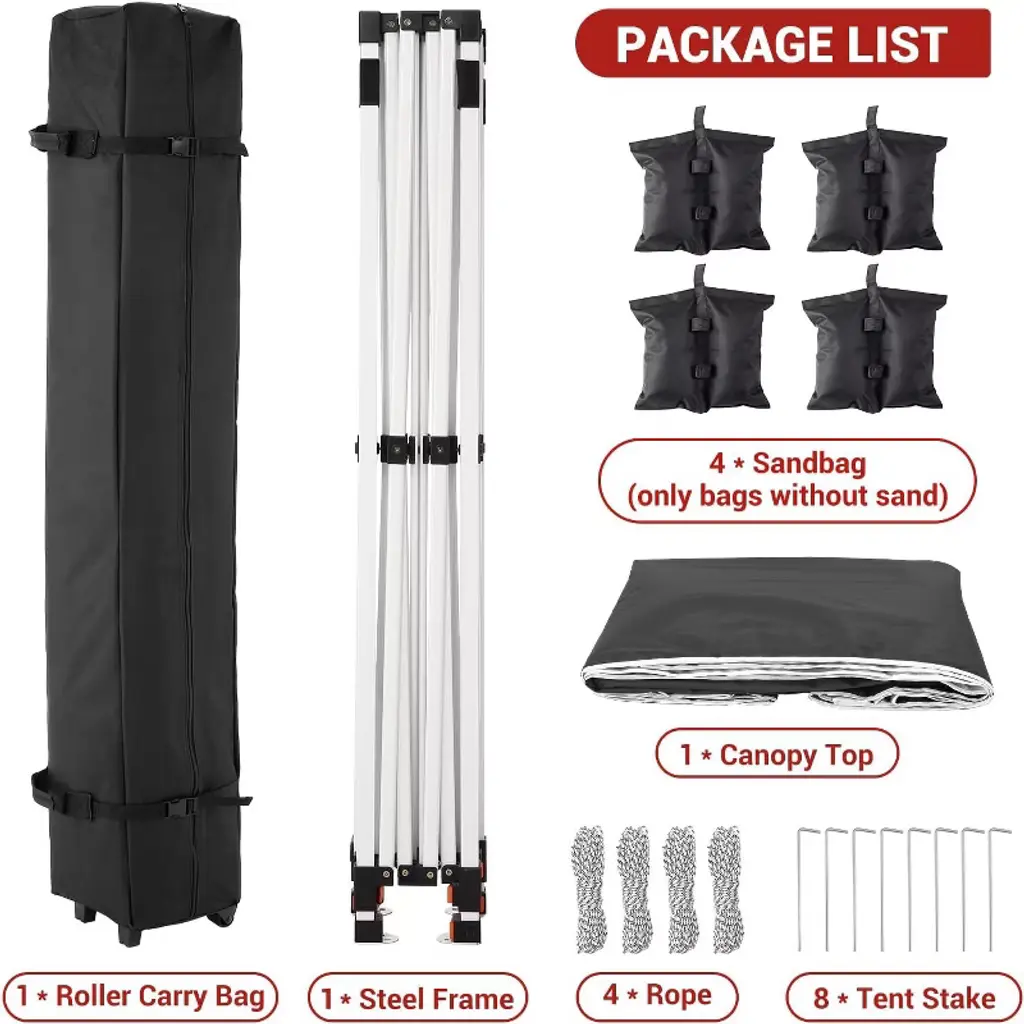 The Acekool 10x10 Pop Up Canopy Tent brings quick, strong shelter for outdoor events, markets, camping, or the beach. Designed for two-person setup, it expands in just minutes and fits easily in most vehicles for stress-free transport. A top air vent increases airflow, keeping the space cooler during warm weather and reducing wind stress. The waterproof canopy cover with heat-sealed seams offers 50+ UV protection, shielding you and your guests from sun, wind, and rain. The frame uses reinforced steel bars and anchored feet for dependable support, making this tent suited for a range of busy outdoor occasions. Packed in a sturdy roller bag with smooth wheels and reinforced base, this kit is easy to maneuver and store. A full set of accessories, including 4 sandbags for added weight and security, ensures stable use on grass, sand, or pavement. Whether for daily gatherings or special events, this canopy keeps everyone safe and comfortable.