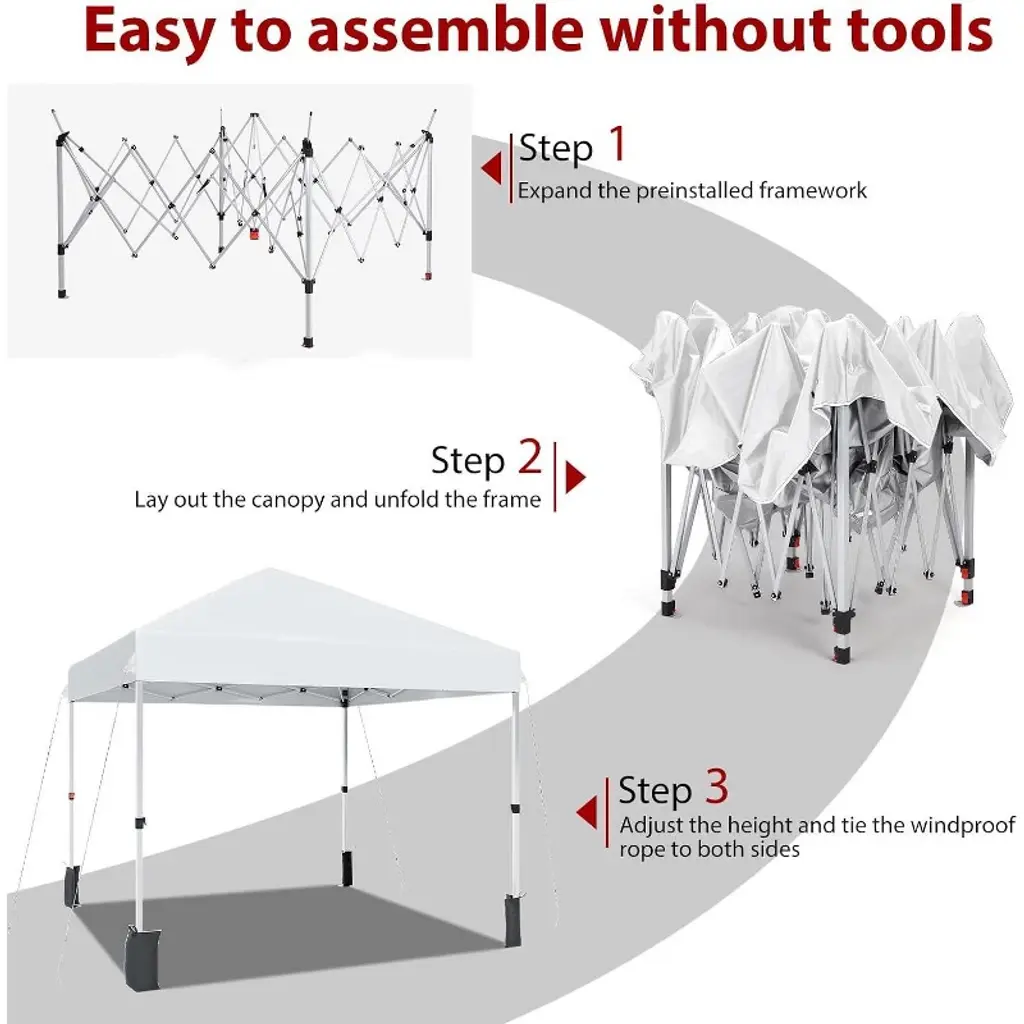 The Acekool 10x10 Pop Up Canopy Tent offers instant and spacious shade wherever you go. Designed for solo setup, it features a central handle—just push to unfold, adjust the legs, and it's ready in under a minute. This portable shelter delivers 100 square feet of sun or rain protection for outdoor parties, markets, picnics, and events. A 150D silver-coated oxford top provides UPF 50+ sun defense and water resistance, keeping your group cool and dry in any season. The heavy-duty steel frame with reinforced corners resists daily use and supports winds up to 20+ mph when anchored with included sandbags and stakes. Height adjusts to create the coverage you need. When you're done, the canopy collapses quickly into a compact wheeled bag for simple storage and transport. Complete with sandbags, ropes, and stakes, you’ll have reliable shade on beaches, patios, and campsites all year long.