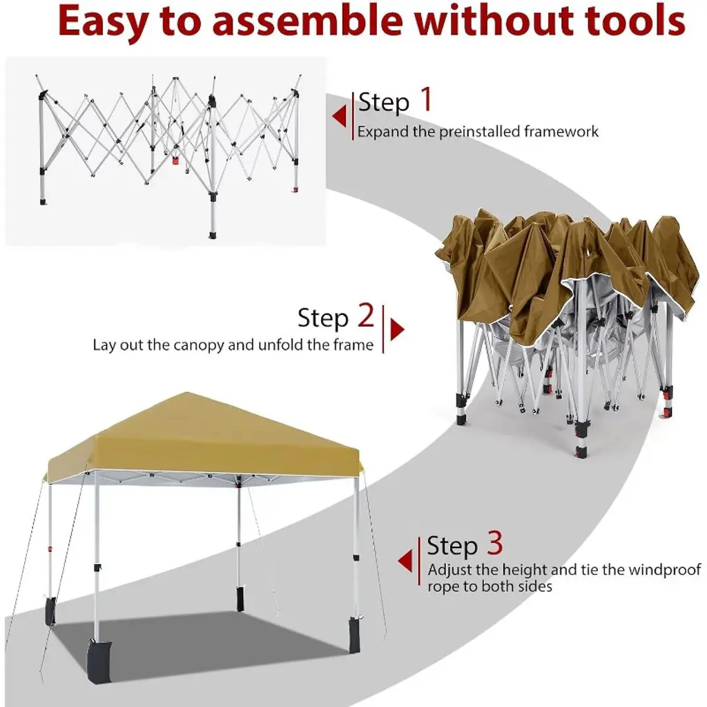 The Acekool 10x10 Pop Up Canopy Tent offers instant and spacious shade wherever you go. Designed for solo setup, it features a central handle—just push to unfold, adjust the legs, and it's ready in under a minute. This portable shelter delivers 100 square feet of sun or rain protection for outdoor parties, markets, picnics, and events. A 150D silver-coated oxford top provides UPF 50+ sun defense and water resistance, keeping your group cool and dry in any season. The heavy-duty steel frame with reinforced corners resists daily use and supports winds up to 20+ mph when anchored with included sandbags and stakes. Height adjusts to create the coverage you need. When you're done, the canopy collapses quickly into a compact wheeled bag for simple storage and transport. Complete with sandbags, ropes, and stakes, you’ll have reliable shade on beaches, patios, and campsites all year long.