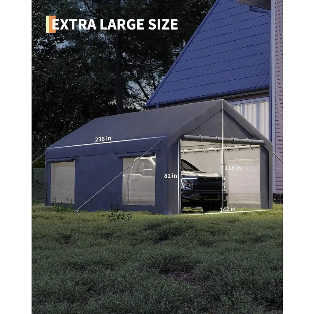 Acekool 12x20 Ft Carport With 200g Pe Tarp, Roll-up Doors, 4 Mesh Windows, Galvanized Steel Frame, Gray - Fits Pickups, Suvs, Boats
