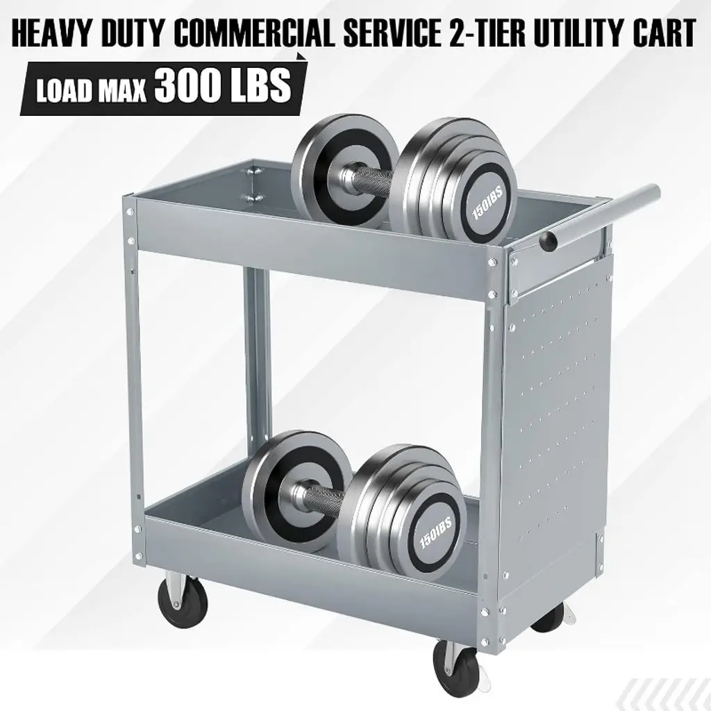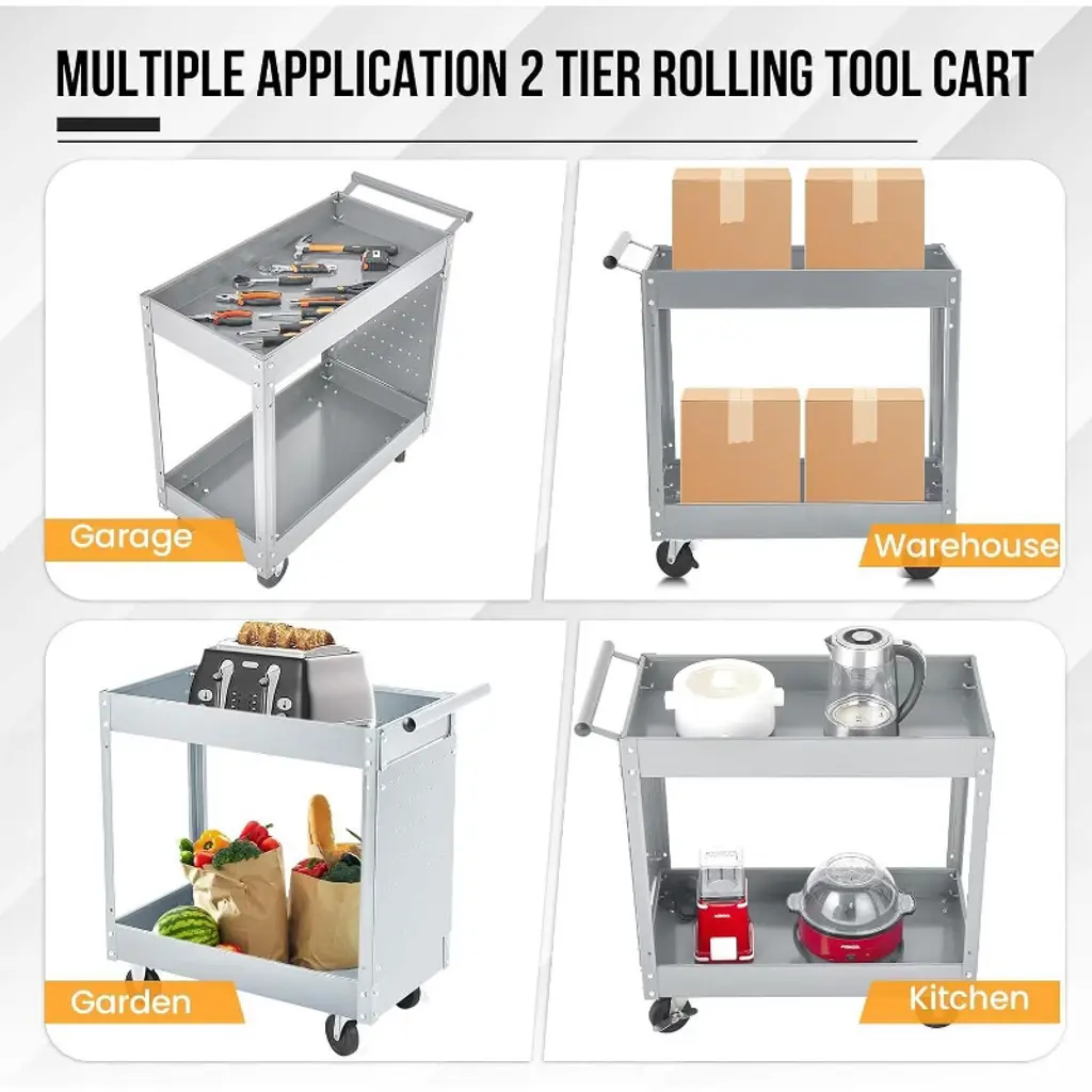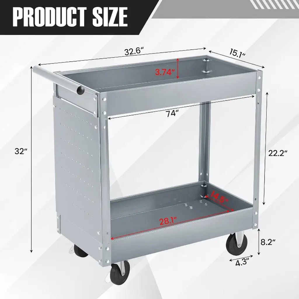 The Acekool 2-Tier Metal Utility Cart is designed to meet demanding storage and transport needs in garages, workshops, warehouses, and repair shops. Crafted from steel with a protective finish, it holds up to 330 lbs, providing a reliable solution for heavy tools and materials. Two spacious shelves with raised edges offer secure storage, making it easy to organize and access your items while keeping them safe during movement. Mobility is enhanced by four rubber swivel casters that roll smoothly on various flooring types, including uneven or rough surfaces. Two locking casters add stability when stationary for safer use. The ergonomic handle ensures comfortable handling whether you’re maneuvering through tight spots or open spaces. This utility cart is easy to assemble and built for versatile use. Its functional design supports various tasks, from transporting tools to organizing parts across work areas. Whether you’re a mechanic, craftsman, or DIY enthusiast, this cart brings convenience and order to your workspace. Dimensions: Overall Size: 29.14" L x 15.16" W x 32.09" H Shelf Size (each): 29.14" L x 15.16" W x 3.74" H Load Capacity: 330 lbs total Includes 4 swivel rubber casters, 2 with locks Constructed with industrial steel and powder-coated finish