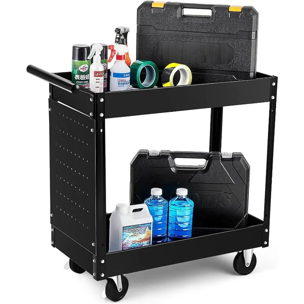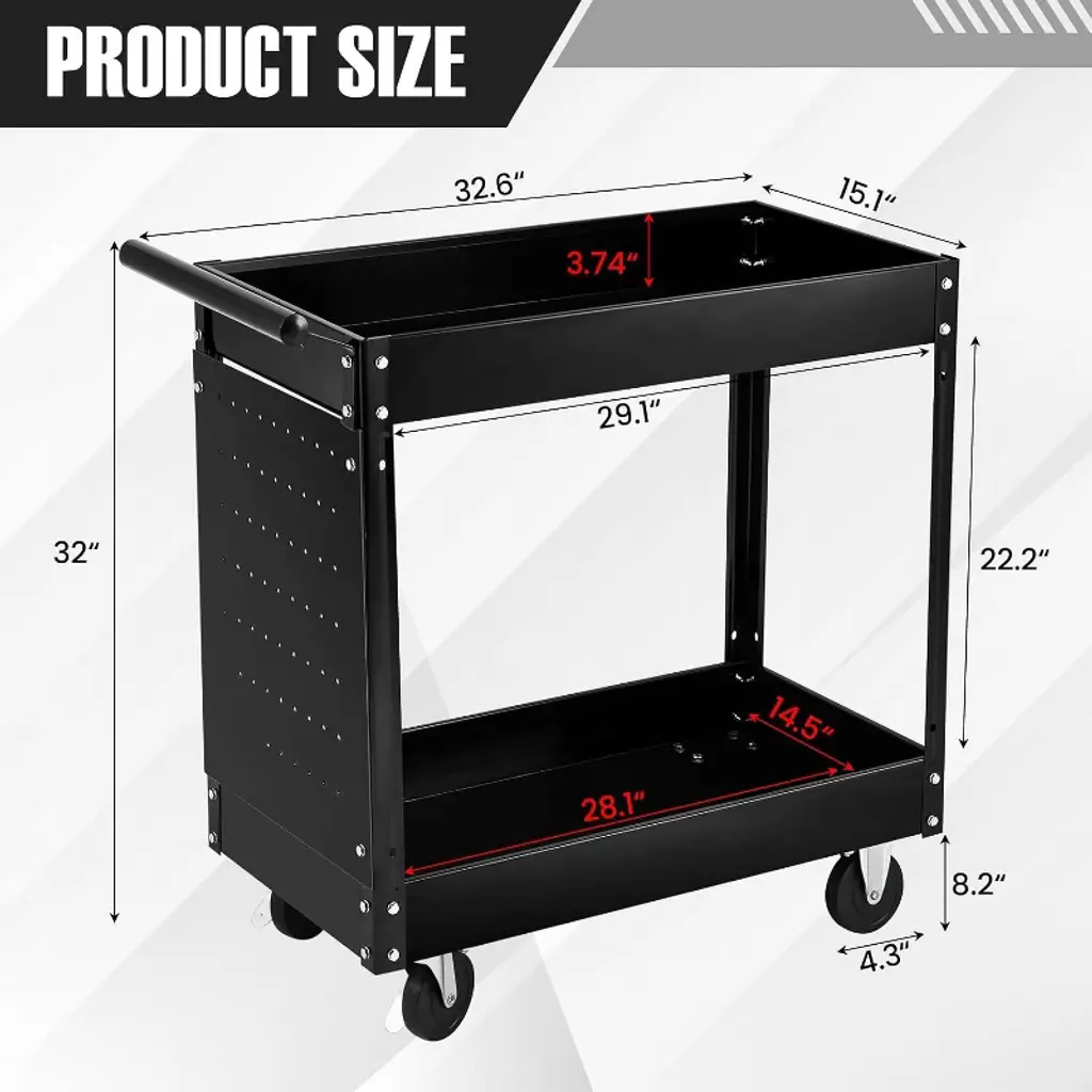 The Acekool 2-Tier Metal Utility Cart is designed to meet demanding storage and transport needs in garages, workshops, warehouses, and repair shops. Crafted from steel with a protective finish, it holds up to 330 lbs, providing a reliable solution for heavy tools and materials. Two spacious shelves with raised edges offer secure storage, making it easy to organize and access your items while keeping them safe during movement. Mobility is enhanced by four rubber swivel casters that roll smoothly on various flooring types, including uneven or rough surfaces. Two locking casters add stability when stationary for safer use. The ergonomic handle ensures comfortable handling whether you’re maneuvering through tight spots or open spaces. This utility cart is easy to assemble and built for versatile use. Its functional design supports various tasks, from transporting tools to organizing parts across work areas. Whether you’re a mechanic, craftsman, or DIY enthusiast, this cart brings convenience and order to your workspace. Dimensions: Overall Size: 29.14" L x 15.16" W x 32.09" H Shelf Size (each): 29.14" L x 15.16" W x 3.74" H Load Capacity: 330 lbs total Includes 4 swivel rubber casters, 2 with locks Constructed with industrial steel and powder-coated finish