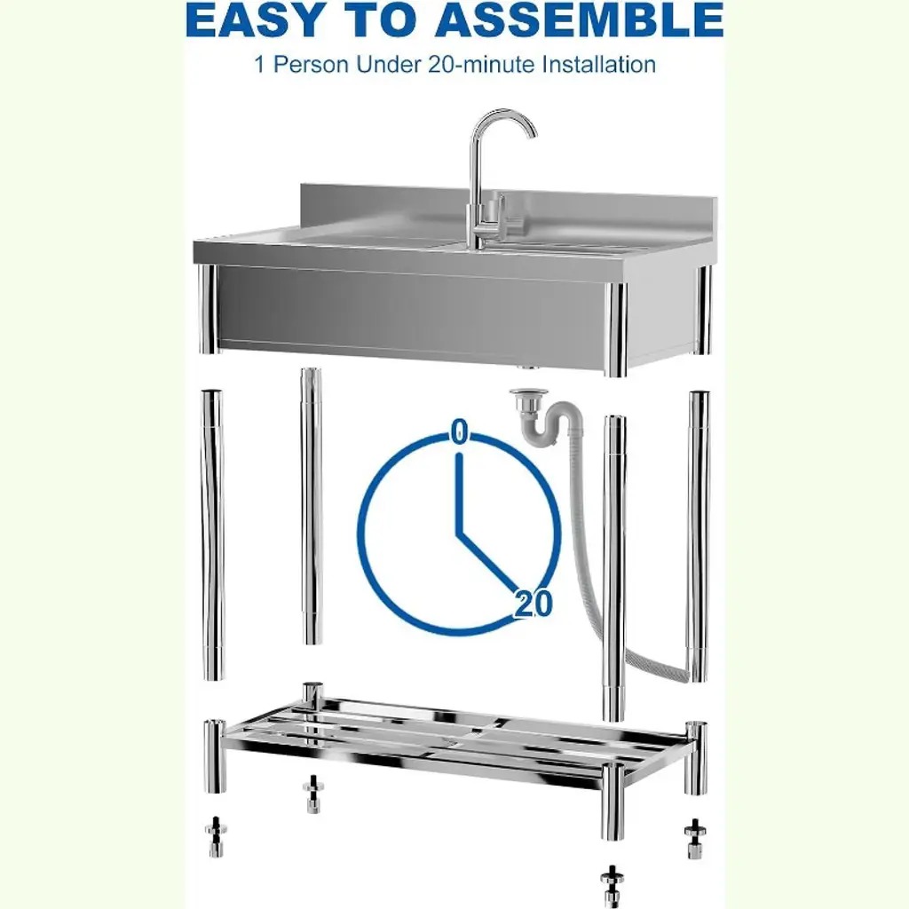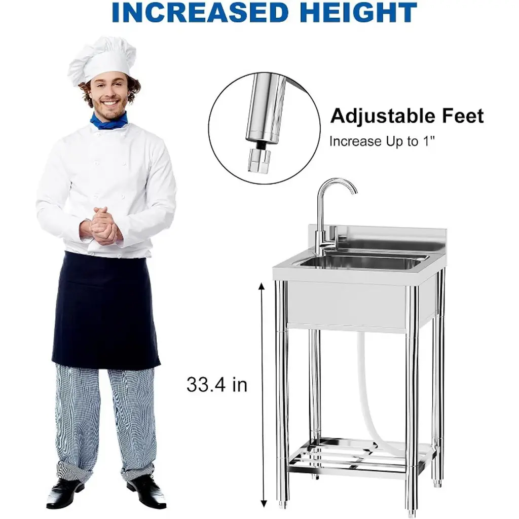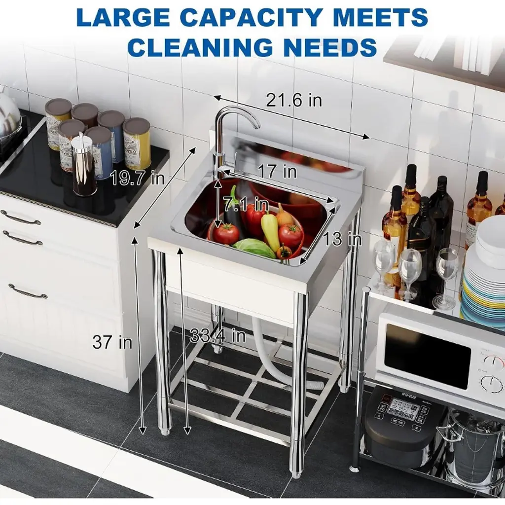 Acekool’s 21-inch stainless kitchen sink is a versatile choice for kitchens, outdoor patios, laundry rooms, or restaurants. The large basin gives you plenty of room to tackle dishwashing, food prep, or hand-washing clothes. The 360° rotating faucet helps rinse every corner, while hot and cold water supply options make it useful year-round. A roomy top rack and shelves underneath increase your organization options, with dedicated slots for knives and space for storage bins or appliances to help maximize kitchen efficiency. Designed for easy assembly, each part is marked and explained in the instructions, so you can set up the sink with minimal time or hassle. The smooth stainless surface wipes clean with just water and soap, making maintenance easier. With generous dimensions, this sink fits well in both home and commercial spaces where you need reliable washing and storage.