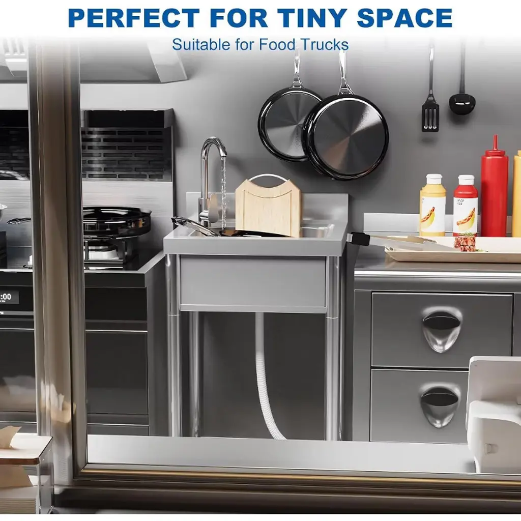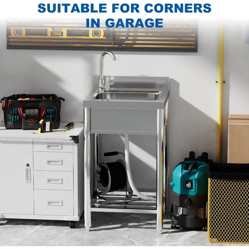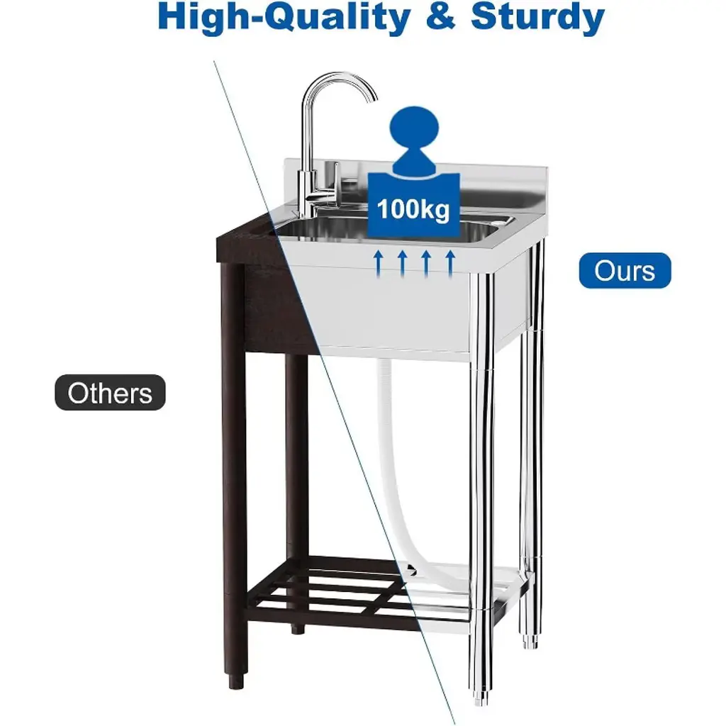 Acekool’s 21-inch stainless kitchen sink is a versatile choice for kitchens, outdoor patios, laundry rooms, or restaurants. The large basin gives you plenty of room to tackle dishwashing, food prep, or hand-washing clothes. The 360° rotating faucet helps rinse every corner, while hot and cold water supply options make it useful year-round. A roomy top rack and shelves underneath increase your organization options, with dedicated slots for knives and space for storage bins or appliances to help maximize kitchen efficiency. Designed for easy assembly, each part is marked and explained in the instructions, so you can set up the sink with minimal time or hassle. The smooth stainless surface wipes clean with just water and soap, making maintenance easier. With generous dimensions, this sink fits well in both home and commercial spaces where you need reliable washing and storage.