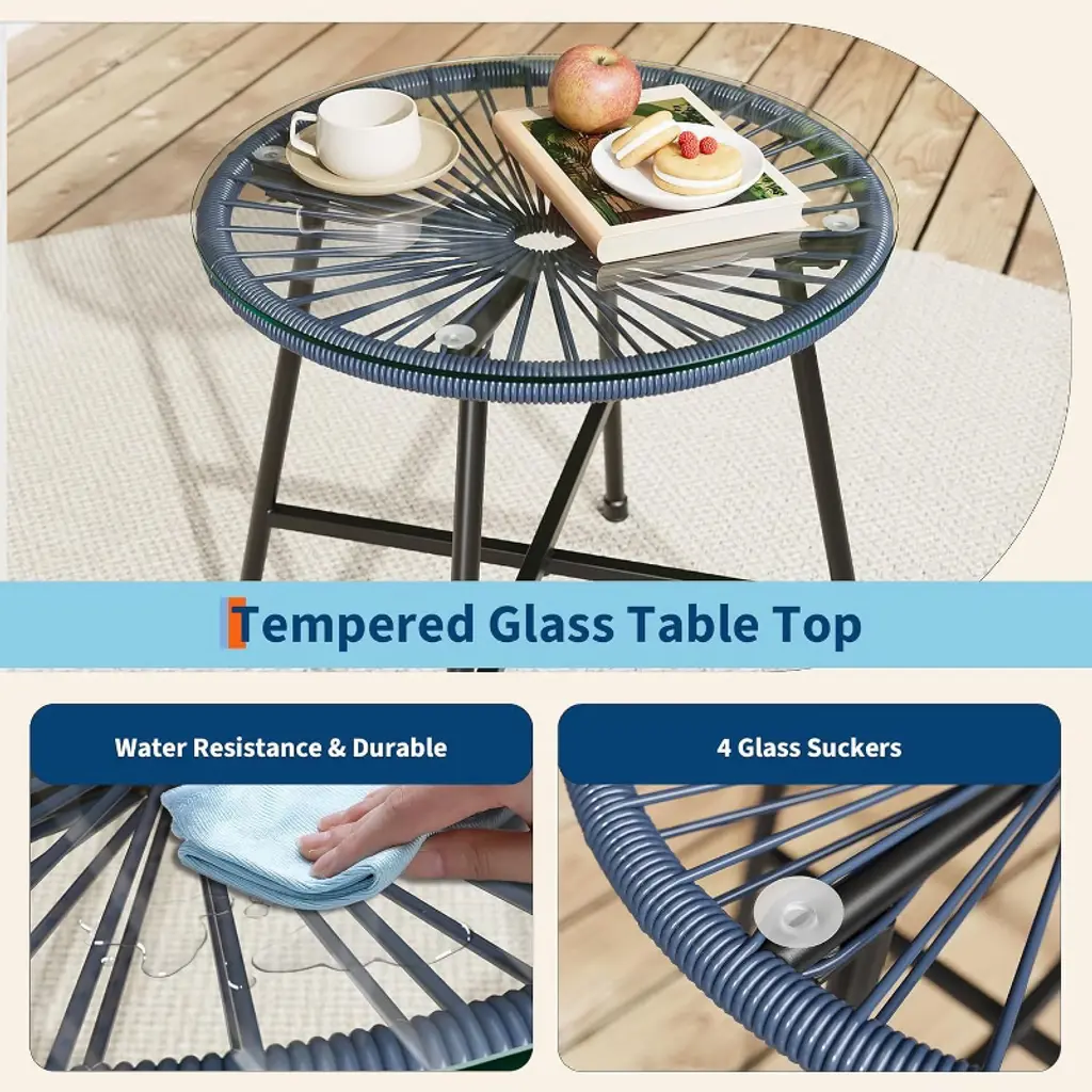 Acekool 3-piece Outdoor Acapulco Patio Bistro Set,cushioned Chairs & Glass Top Table, All-weather Blue Chairs For Balcony, Pool, Garden, Backyard