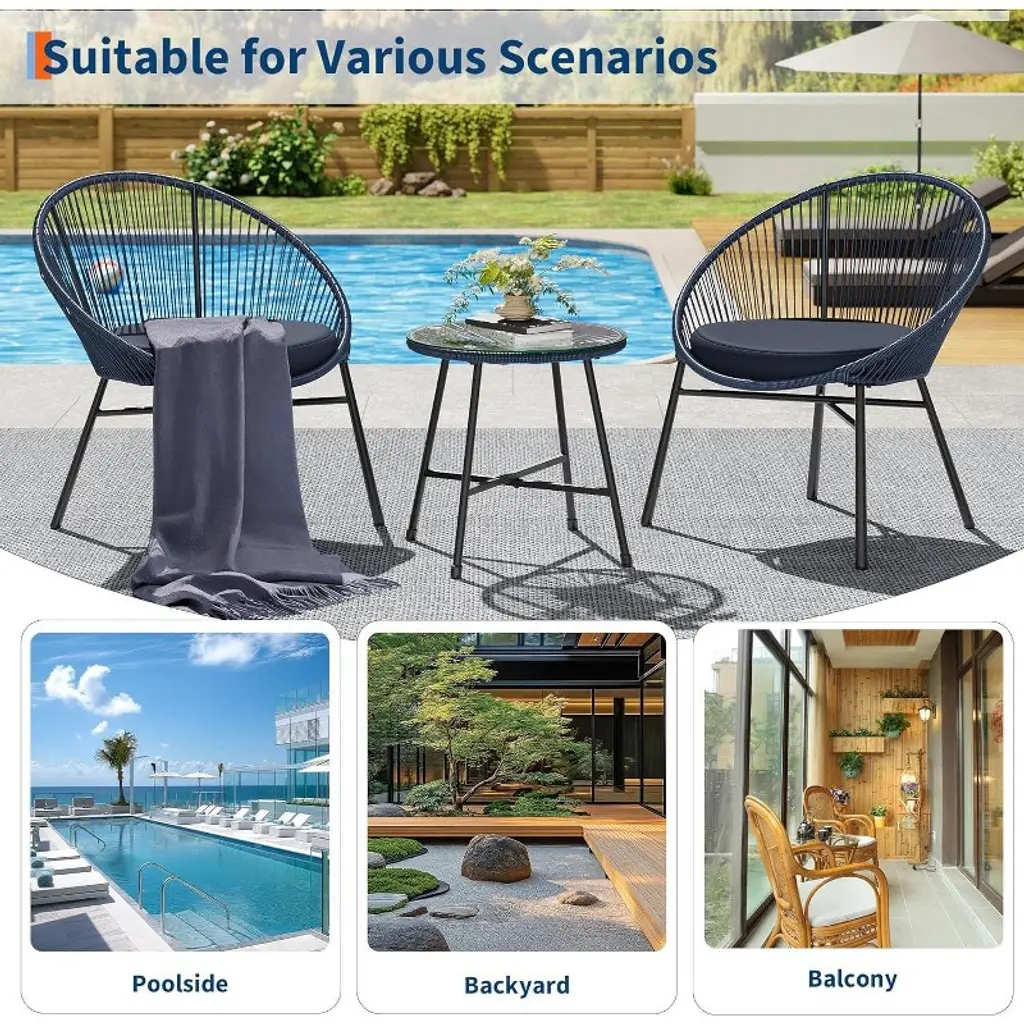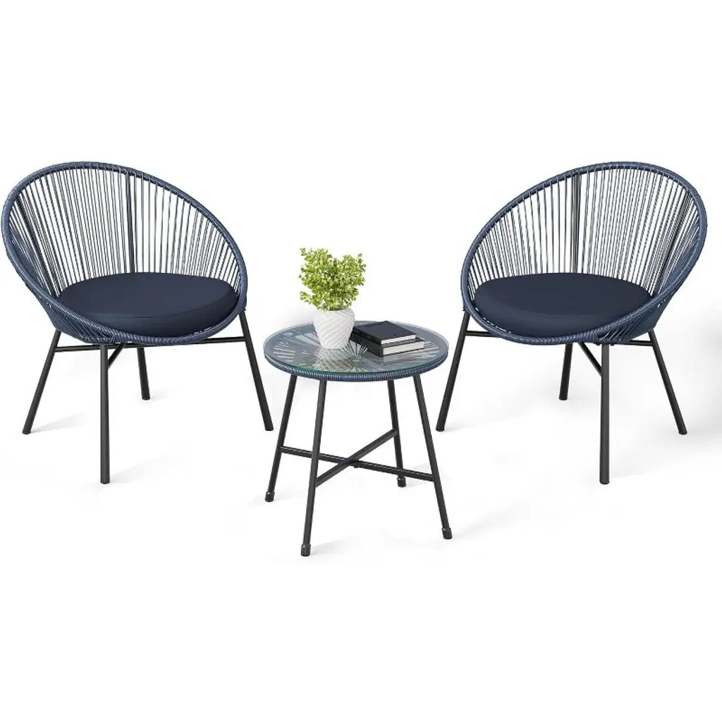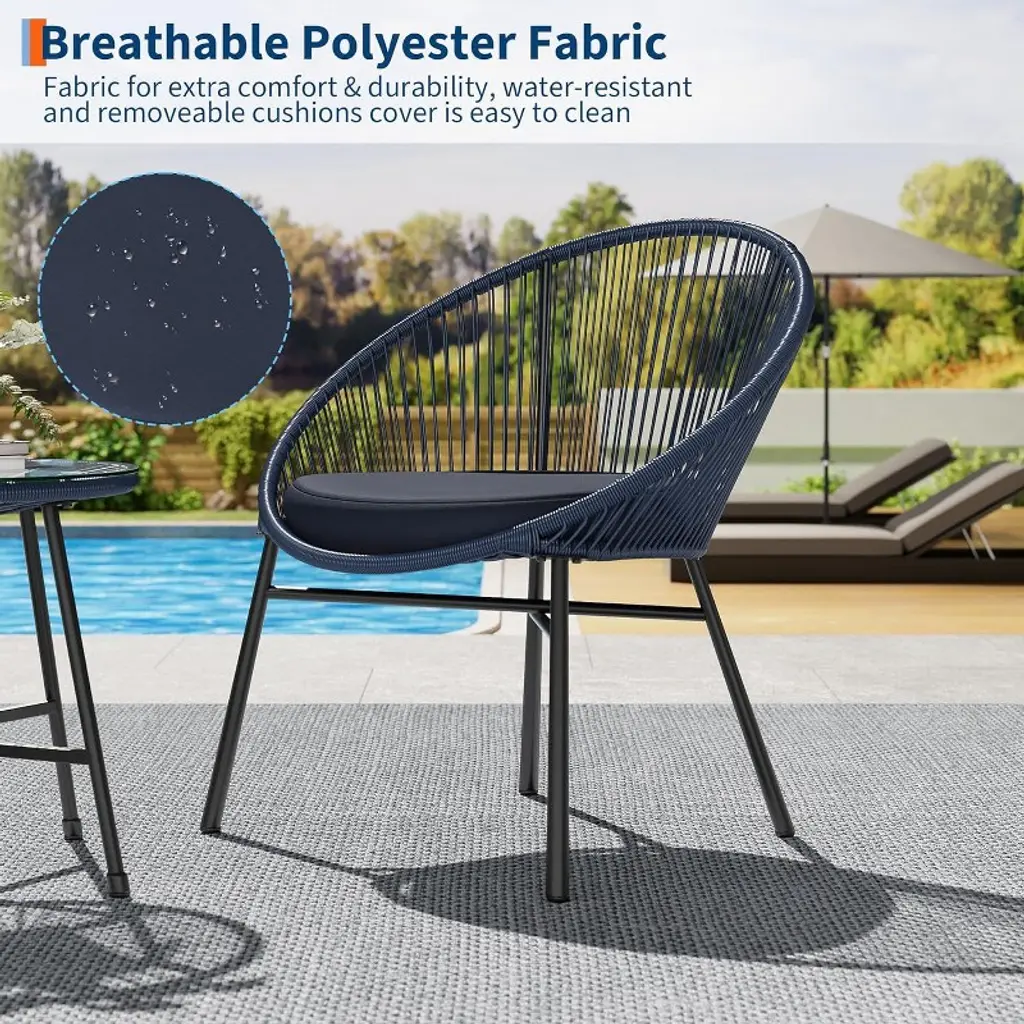 The Acekool 3-Piece Outdoor Acapulco Patio Bistro Set brings together iconic style and comfort for your outdoor living areas. This set features two powder-coated steel framed chairs with handwoven elastic ropes that deliver a breathable and supportive seat. The round tempered glass top table adds a practical and stylish surface for drinks or decor. Designed to address both comfort and durability, these Acapulco chairs offer ergonomic support with their oval high-back design and flexible weaving. Thick cushions with removable, machine-washable covers provide cushioned comfort for long-lasting relaxation. The weather-resistant materials ensure that your furniture retains its look and performance through changing seasons. Perfect for small outdoor spaces such as balconies, poolside, or garden nooks, this lightweight and sturdy set is easy to assemble, allowing you to enjoy your outdoor retreat quickly and effortlessly. Specifications: Set Includes: 2 Acapulco Chairs with Cushions, 1 Round Tempered Glass Table Frame: Powder-Coated Steel Seat: Handwoven Elastic Ropes Cushions: Thick, Removable, Machine-Washable Covers Color: Blue Ideal For: Balcony, Pool, Garden, Backyard