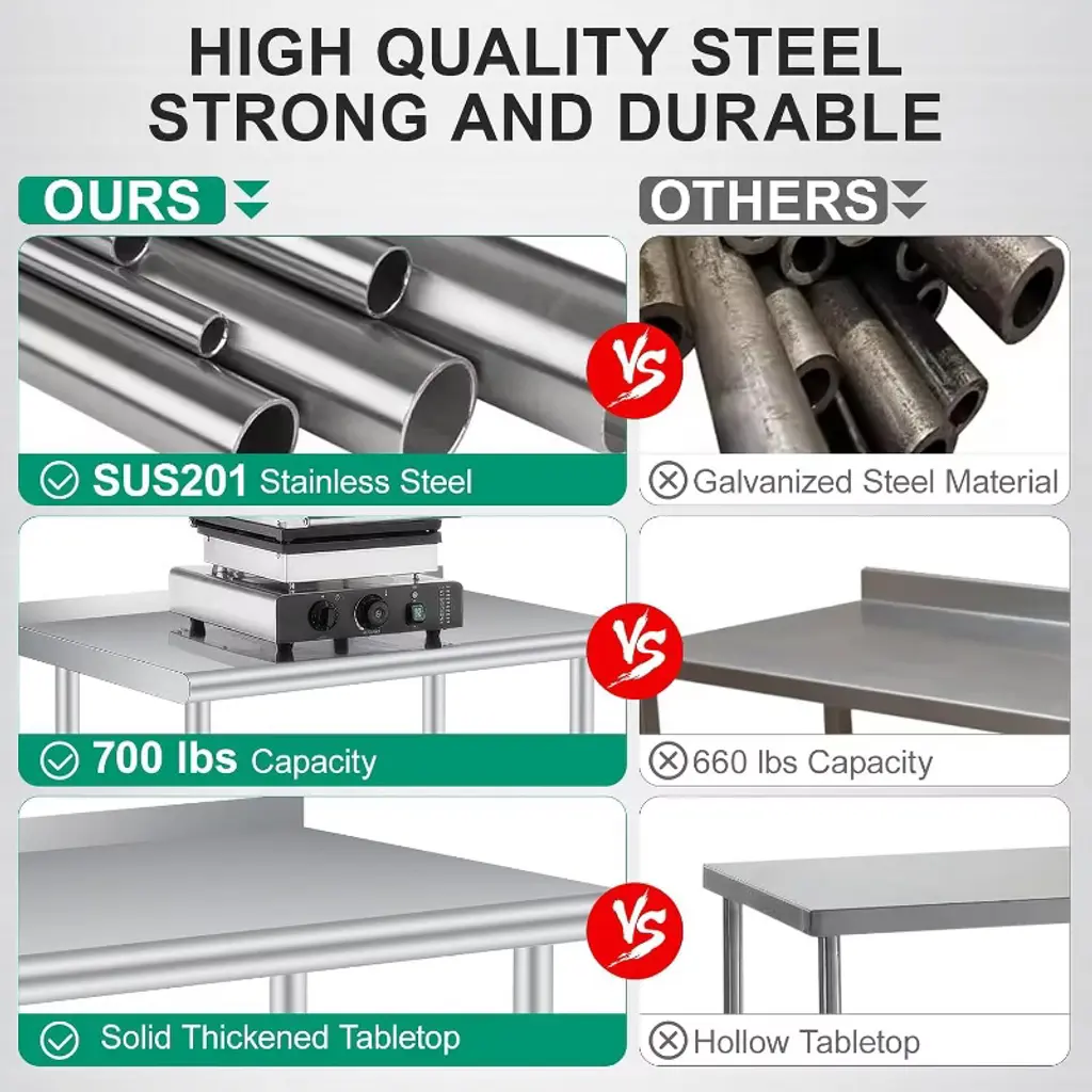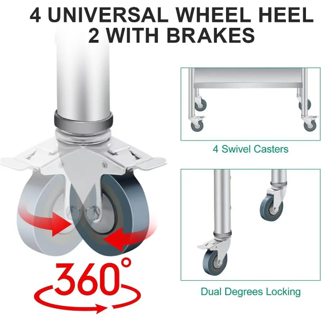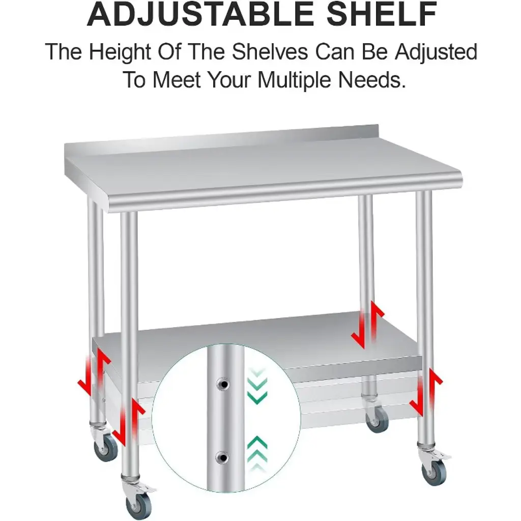 The Acekool 36" x 24" stainless steel prep table is designed to provide a reliable and efficient workspace for kitchens, restaurants, or other professional environments. Its thick 0.8mm steel surface delivers a smooth, easy-to-clean workspace that meets food safety standards, perfect for preparing ingredients or organizing tools. This prep table focuses on practical features including rounded edges for safety and non-marking feet to protect floors. The adjustable undershelf offers three height settings, giving you extra storage space for heavy items or appliances. The table supports heavy loads, with up to 660 lbs on top and 440 lbs below, ensuring it holds up under demanding use. Measuring 36 inches wide and 24 inches deep, the table moves easily on four caster wheels, two of which lock to keep it steady. Simple assembly with pre-drilled holes and clear instructions allows you to set it up quickly and get to work without delay.