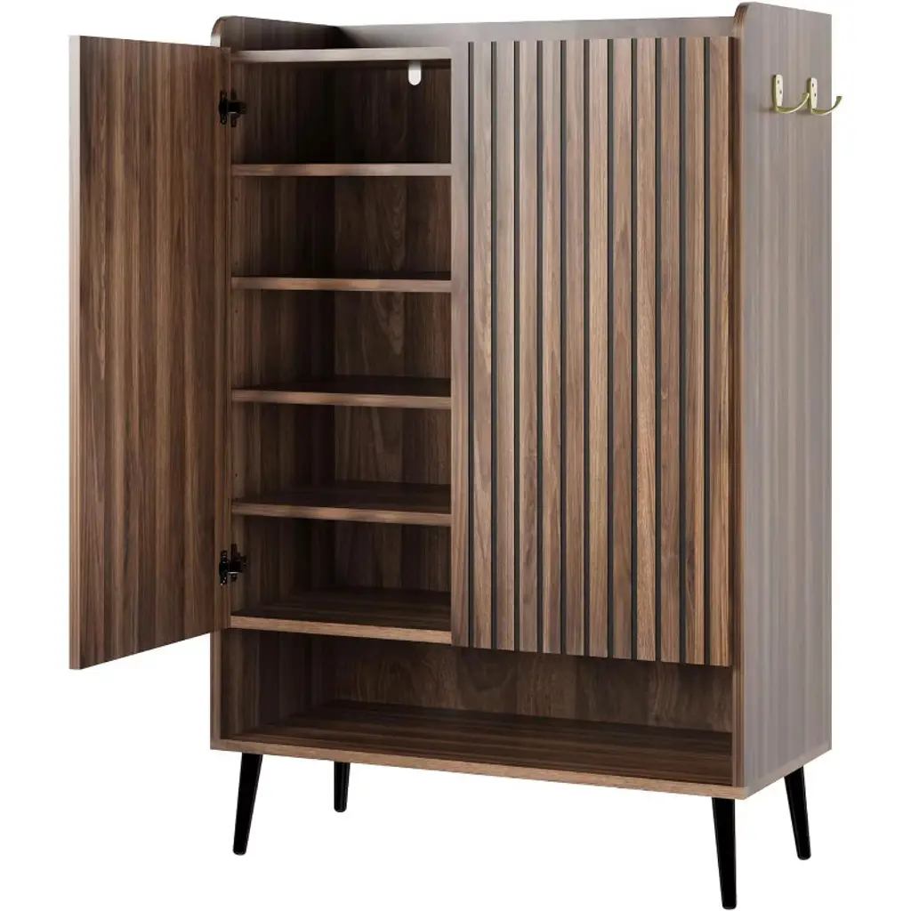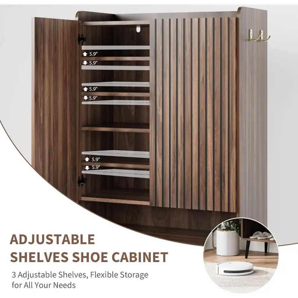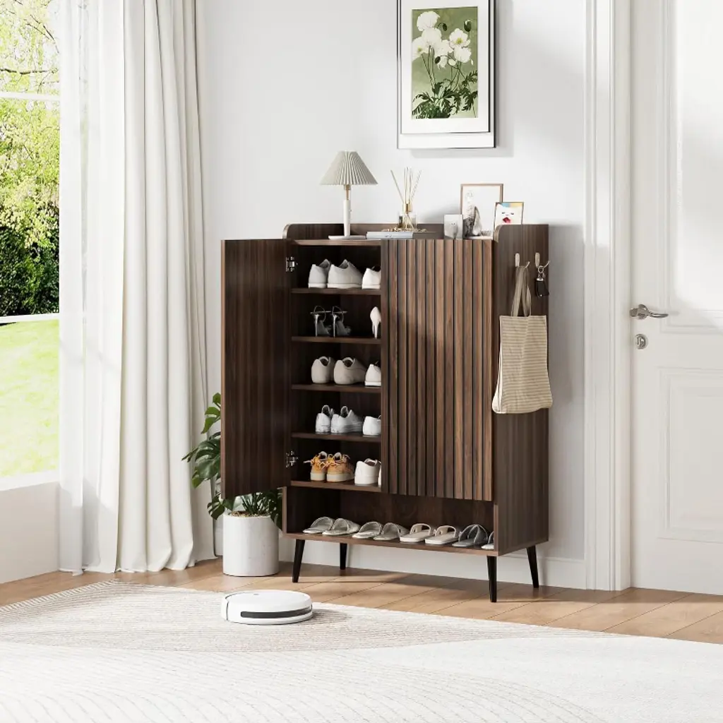 Upgrade your entryway with the Acekool 6-Tier Shoe Storage Cabinet, designed for homes that need both style and capacity. This spacious cabinet features multiple shelves, a tall section for boots, and a bottom open tier, providing ample room for over 30 pairs of shoes while keeping your area organized. The handleless front and raised edge doors create a modern, minimalist appearance that suits contemporary home styles. Rounded corners add an extra layer of safety—ideal for families with children or older adults. Additional built-in metal hooks offer a dedicated place for hanging keys, bags, or umbrellas, helping you keep other daily essentials close at hand. Made with 15 mm MDF panels and stable wood legs, the cabinet is built for everyday use. The elevated base gives room for robot vacuums to clean underneath, making upkeep easy. Bring home a smart, stylish shoe organizer that meets the demands of busy households and maintains a clean, modern look.