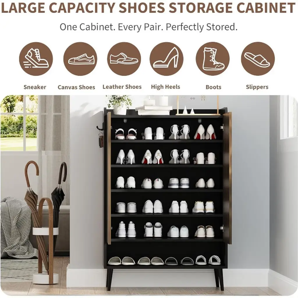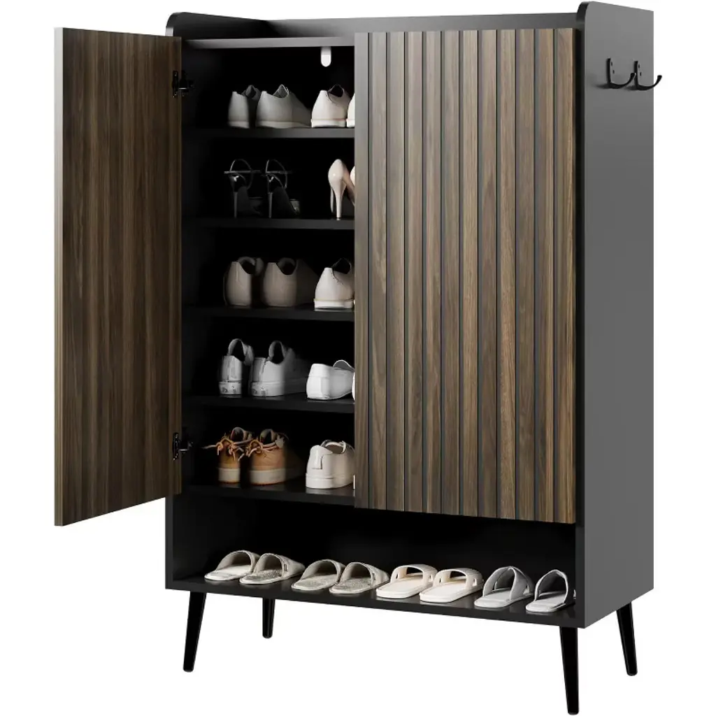 Acekool 6-tier Shoe Storage Cabinet, Black Body With Dark Walnut Doors