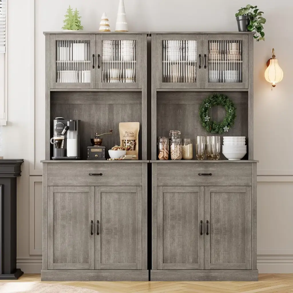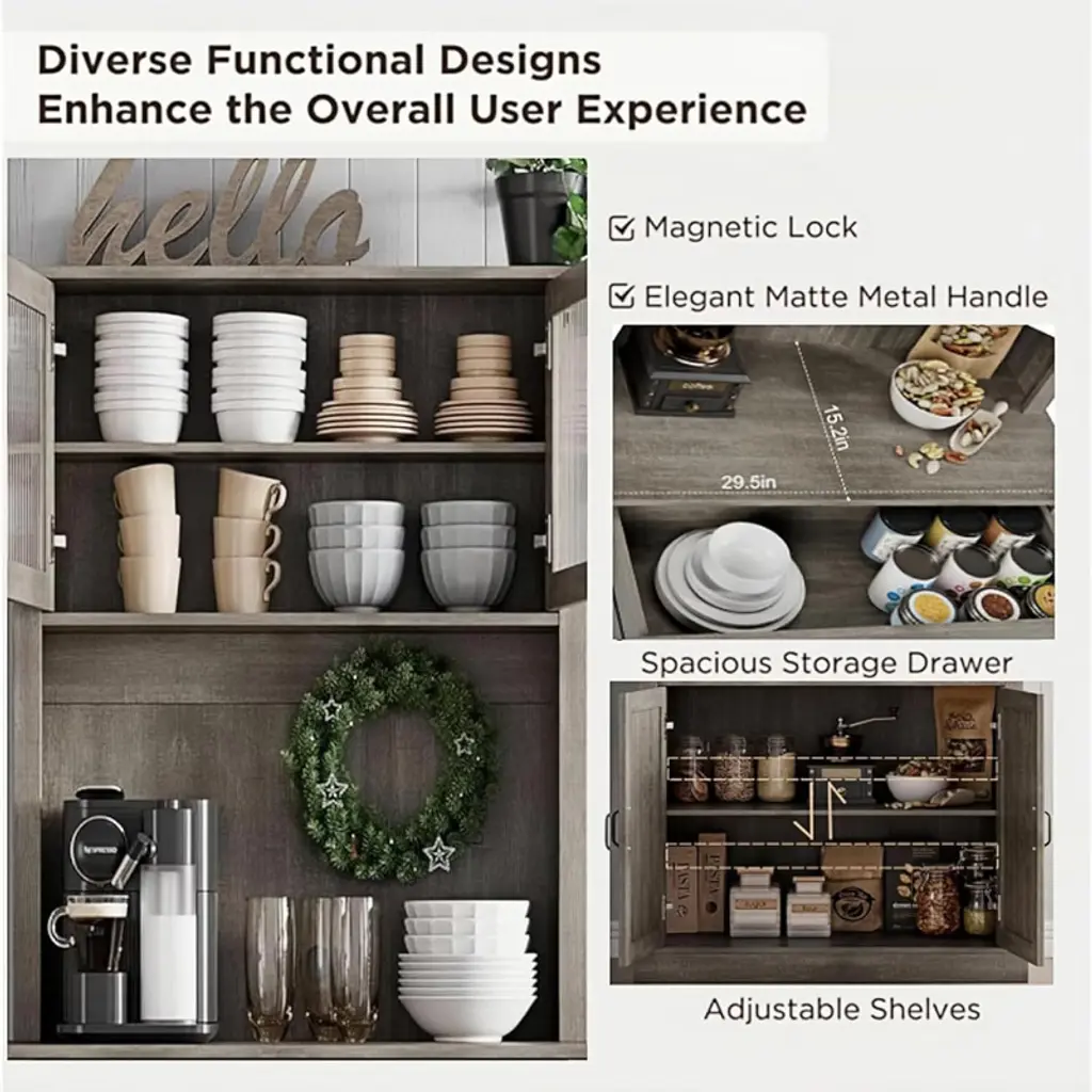 The Acekool 71" Kitchen Pantry Cabinet offers a practical and stylish solution for organizing your kitchen or dining space. Available in white or gray, this tall cabinet features a mix of glass-door display shelves, enclosed storage, and a microwave-friendly design to keep your essentials accessible and your space clutter-free. Key highlights include adjustable shelves for customizable storage, a dedicated area for small appliances with hidden cord management, and anti-tip hardware for added safety. The versatile layout works as a pantry, buffet, or coffee station, adapting to your home’s needs. Neutral colors and clean lines ensure it blends seamlessly into any room’s aesthetic. Specifications: Height: 71" Color Options: White, Gray Features: Glass doors, adjustable shelves, appliance space, anti-tip hardware Use Cases: Kitchen storage, dining room buffet, coffee bar, living room organizer