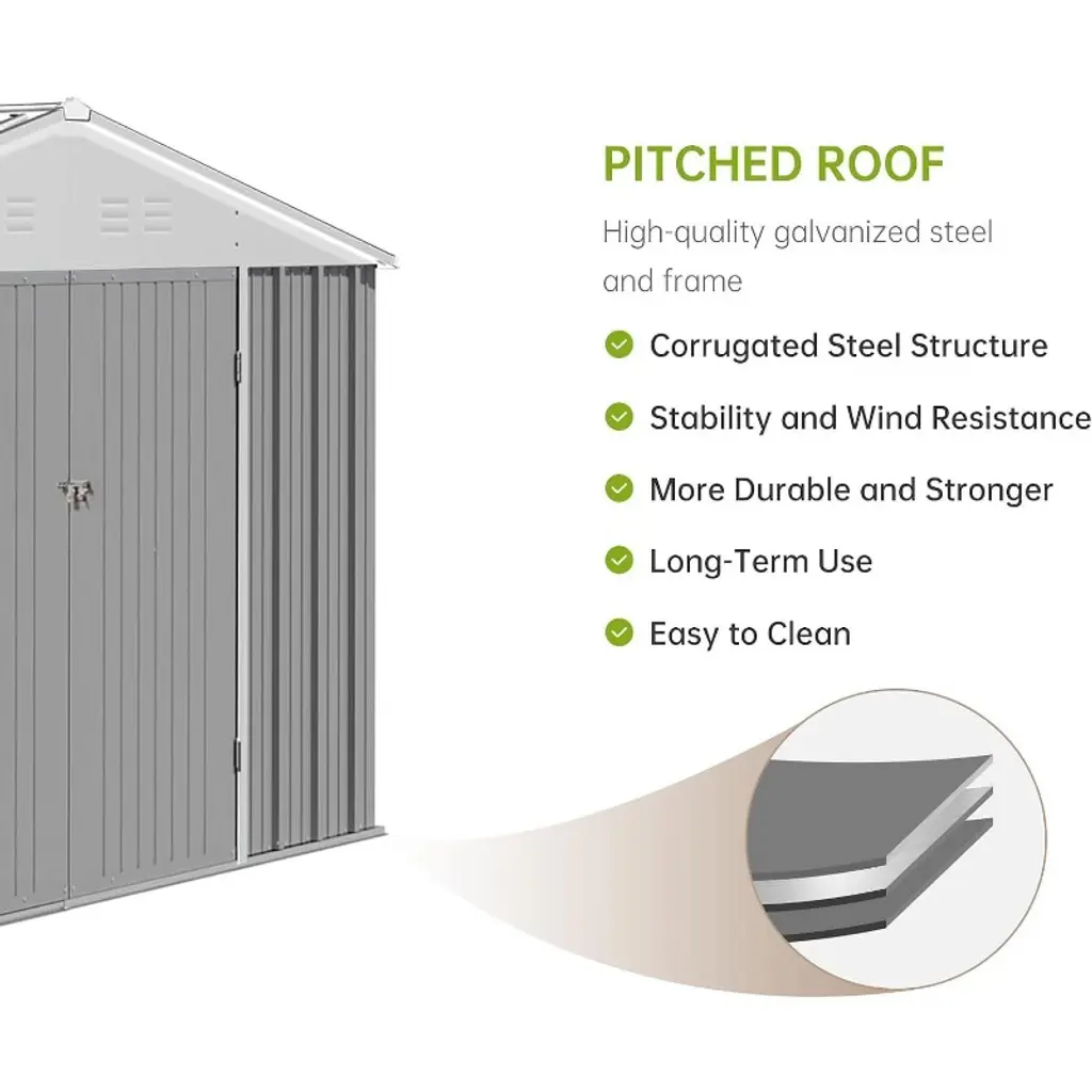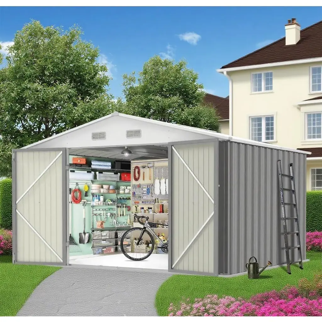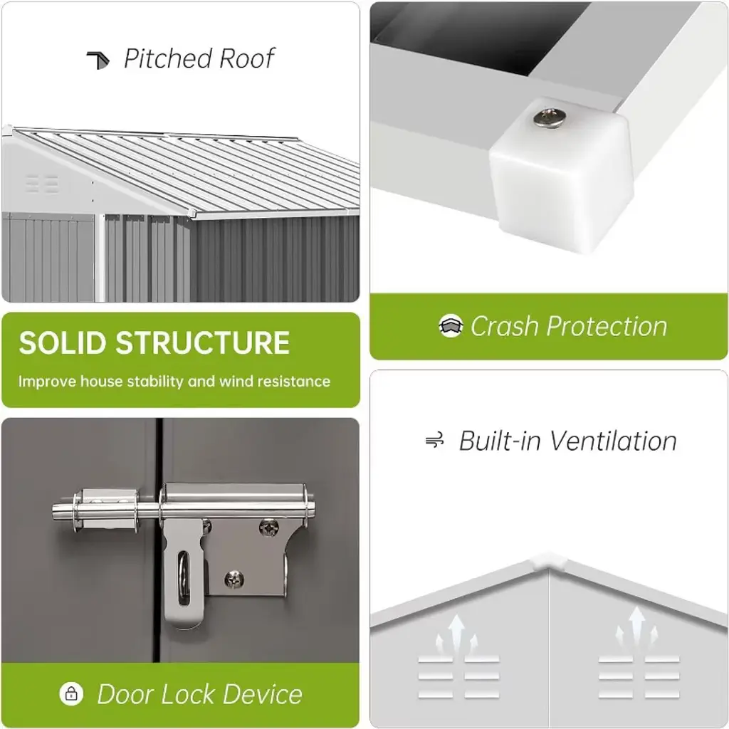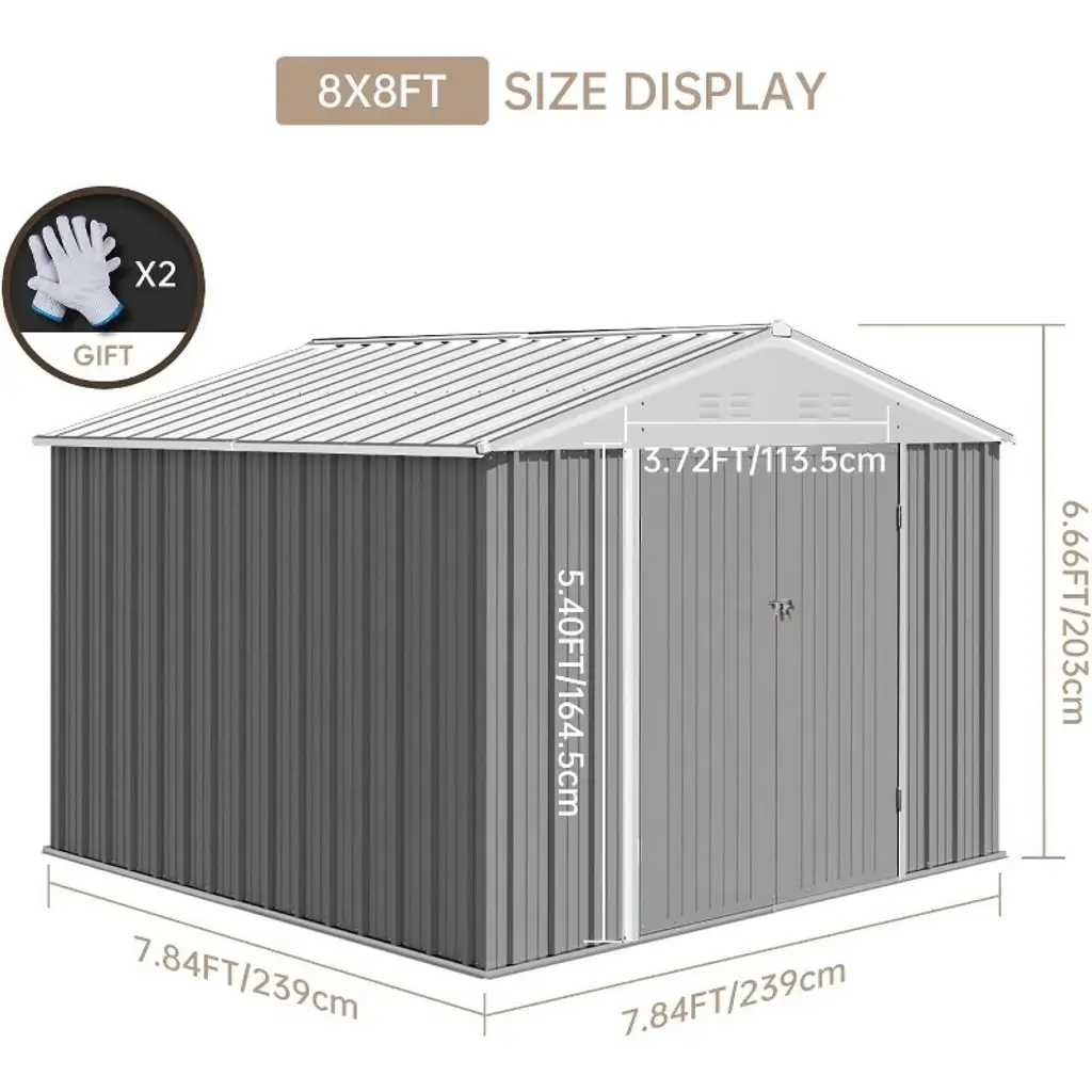 Upgrade your outdoor storage with the Acekool 8x8 ft Metal Outdoor Storage Shed. Designed for efficiency and style, this shed is a smart solution for keeping your tools, equipment, lawn supplies, and bikes organized and accessible. Its compact footprint fits well in most gardens, patios, or backyard spaces, while still offering a spacious interior to maximize storage and reduce outdoor clutter. This shed delivers reliable protection and convenience thanks to a galvanized steel frame that stands up well to changing weather and daily use. Lockable double doors let you easily access or secure your belongings, while built-in vents support airflow to keep stored items fresh and dry. The sloped roof ensures rainwater runs off quickly, so your tools and gear stay protected with less maintenance required. Inside, a storage rack lets you hang and organize smaller items for easy access. The shed arrives in two packages, with all parts pre-cut, pre-drilled, and labeled for simple step-by-step assembly. It is recommended to assemble with two or more adults on a level foundation to achieve the best stability. Shed dimensions are 7.84' L x 7.84' W x 6.66' H, with door size of 3.72' L x 5.40' H. The versatile grey finish blends seamlessly with outdoor décor. This shed is an excellent choice for anyone looking to create functional, tidy storage zones and improve outdoor organization.