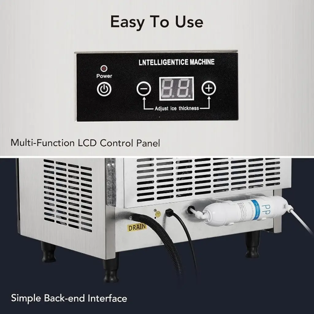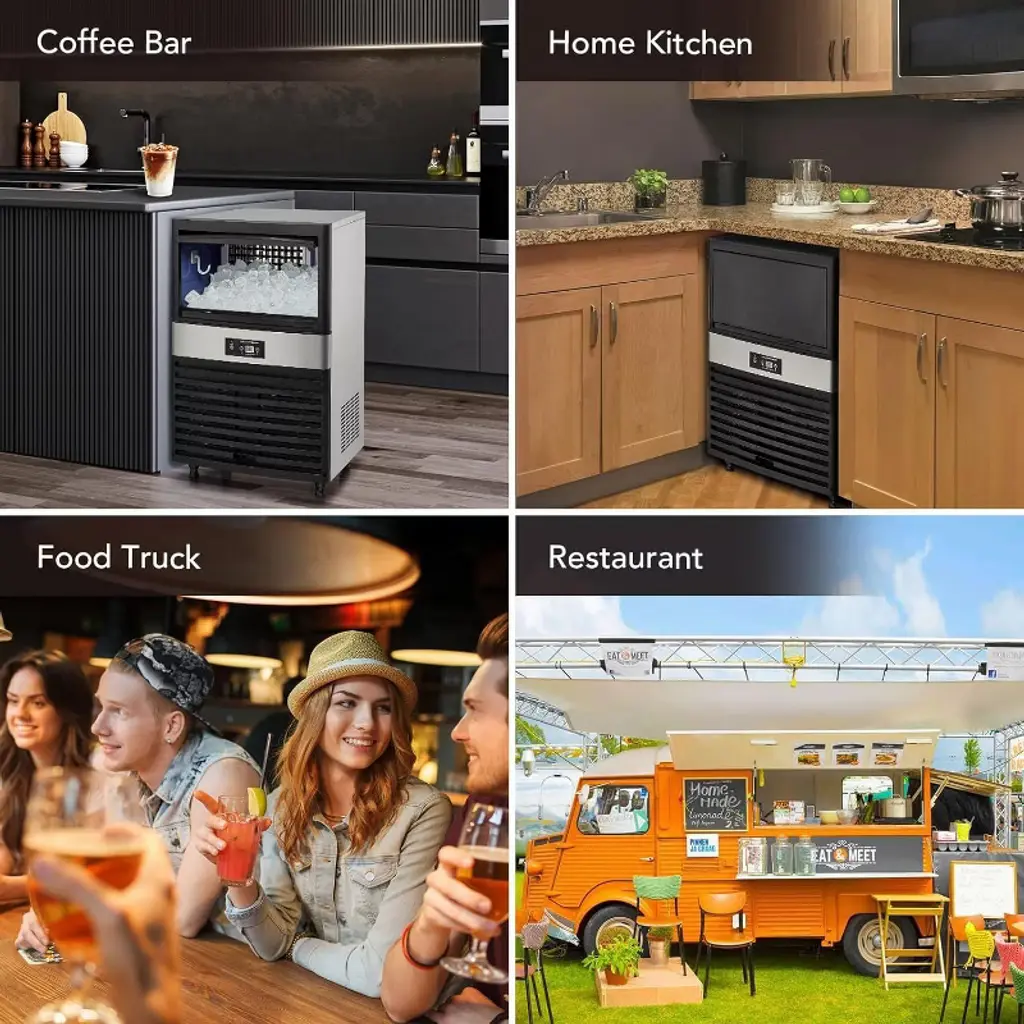 The Acekool Commercial Ice Maker is engineered to deliver reliable performance with a daily ice production of 130 pounds. Its compact undercounter design fits seamlessly into various environments, from home kitchens to busy bars and restaurants. The spacious 33-pound storage bin with spill prevention guarantees a steady supply of ice, reducing interruptions during peak service. Designed for ease of use, the LED control panel allows adjustment of ice thickness across six settings including crushed ice—all with quick cycle times. Quiet operation at 55dB ensures it won’t disrupt your workspace or customer experience. Made from 304 stainless steel with a mirror finish, this ice maker combines function and style. The package includes all needed accessories, making installation and operation hassle-free. Dimensions & Specifications: Unit Size: 19" W x 18" D x 31" H Daily Ice Output: 130 lbs Storage Capacity: 33 lbs Ice Cube Size: 5 x 9 Noise Level: 55 dB Includes: Reinforced water hose, ice scoop, anti-vibration feet, installation guide