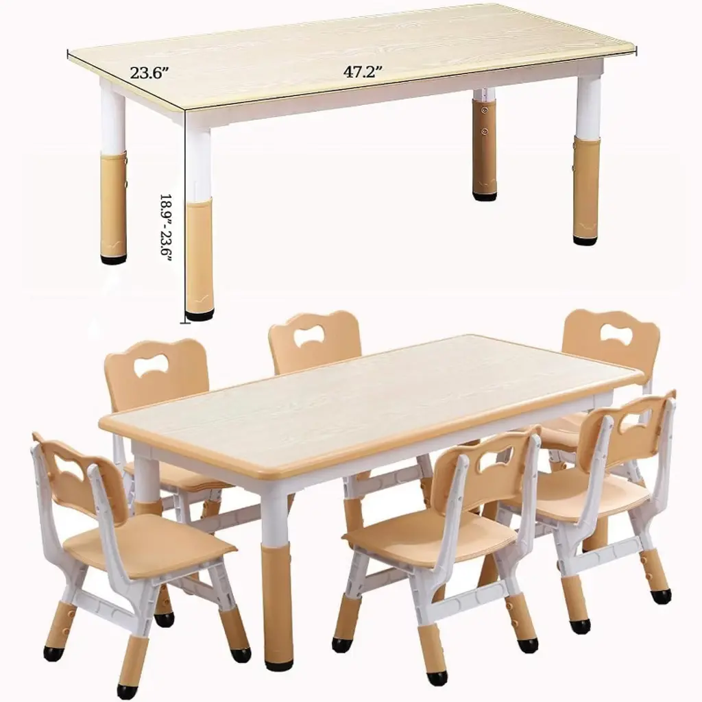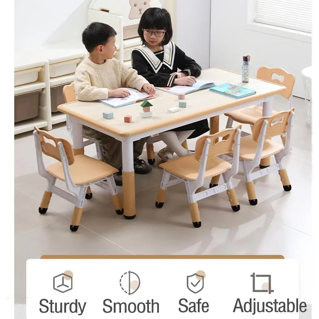 Acekool Kids Table and 6 Chairs Set brings a fun, adaptable place for group activities, creative play, and daily routines to your classroom, daycare, or family space. The roomy, height-adjustable table and six matching chairs provide plenty of seating for collaborative learning, crafting, meals, and games, making it easy for kids ages 2–10 to join in any activity. Ergonomically designed chairs offer gentle back support and proper seating, while non-slip seats and secure feet help kids stay safe, even on wood or tile floors. The graffiti desktop invites endless creativity, giving children freedom to draw, write, and imagine while adults enjoy quick cleanup. Table height adjusts from 18.9" to 23.6" and supports up to 300 lbs. Each chair offers an adjustable seat height (10.6"–12.2") and holds up to 200 lbs, making the set comfortable as kids get bigger. Available in wood or green finishes to brighten any learning or play area, and quick assembly means it’s ready to use in minutes.