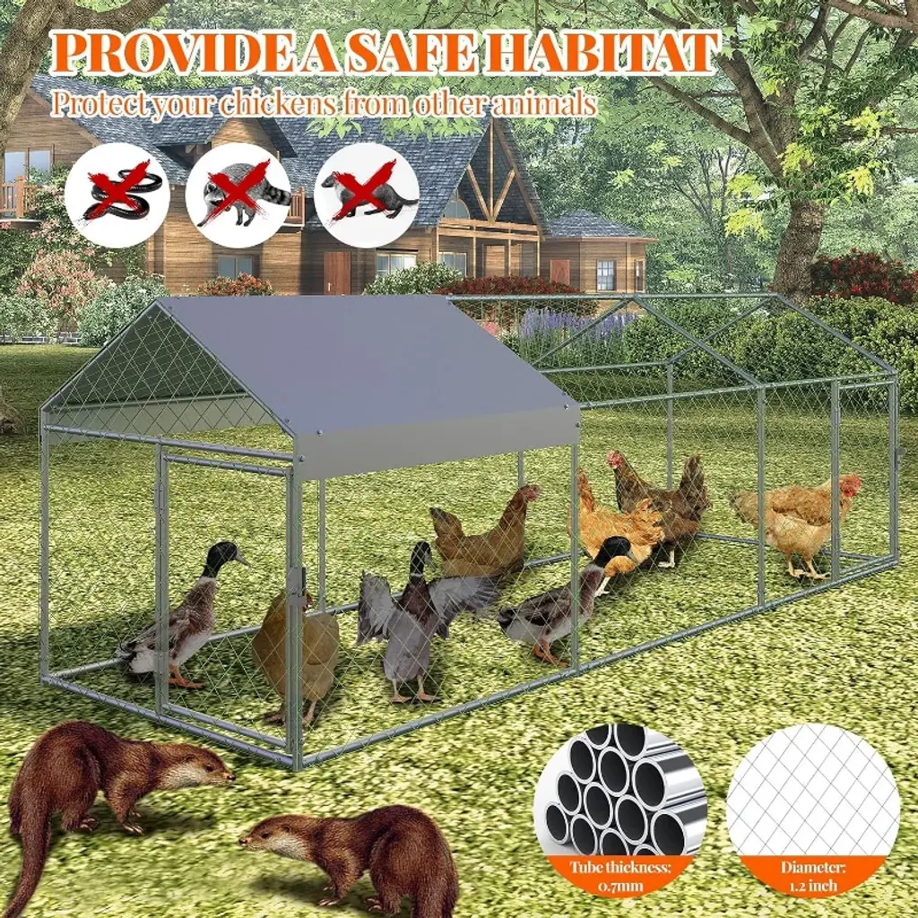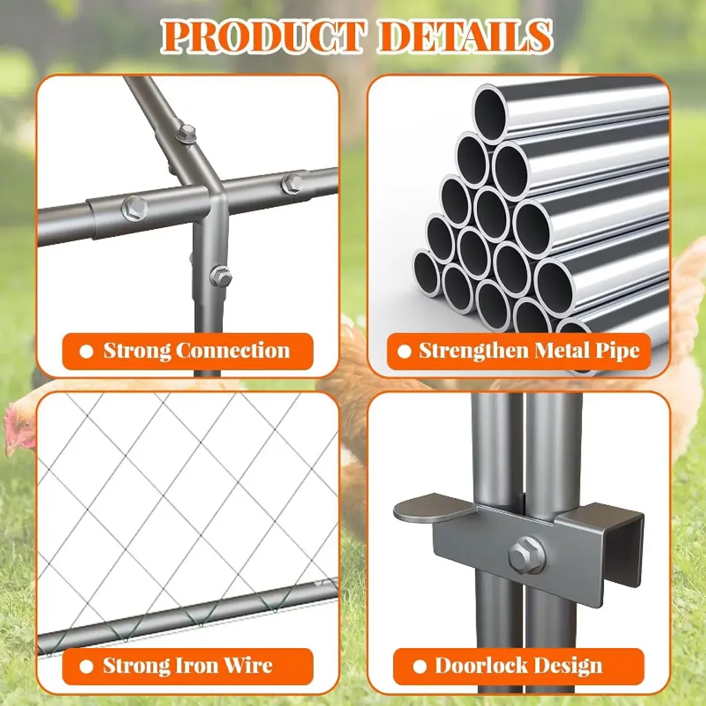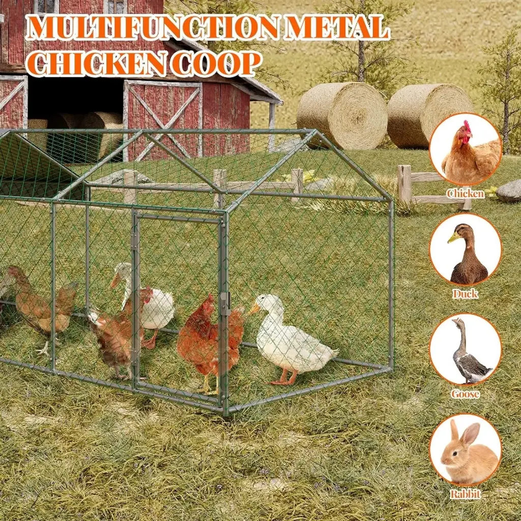 Description: The Acekool Large Metal Chicken Coop offers a reliable and spacious solution for backyard poultry keeping. Designed with a reinforced metal frame and PVC-coated wire mesh, it provides a safe and weather-resistant haven for chickens, ducks, rabbits, and other small pets. Its generous 120"x40"x40" size gives animals plenty of space to roam while staying protected from outside threats. Features: This walk-in enclosure features a lockable door to prevent entry by predators, while its sturdy build ensures long-lasting performance in outdoor environments. The attached waterproof and anti-UV canopy provides shade on sunny days and shelter from rain and snow. The sloped canopy design allows for efficient drainage, keeping the area dry and safe. Its multi-purpose design is suitable for a variety of small farm animals, making it a versatile addition to any garden or backyard. Specifications: Overall dimensions: 120"L x 40"W x 40"H Frame: Premium metal construction with PVC-coated wire mesh Canopy: Waterproof and anti-UV cover, sloped for good drainage Entry: Lockable door for easy access and added security Compatible animals: Chickens, ducks, geese, rabbits, and other small pets Assembly: Includes all parts and easy-to-follow instructions for quick setup