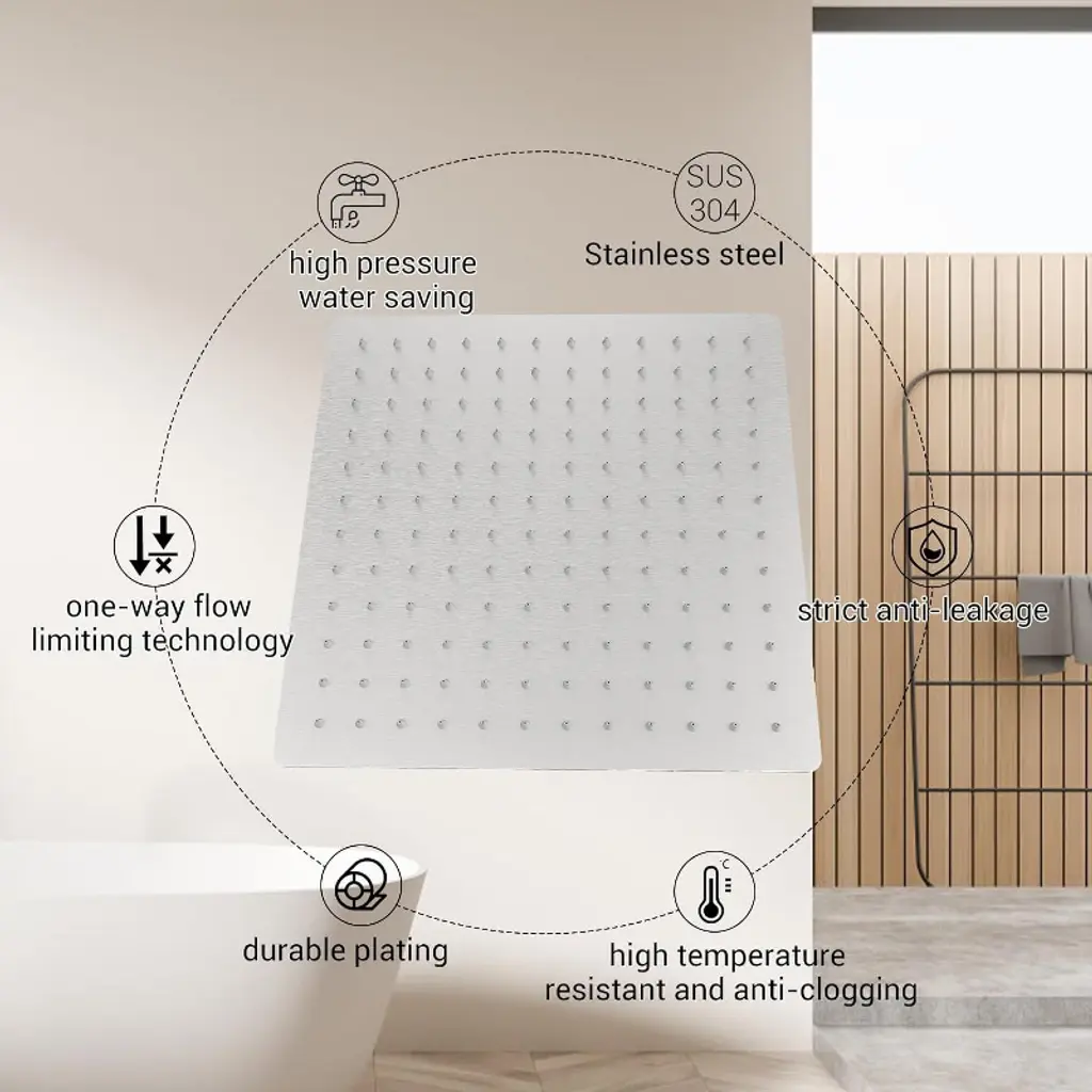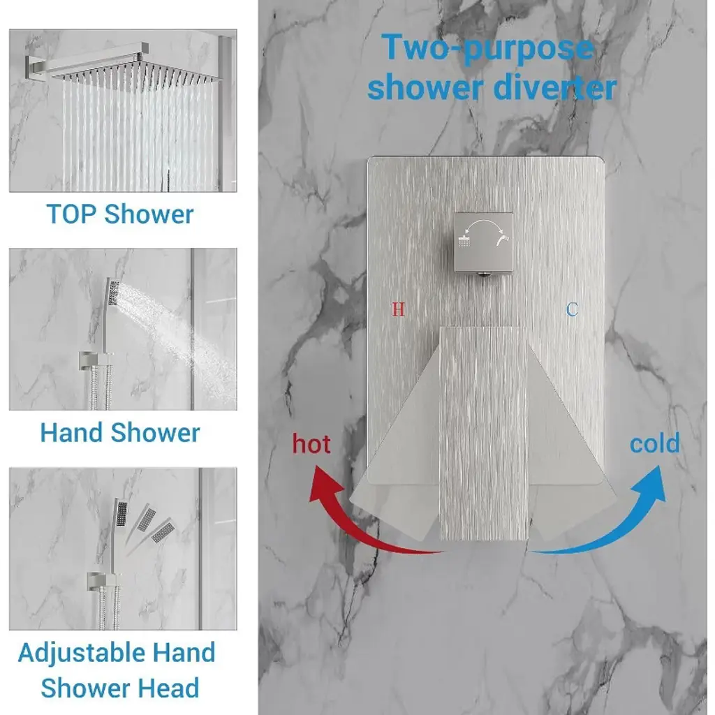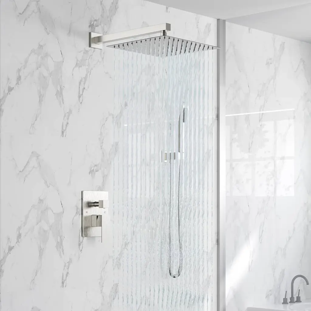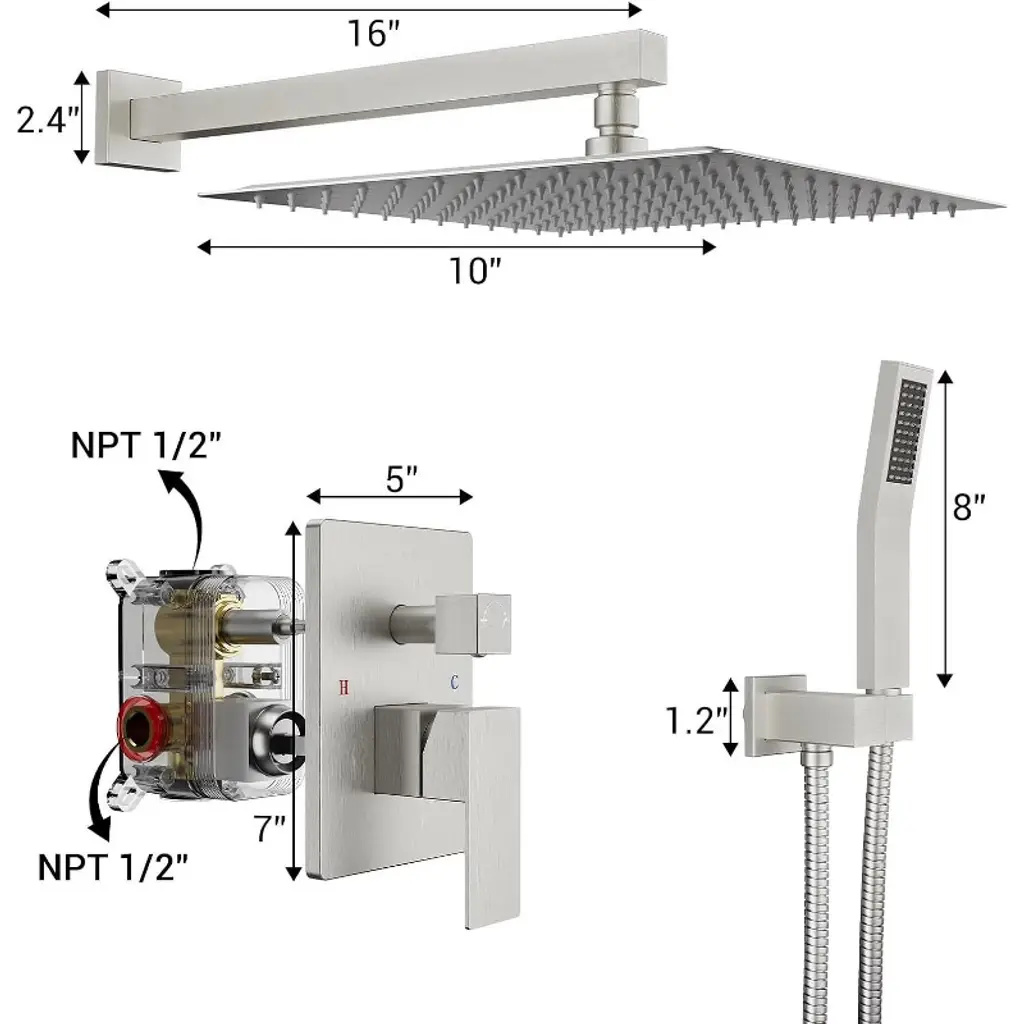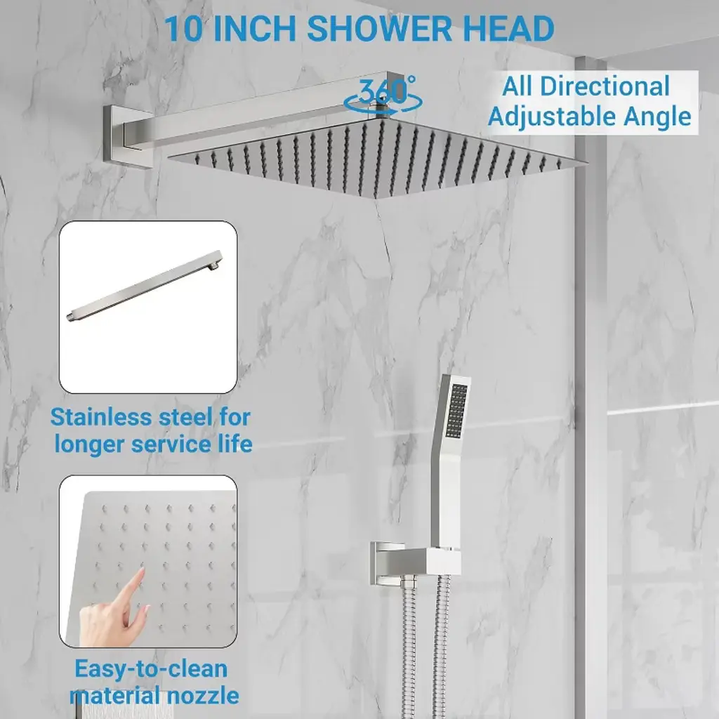 Description: Transform your daily shower into a revitalizing ritual with the Acekool Bathroom Shower Faucet Set. This complete combo includes a generous overhead rainfall showerhead (choose from 10 or 12 inches, square or round) alongside a versatile handheld sprayer. The built-in pressure balance valve maintains steady water temperature, protecting you from sharp temperature changes and offering safe, reliable comfort—ideal for households with children or older adults. Features: Each showerhead is engineered to deliver optimal water pressure, closely mimicking the soothing feel of natural rain. The user-friendly diverter allows instand switching between the overhead and handheld sprays. Flexible handheld function delivers precision for washing, rinsing, or cleaning. Crafted with durable stainless steel and copper components, this set offers strength and longevity, while the finish (brushed nickel or matte black) resists corrosion and adds a modern accent to any space. Simple installation is made possible with clear instructions and universal fit for standard US plumbing. Specifications: Shower Set: Rainfall overhead with handheld sprayer Head Sizes: 10 inch or 12 inch; Shapes: Square or Round Colors: Brushed Nickel, Matte Black Valve: Pressure balance for temperature safety Material: Stainless steel and copper construction Switch: Two-function diverter for overhead and handheld Installation: Concealed, with instructions included Application: Bathroom, shower renovation, modern upgrades