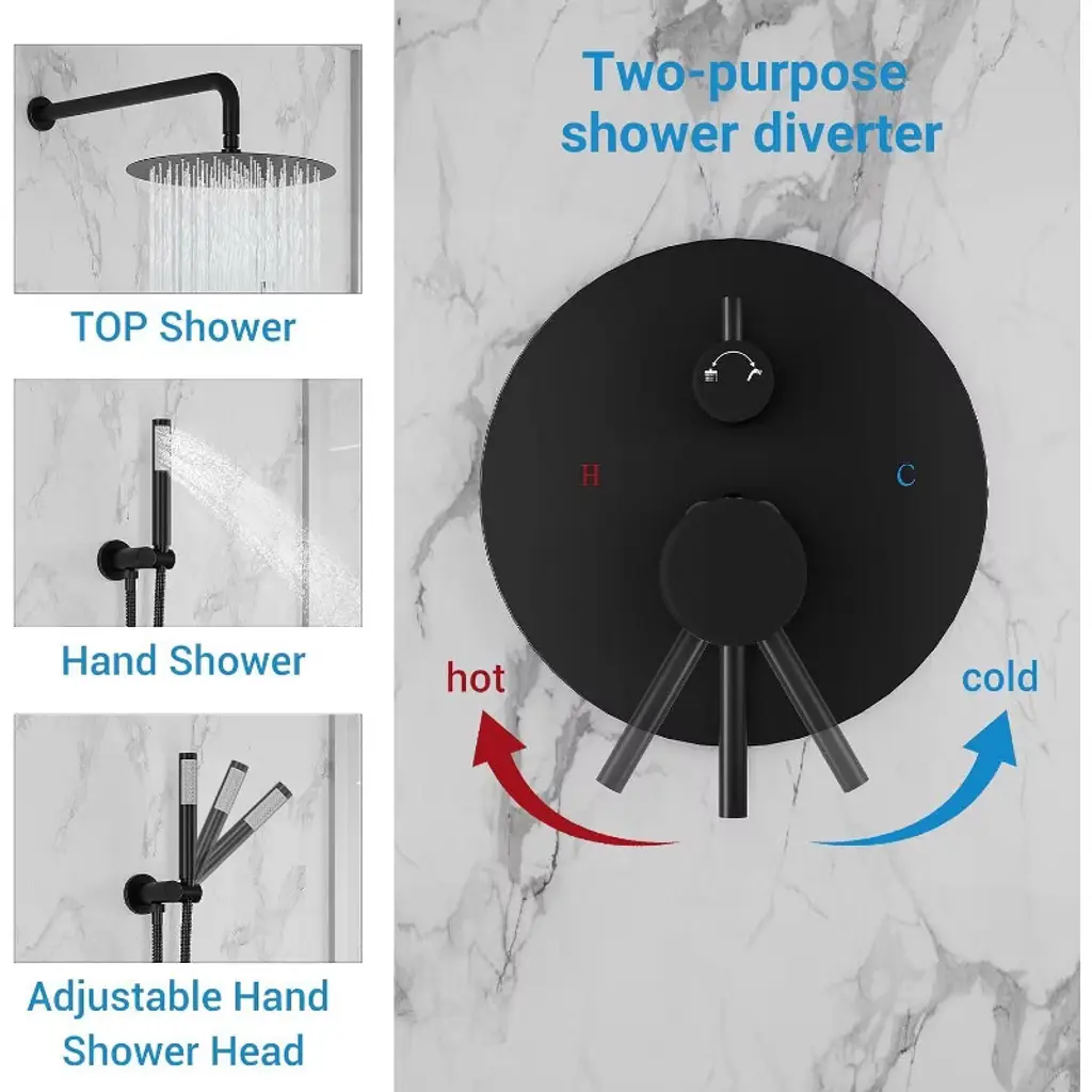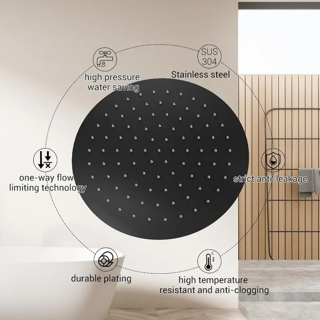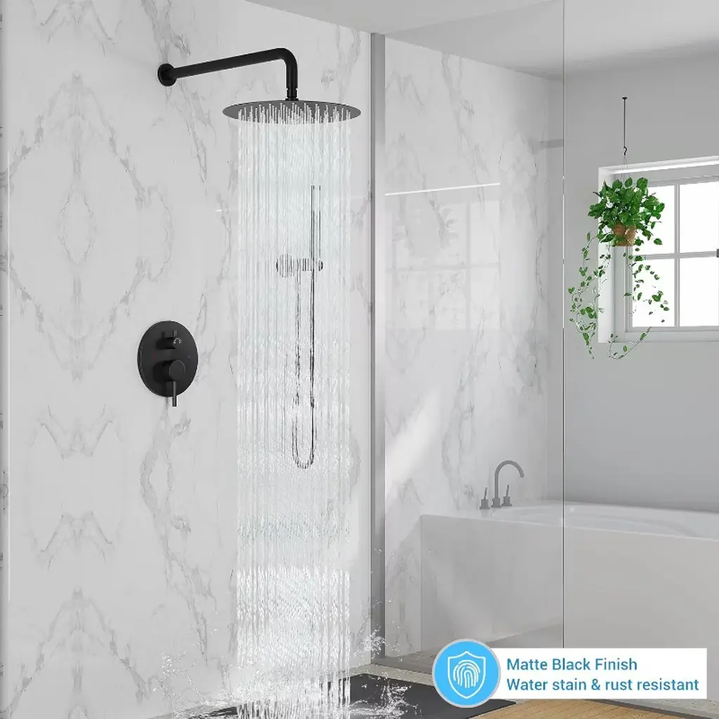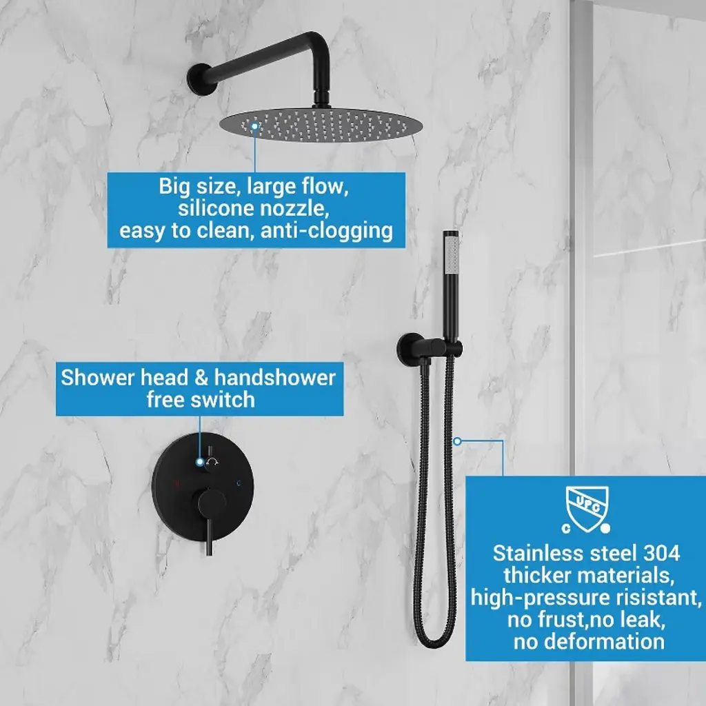 Description: Transform your daily shower into a revitalizing ritual with the Acekool Bathroom Shower Faucet Set. This complete combo includes a generous overhead rainfall showerhead (choose from 10 or 12 inches, square or round) alongside a versatile handheld sprayer. The built-in pressure balance valve maintains steady water temperature, protecting you from sharp temperature changes and offering safe, reliable comfort—ideal for households with children or older adults. Features: Each showerhead is engineered to deliver optimal water pressure, closely mimicking the soothing feel of natural rain. The user-friendly diverter allows instand switching between the overhead and handheld sprays. Flexible handheld function delivers precision for washing, rinsing, or cleaning. Crafted with durable stainless steel and copper components, this set offers strength and longevity, while the finish (brushed nickel or matte black) resists corrosion and adds a modern accent to any space. Simple installation is made possible with clear instructions and universal fit for standard US plumbing. Specifications: Shower Set: Rainfall overhead with handheld sprayer Head Sizes: 10 inch or 12 inch; Shapes: Square or Round Colors: Brushed Nickel, Matte Black Valve: Pressure balance for temperature safety Material: Stainless steel and copper construction Switch: Two-function diverter for overhead and handheld Installation: Concealed, with instructions included Application: Bathroom, shower renovation, modern upgrades