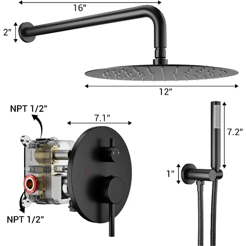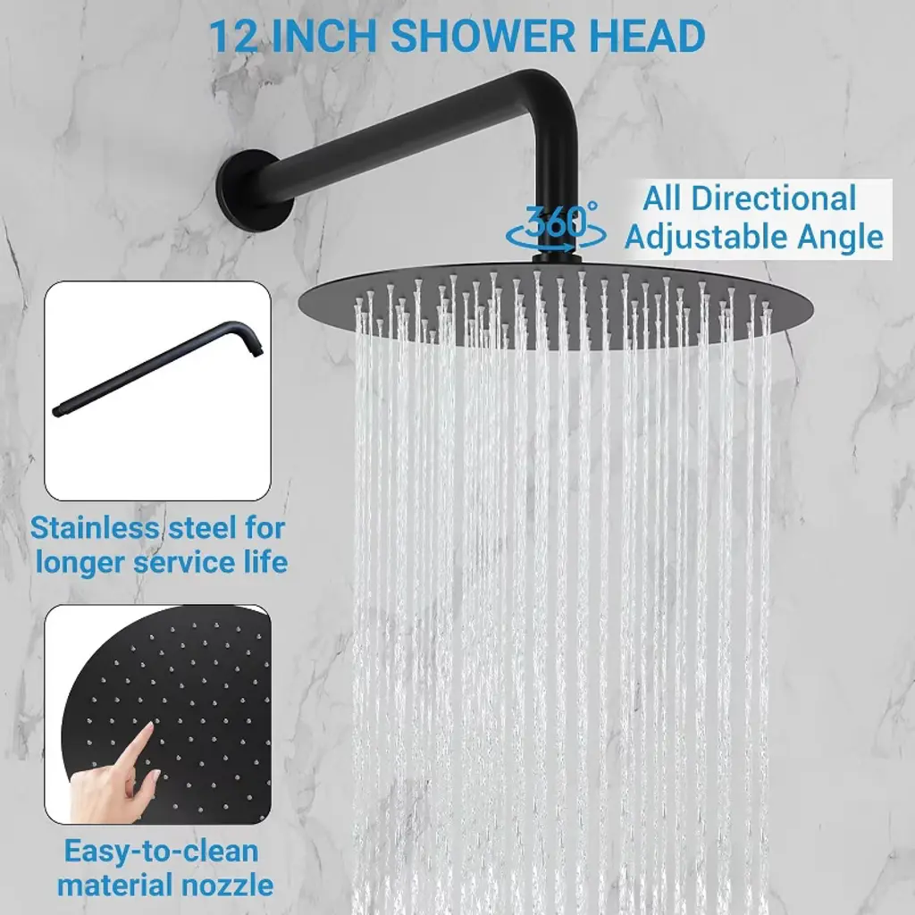 Acekool Shower Faucet Set With 12 Inch Round Rainfall Head & Handheld, Pressure Balance, Matte Black
