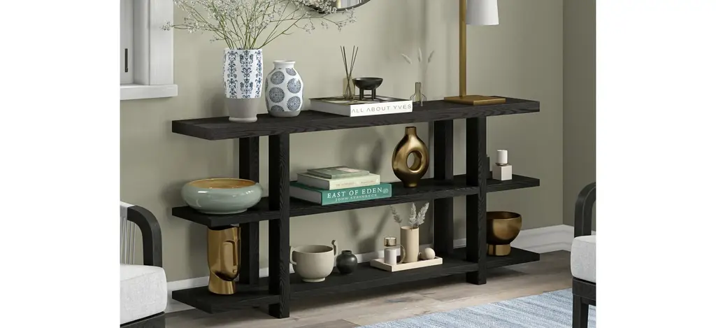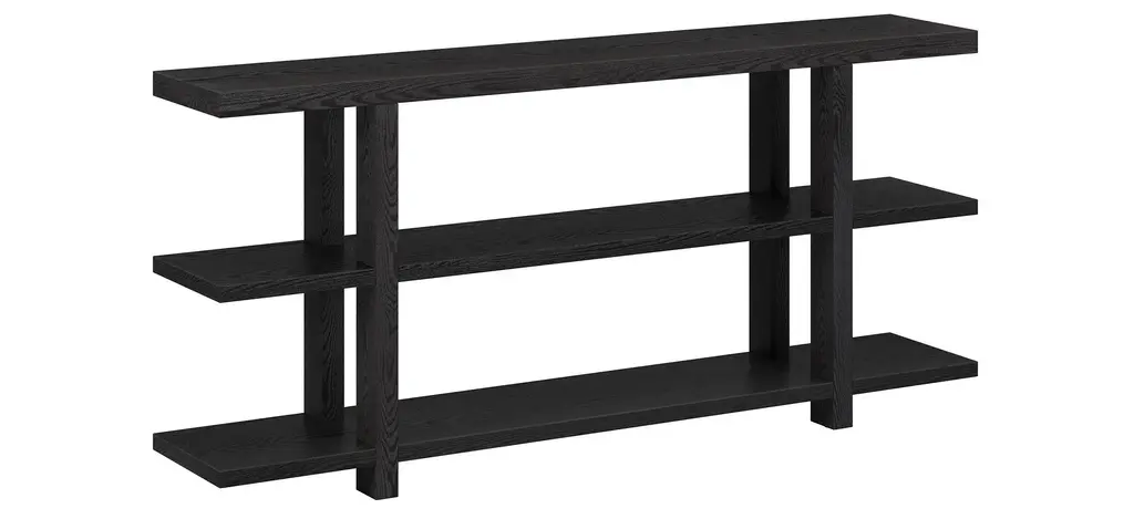 A bold linear profile sets this minimalist modern Acosta Console Table apart. Its inset frame echoes the cantilevered design of mid-century architecture, while the wood-look finish creates an artful backdrop for framed photos, flowers, or your favorite collections of decorative items. This clean, Parsons-style accent table can blend in or stand our wherever you need an extra bit of storage.