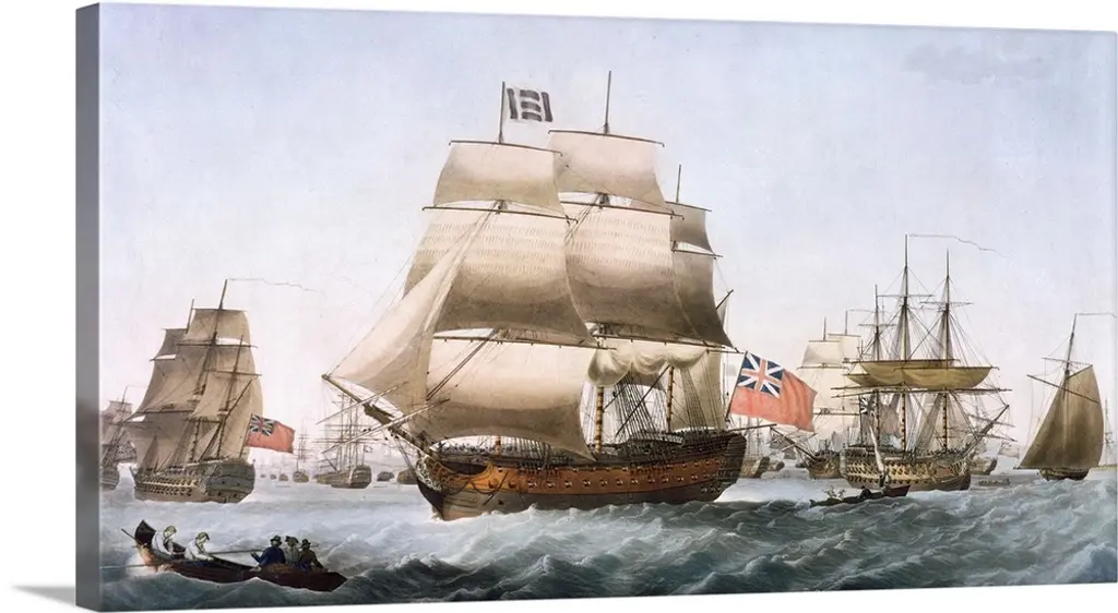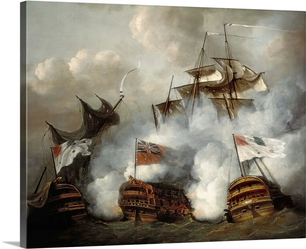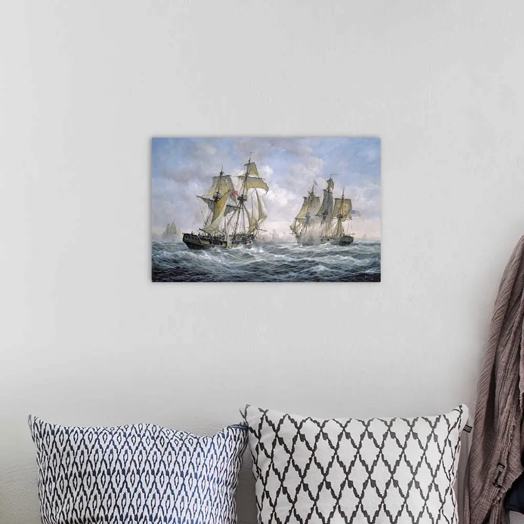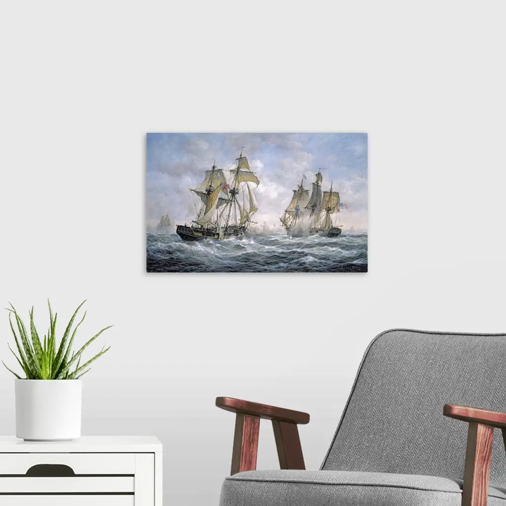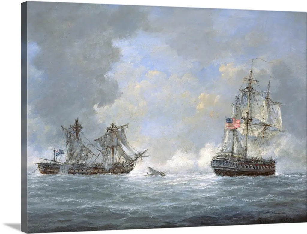 Large contemporary art portrays a battle between two warships belonging to the United States of America and Great Britain during a war in the early 19th century. Artist uses a lot of highlights and short brush strokes to help give the Atlantic Ocean an appearance of rough waters.