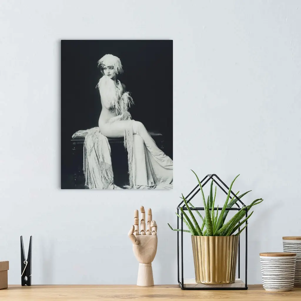 Actress and Ziegfeld girl Claudia Dell. Full length portrait of Dell nude and draped in feathers and cloth. Ziegfeld claimed to 'Glorify the American Girl.'.