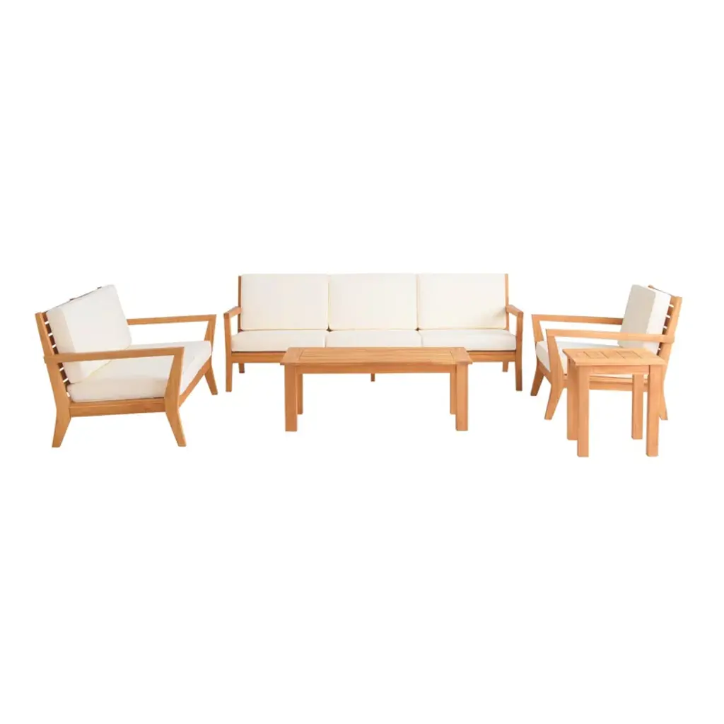 Made of sturdy teak grown in sustainable plantations, this welcoming outdoor bench makes it easy to enjoy your backyard with friends and family. A casual, comfortable loveseat that's perfect for two, this piece boasts solid craftsmanship and an understated modern design. The natural wood finish frames plush UV-resistant cushions in antique white that are great for outdoor use. A matching set is also available for purchase to completely revamp your outdoor space.