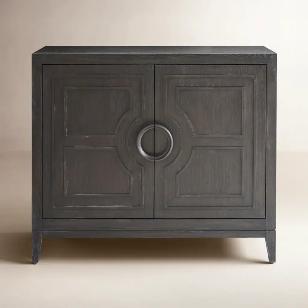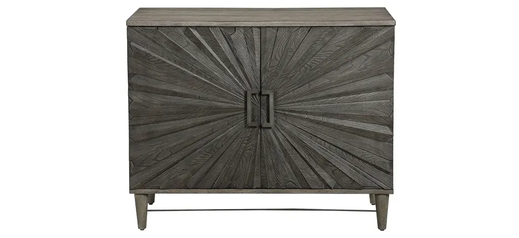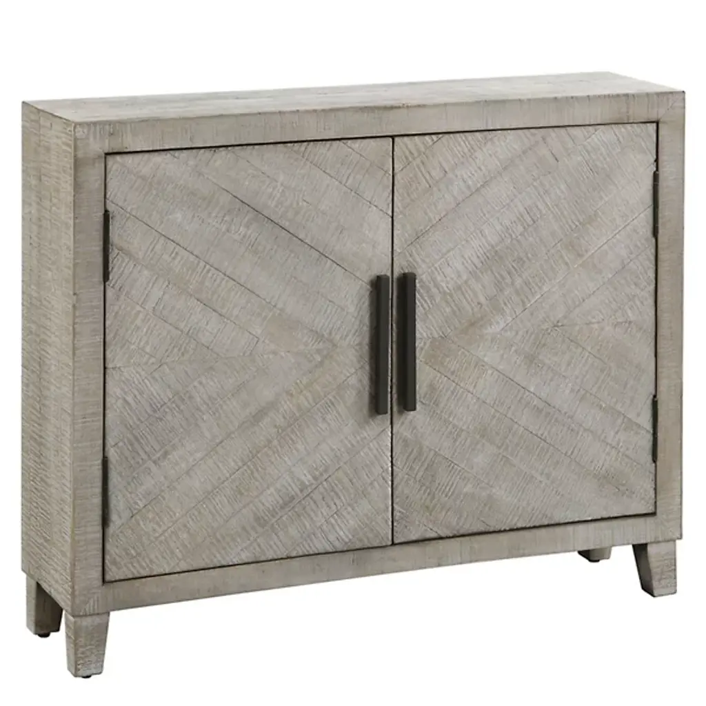 This modern farmhouse two door Adalind Accent Cabinet features linear textured fir wood, finished in a whitewashed glaze with oatmeal undertones. Antique bronze iron door pulls open to one adjustable shelf.
