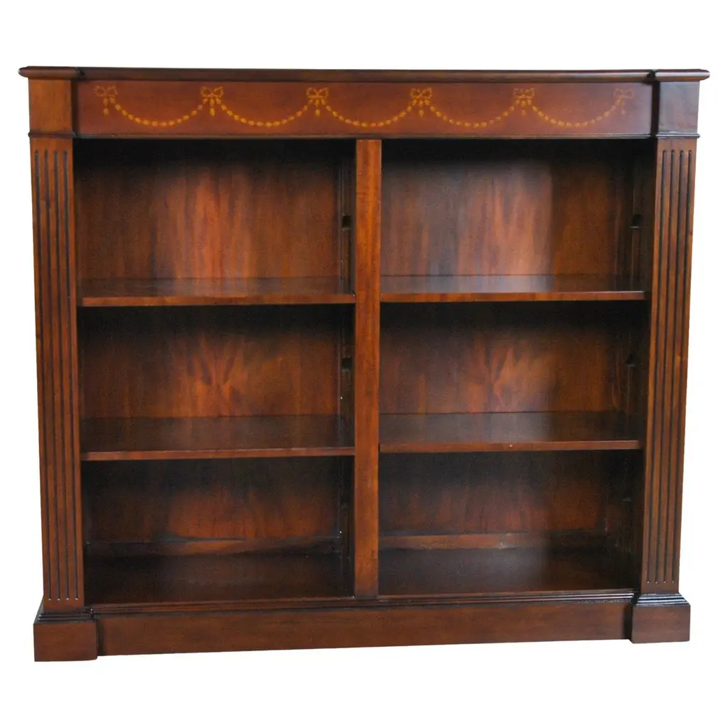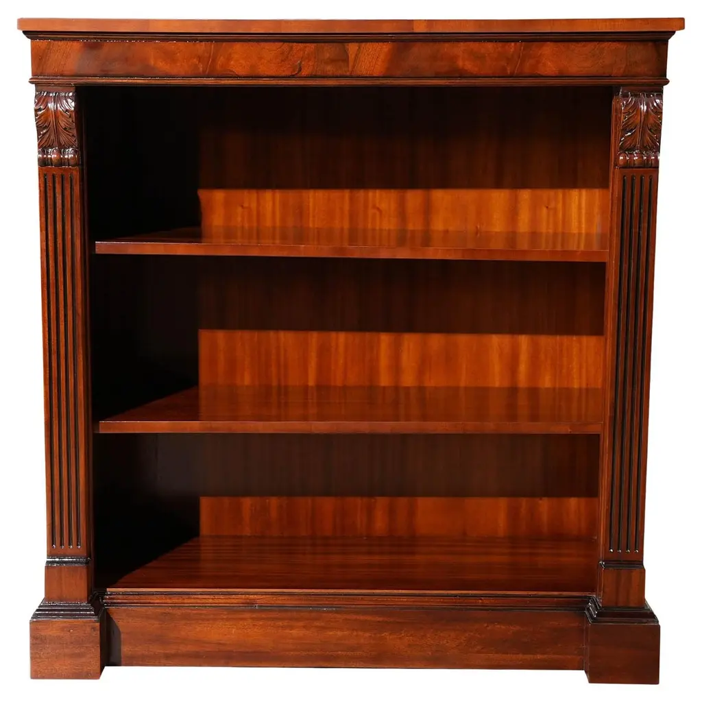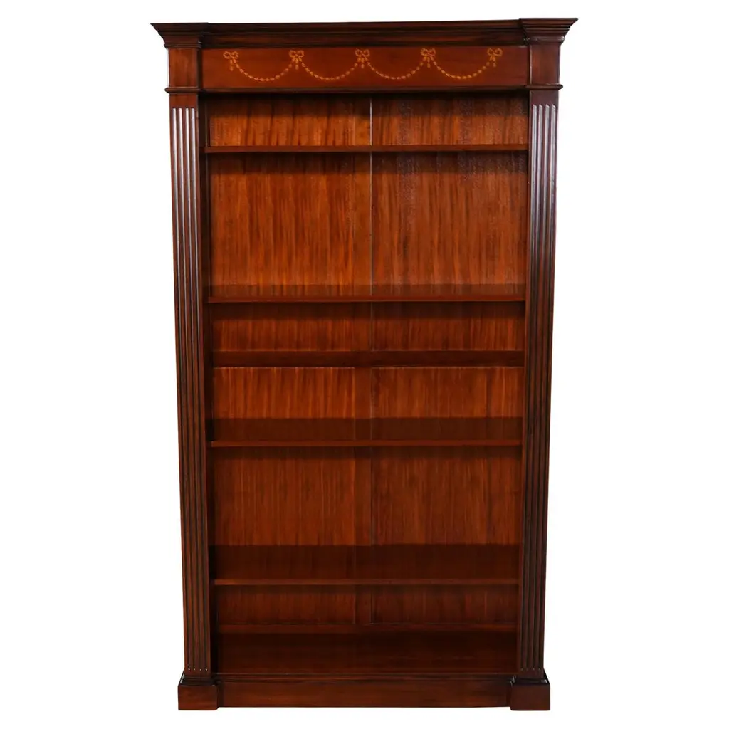 This superb beech bookcase is a stately design made to last and complement classic homes with unprecedented refinement. A minute reproduction of an authentic Adam-style piece from circa 1780-1820, it flaunts hand-carved grooves on the sides, coupled with other exquisite details accenting the top frame such as the bronze handles on the two drawers.