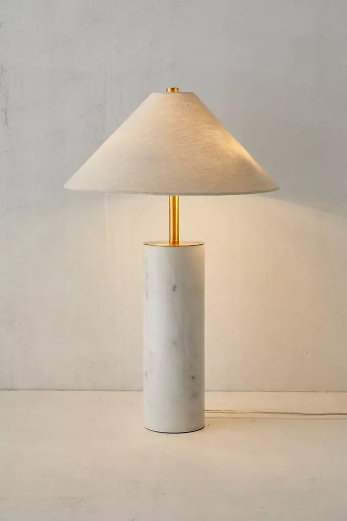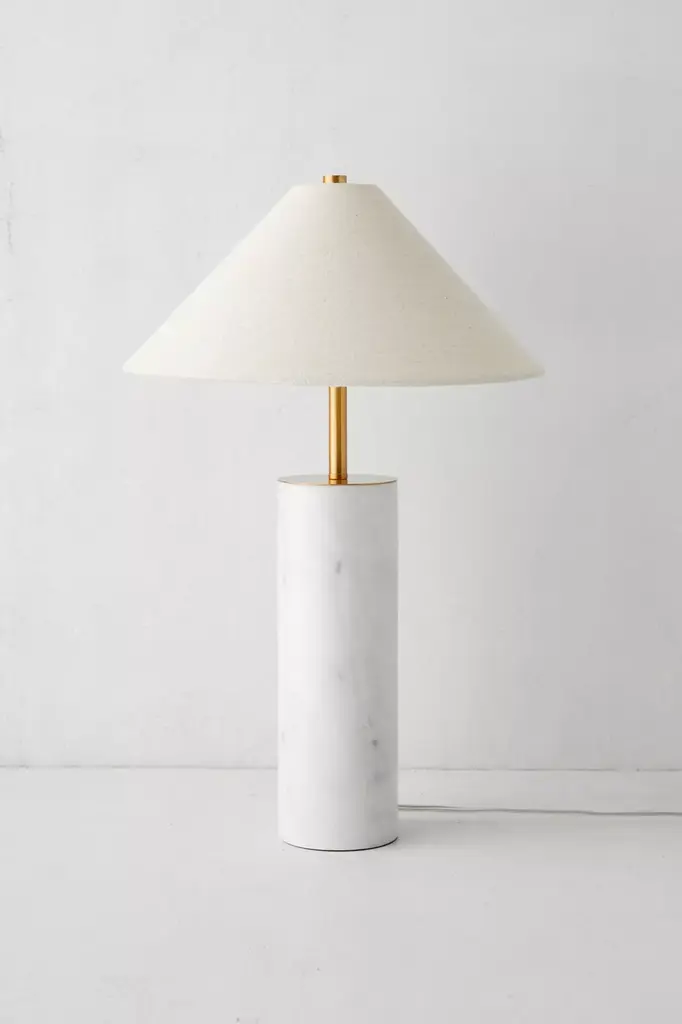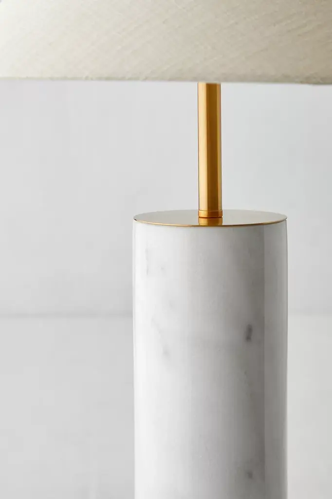 Infuse your space with a sense of effortless chic with this luxe marble table lamp. Fitted with a cylindrical marble base, it’s topped with a slim, gleaming metal neck and finished with a woven polyester shade set at a sharp angle that’s perfectly placed. Plugs in to power on. **Features** \- Marble table lamp \- Plug-in \- On/off in-line rotary switch \- Requires 2 25W E12 G50 bulbs - not included \- Shade included **Content + Care** \- Brass-plated steel, marble, polyester \- Wipe clean \- Imported \- Made in compliance with US electrical standards. To use this item outside of the US, pair with an outlet adapter and voltage converter made specifically for use in your location. **Size** \- Dimensions: 13.8”dia x 21.7”h \- Shade dimensions: 13.8”dia x 5.9”h \- Base dimensions: 3.9”dia x 11.8”h \- Wattage: 25W \- Cord length: 70.9” \- Weight: 18 lbs Ships in 2 packages \- Shipping package 1 dimensions: 15”l x 15”w x 8”h \- Shipping package 1 weight: 3 lbs \- Shipping package 2 dimensions: 20”l x 10”w x 8”h \- Shipping package 2 weight: 17 lbs