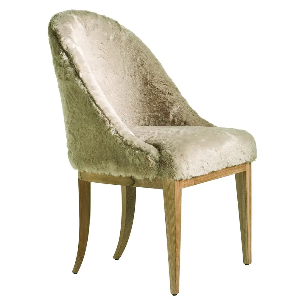 Our reproduction of a classic 1940s French dining chair cossets in comfort with its gently flared back and padded seat, both upholstered in luxe, long-haired New Zealand sheepskin. The clean-lined frame and tapered saber legs are crafted of solid oak. SHOP THE ENTIRE COLLECTION
