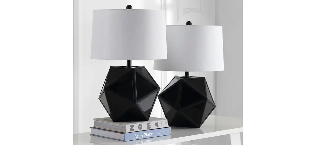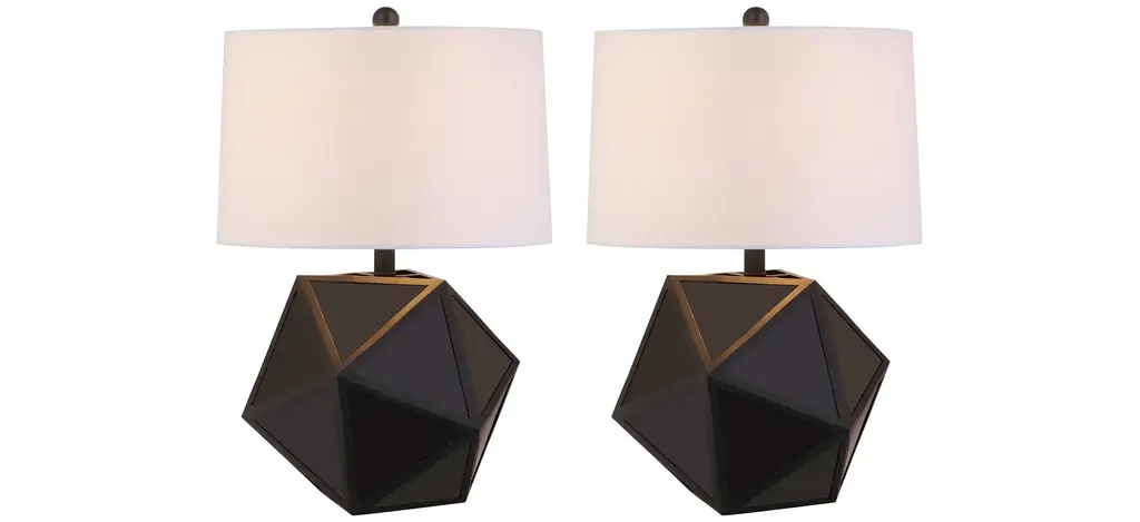 Inspired by the sophistication of modern minimalism, this contemporary Adele Table Lamp Set is a focal point in any living room. Its substantial metal geometric design features a black finish that highlights its sculpted three dimensional triangles. Sold in sets of two.
