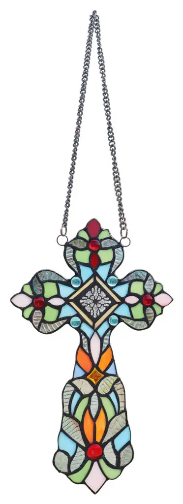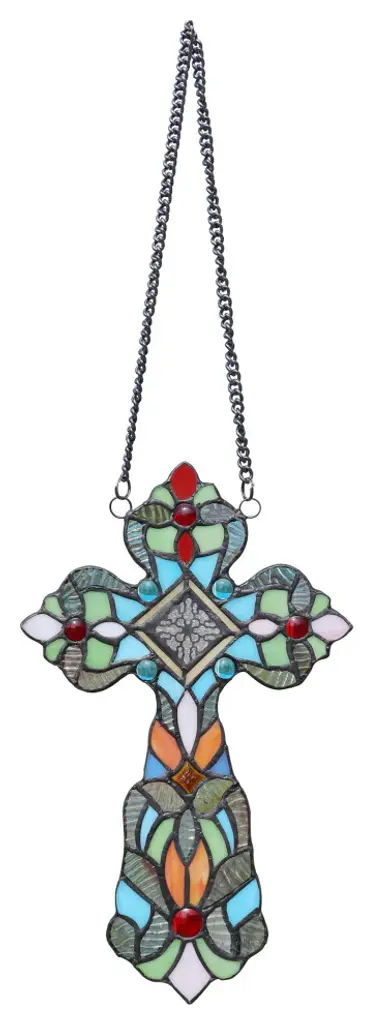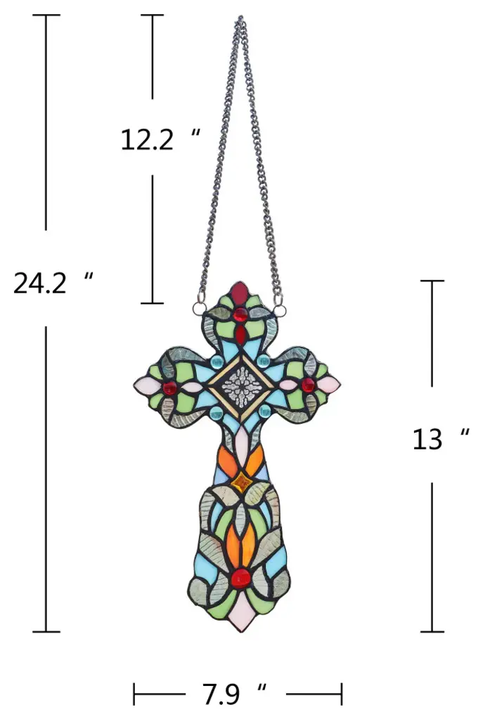 This cross panel is an extremely detailed stained glass window panel, featuring a Victorian design and a 24.2" chain. This panel is made up of over 72 pieces of hand-cut, stained art glass and 9 glass beads, each wrapped in a fine copper foil and soldered together at high heat to form each unique panel. It is hand created using the same technique developed by Louis Comfort Tiffany in the early 1900''s. Each piece is unique, and is sure to catch everyone''s eye with it''s warm colors. Exact size to the nearest inch may vary, and exact color of each glass piece may vary due to each piece being hand crafted. First image is with the light shining through, second image is with no light. Dry listed and recommended for an indoor setting.