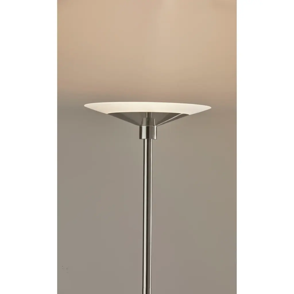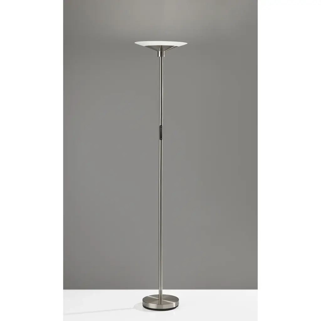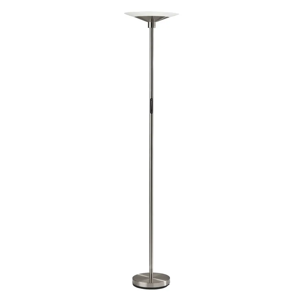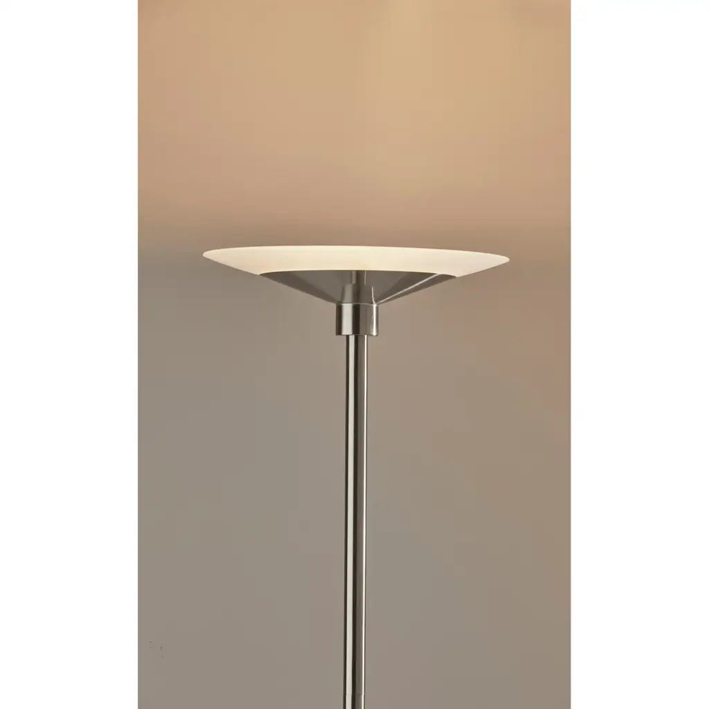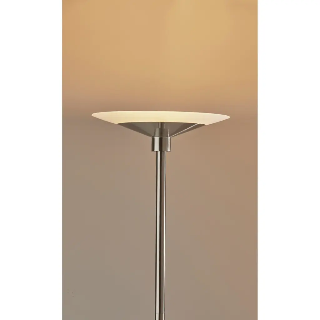 A sleek, modern style, the Solar LED Torchiere supports wellness by syncing your indoor lighting up with your circadian rhythm. By adjusting your lamp's color temperature throughout the day you can simulate the natural progression of the sun, helping to regulate the body's internal clock to improve sleep habits and overall personal health. The color of the light is controlled by a sleek touch switch located on the pole, which is also used to adjust the light intensity offering a full range of brightness options. With a brushed steel finish and a frosted glass shade, the Cosmo LED Torchiere is a modern, versatile look that will fit in and elevate any home style. Place this lamp in your living room or bedroom to fill the room with 2200 lumens of bright, ambient lighting. All Adesso lighting product is either UL or ETL listed, meaning that it has been tested and approved to meet the government-regulated safety standards for the USA. Features: A brushed steel finish with high quality frosted glass shade Wellness Smart Switch with 5 Color Temperature settings A wide range of light output to suit your moods throughout the day ETL listed 1 x 24 watts Integrated LED Color Temp. Settings are 2700K, 3300K, 3900K, 4500K, 5000K Touch Smart Switch 60-inch cord Title 20 compliant: Yes Some assembly required 1-year limited manufacturer warranty Measurements: Width is 14-inch Height is 70.50-inch Extension/Depth is 14-inch Weight is 13.24lbs Shade measures 14" Dia. Base Measures 10" Dia.