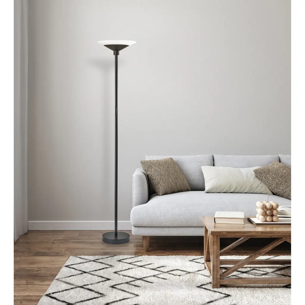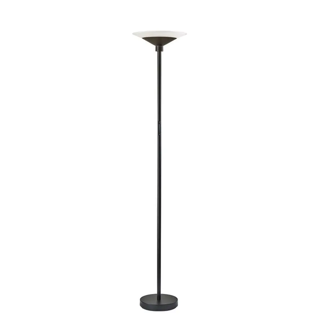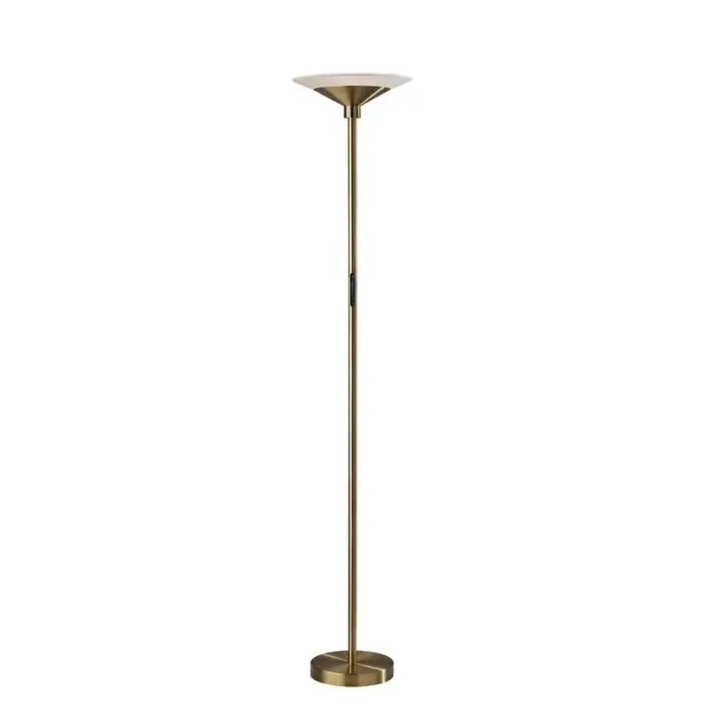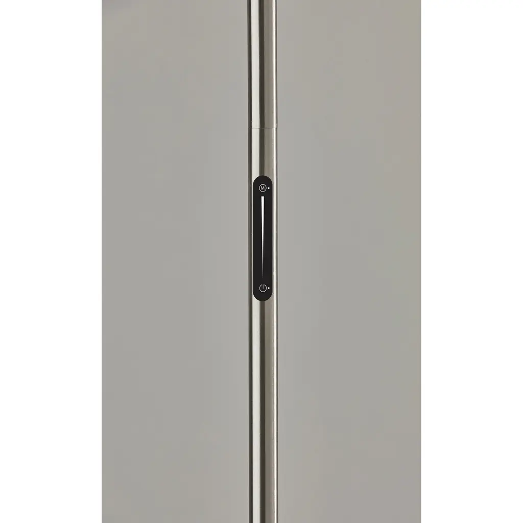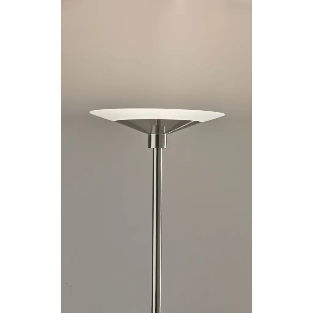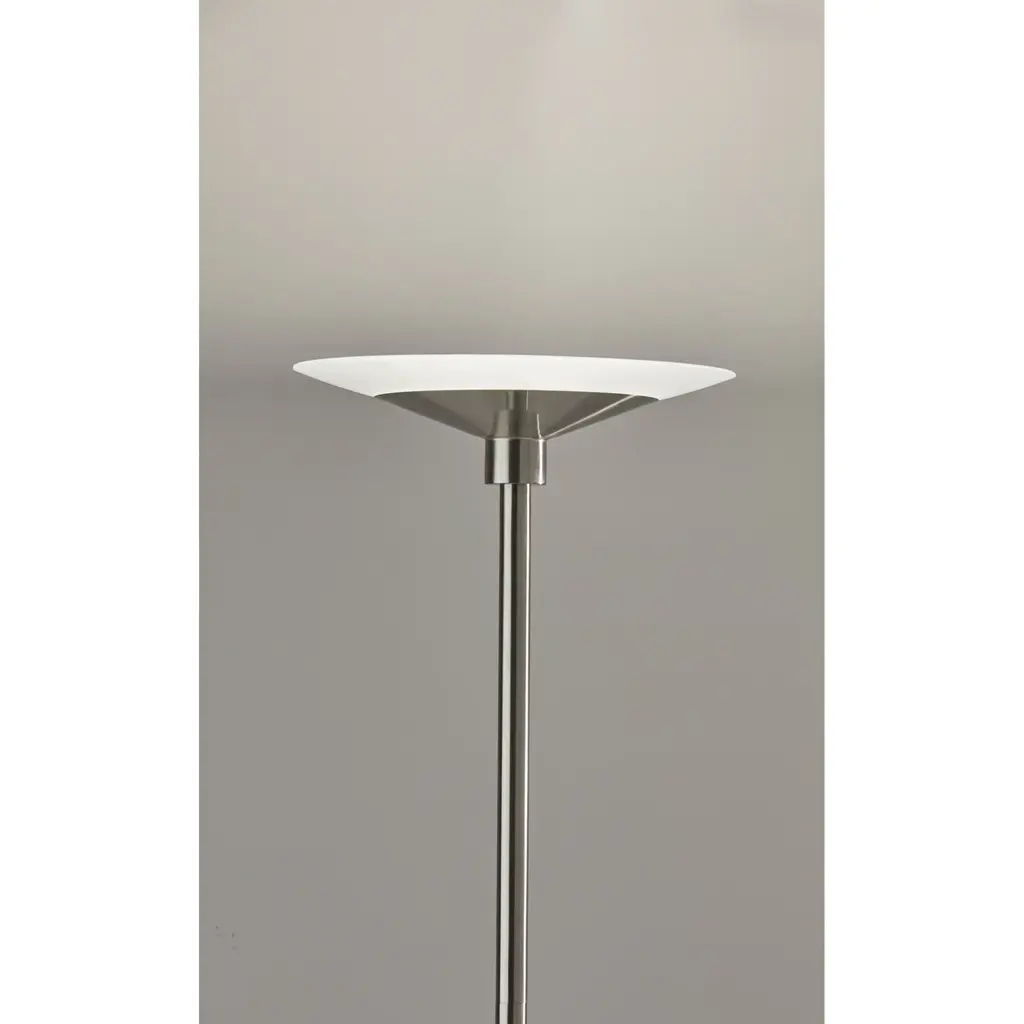 A sleek, modern style, the Solar LED Torchiere supports wellness by syncing your indoor lighting up with your circadian rhythm. By adjusting your lamp's color temperature throughout the day you can simulate the natural progression of the sun, helping to regulate the body's internal clock to improve sleep habits and overall personal health. The color of the light is controlled by a sleek touch switch located on the pole, which is also used to adjust the light intensity offering a full range of brightness options. With a brushed steel finish and a frosted glass shade, the Cosmo LED Torchiere is a modern, versatile look that will fit in and elevate any home style. Place this lamp in your living room or bedroom to fill the room with 2200 lumens of bright, ambient lighting. All Adesso lighting product is either UL or ETL listed, meaning that it has been tested and approved to meet the government-regulated safety standards for the USA. Features: A brushed steel finish with high quality frosted glass shade Wellness Smart Switch with 5 Color Temperature settings A wide range of light output to suit your moods throughout the day ETL listed 1 x 24 watts Integrated LED Color Temp. Settings are 2700K, 3300K, 3900K, 4500K, 5000K Touch Smart Switch 60-inch cord Title 20 compliant: Yes Some assembly required 1-year limited manufacturer warranty Measurements: Width is 14-inch Height is 70.50-inch Extension/Depth is 14-inch Weight is 13.24lbs Shade measures 14" Dia. Base Measures 10" Dia.