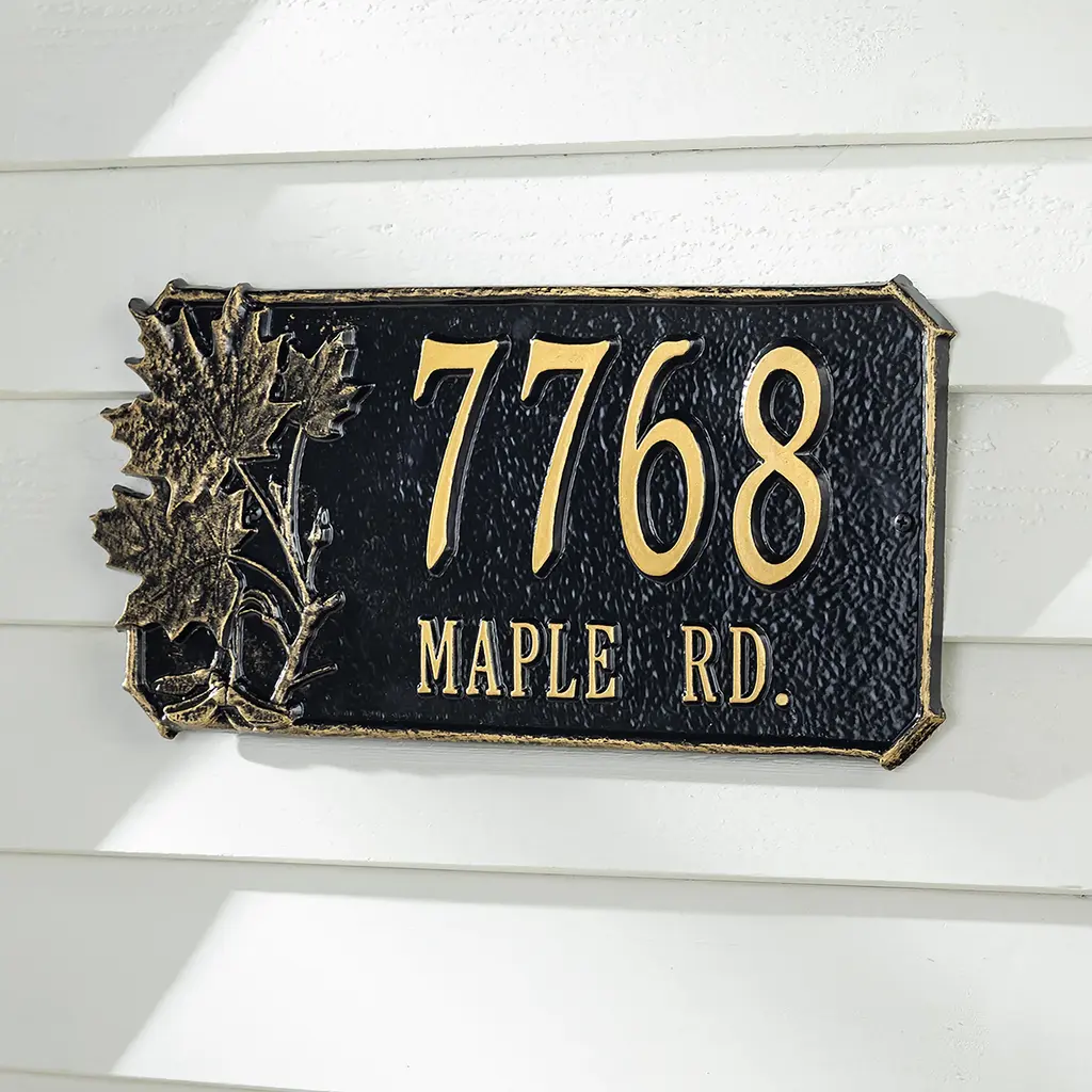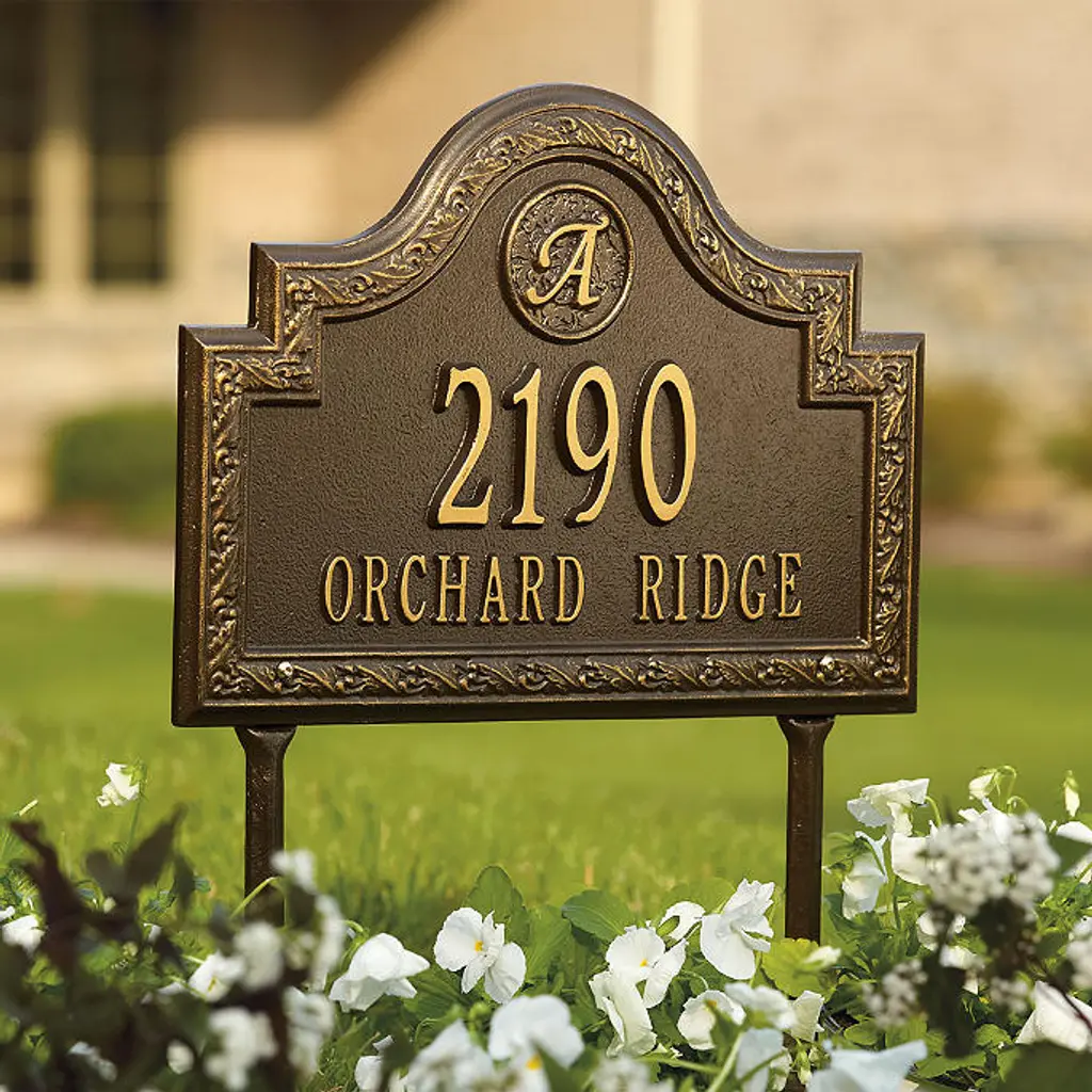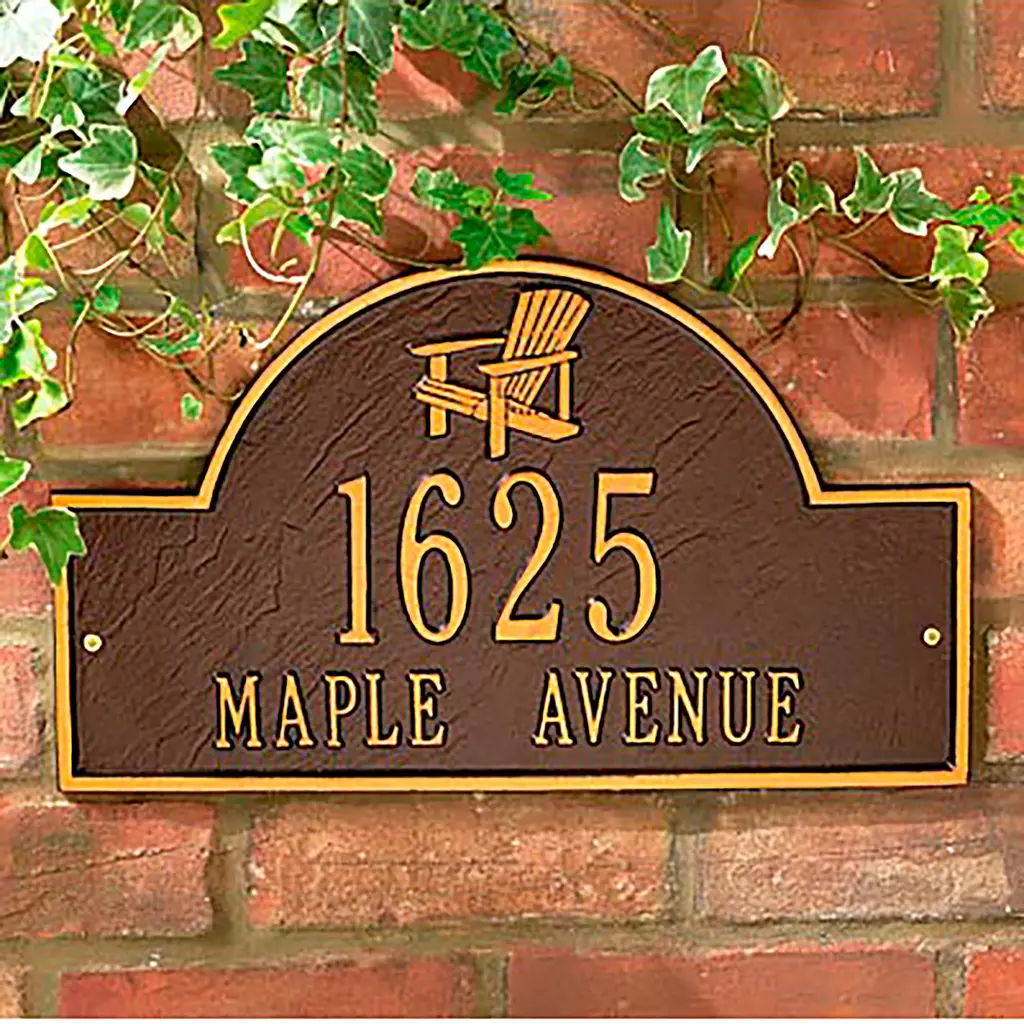 Custom-made in the USA from recycled cast aluminum, our Adirondack Address Lawn Sign suits any home or yard. The sign features raised gold-hued lettering on your choice of background color. Powder-coat finish protects them from the elements. Includes two 18"H stakes with hardware.