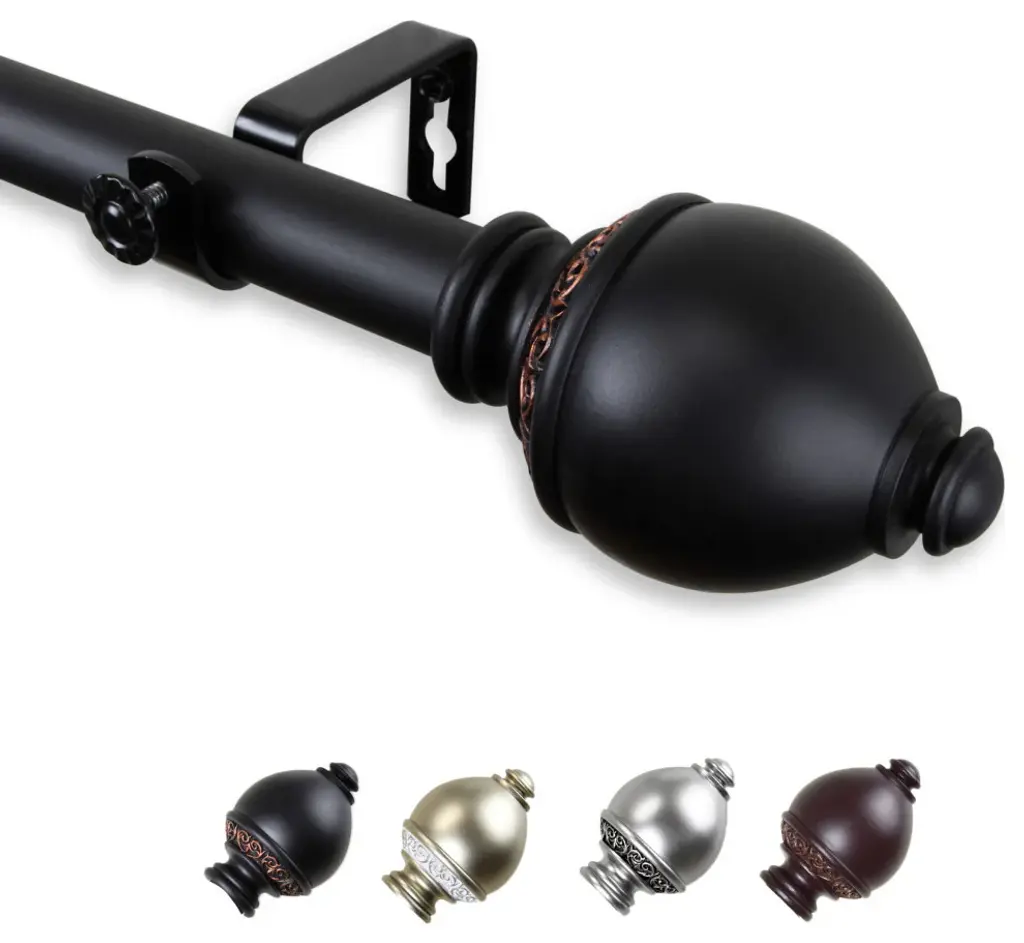 This set includes one 84"-120" adjustable rod, two finials, three matching brackets, and mounting hardware.The rod has a black finish, with round, acorn-shaped finials in black.The diameter of the rod is 5/8". Uses 3/4" or larger curtain rings (sold separately).The brackets adjust from 4" to 5 1/2". The finials measure 2 1/4" long and 1 3/8" wide.Available in 7 finishes: Black, Glossy White, Bronze, Brushed Steel, Antique Brass, Pewter, and Antique Gold.