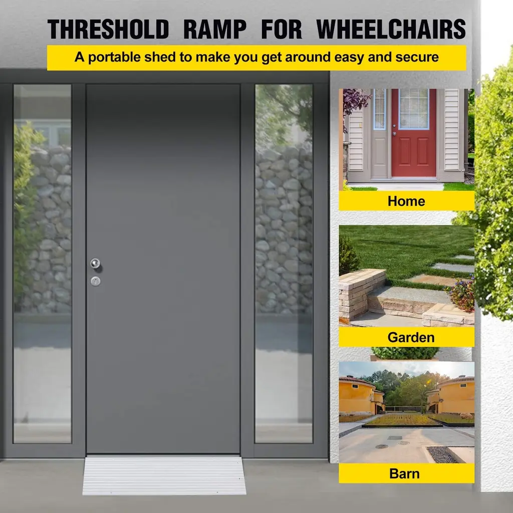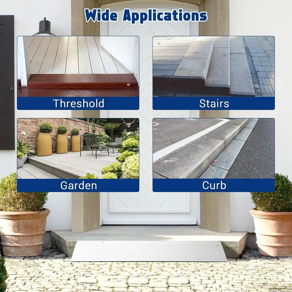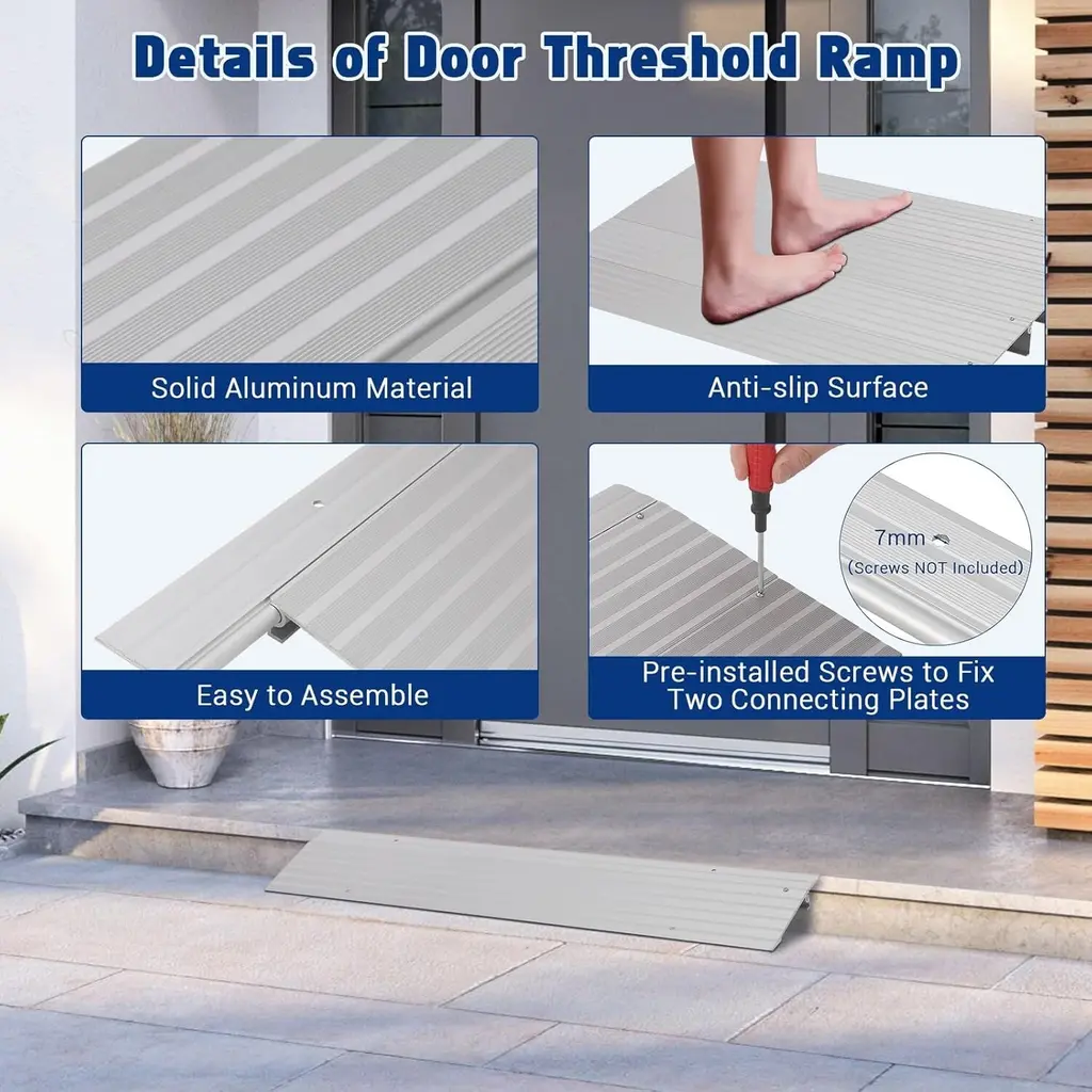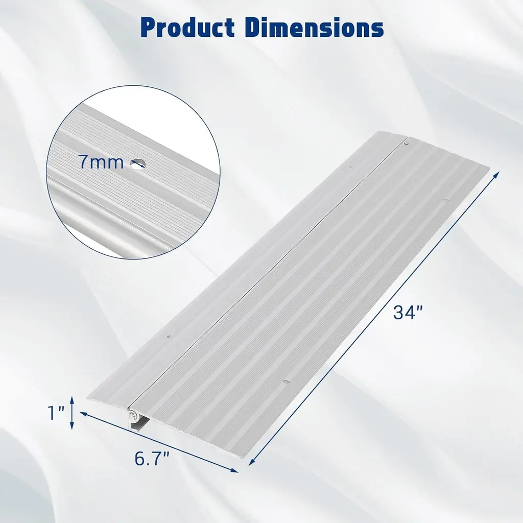 Name: Door Threshold RampMaterial: AluminumPackage List: Aluminum Door Threshold RampDimensions and Package List: 1 section door ramp in the package, the size is 6.7" L x 34" W x 1"H. The max weight capacity is up to 700 lbs.2 section door ramp in the package, the size is 11.6" L x 34" W x 2.3"H. The max weight capacity is up to 700 lbs.3 section door ramp in the package, the size is 16.3" L x 34" W x 3.3"H. The max weight capacity is up to 700 lbs.4 section door ramp in the package, the size is 21.3" L x 34" W x 4.1"H. The max weight capacity is up to 700 lbs.5 section door ramp in the package, the size is 26.2" L x 34" W x 5"H. The max weight capacity is up to 700 lbs.High-quality Aluminum: The gate ramp is made of high-quality aluminum, which is lightweight but strong and rust-proof. The entrance ramp has a non-slip surface and is suitable for indoor and outdoor use.Adjustable Height: Each size of the ramp has an adjustable baffle, which is attached to the top of the ramp and can be connected or removed to adjust the height to meet your different needs.Wide Application: Due to the load-bearing capacity of 700 pounds, the door threshold ramp can be used for wheelchairs, scooters, electric bicycles, walkers, canes to pass through.Easy to Assemble: The threshold ramp can be assembled and disassembled without tools. The oval plug-in connection makes it easy to slide each part together. For your safety, you can buy suitable screws to fix the ramp to the ground. The screw hole diameter is 0.27 inches (7 mm).