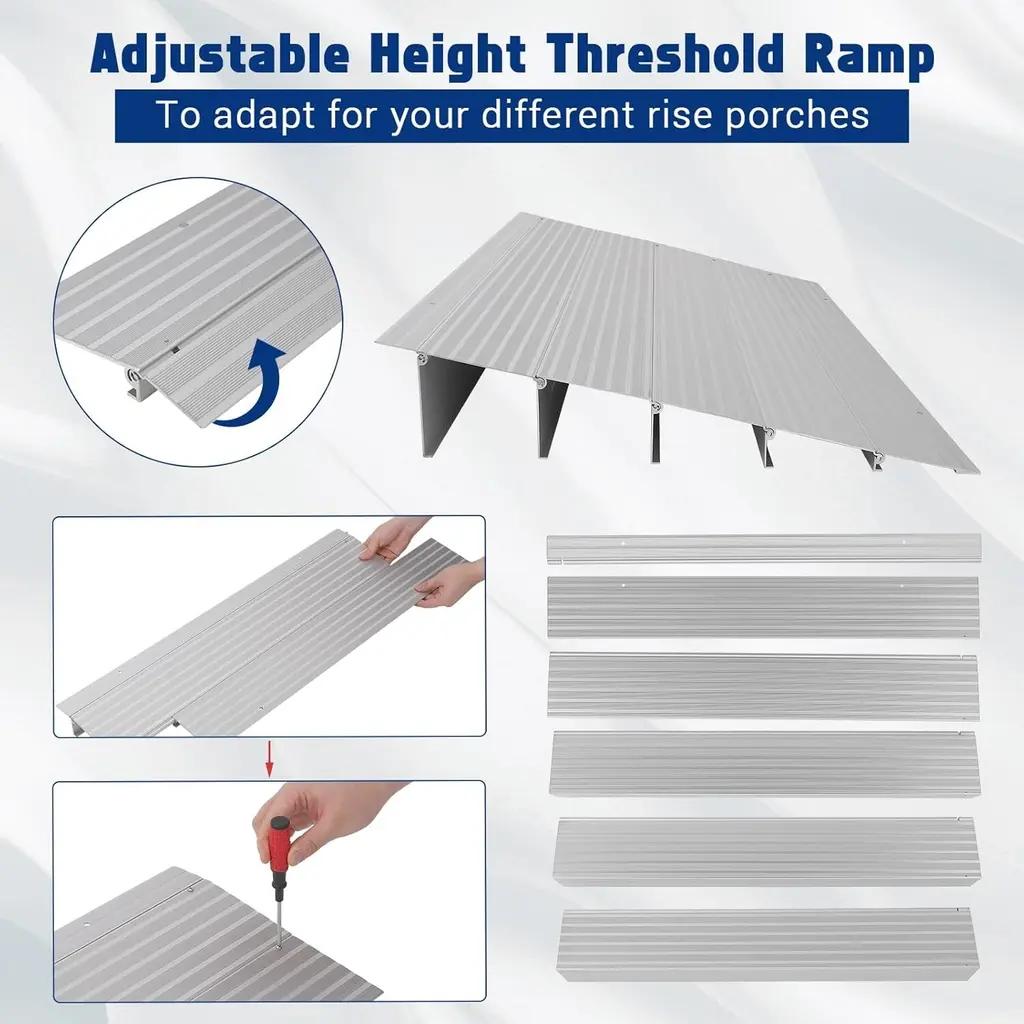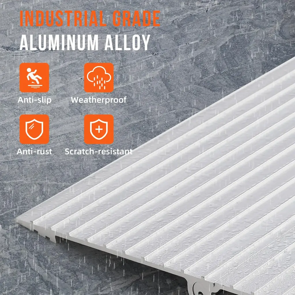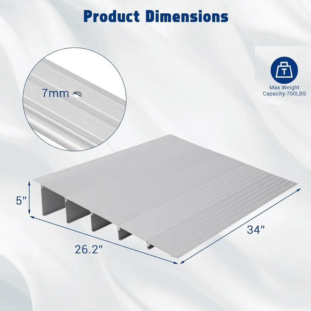 Name: Door Threshold RampMaterial: AluminumPackage List: Aluminum Door Threshold RampDimensions and Package List: 1 section door ramp in the package, the size is 6.7" L x 34" W x 1"H. The max weight capacity is up to 700 lbs.2 section door ramp in the package, the size is 11.6" L x 34" W x 2.3"H. The max weight capacity is up to 700 lbs.3 section door ramp in the package, the size is 16.3" L x 34" W x 3.3"H. The max weight capacity is up to 700 lbs.4 section door ramp in the package, the size is 21.3" L x 34" W x 4.1"H. The max weight capacity is up to 700 lbs.5 section door ramp in the package, the size is 26.2" L x 34" W x 5"H. The max weight capacity is up to 700 lbs.High-quality Aluminum: The gate ramp is made of high-quality aluminum, which is lightweight but strong and rust-proof. The entrance ramp has a non-slip surface and is suitable for indoor and outdoor use.Adjustable Height: Each size of the ramp has an adjustable baffle, which is attached to the top of the ramp and can be connected or removed to adjust the height to meet your different needs.Wide Application: Due to the load-bearing capacity of 700 pounds, the door threshold ramp can be used for wheelchairs, scooters, electric bicycles, walkers, canes to pass through.Easy to Assemble: The threshold ramp can be assembled and disassembled without tools. The oval plug-in connection makes it easy to slide each part together. For your safety, you can buy suitable screws to fix the ramp to the ground. The screw hole diameter is 0.27 inches (7 mm).
