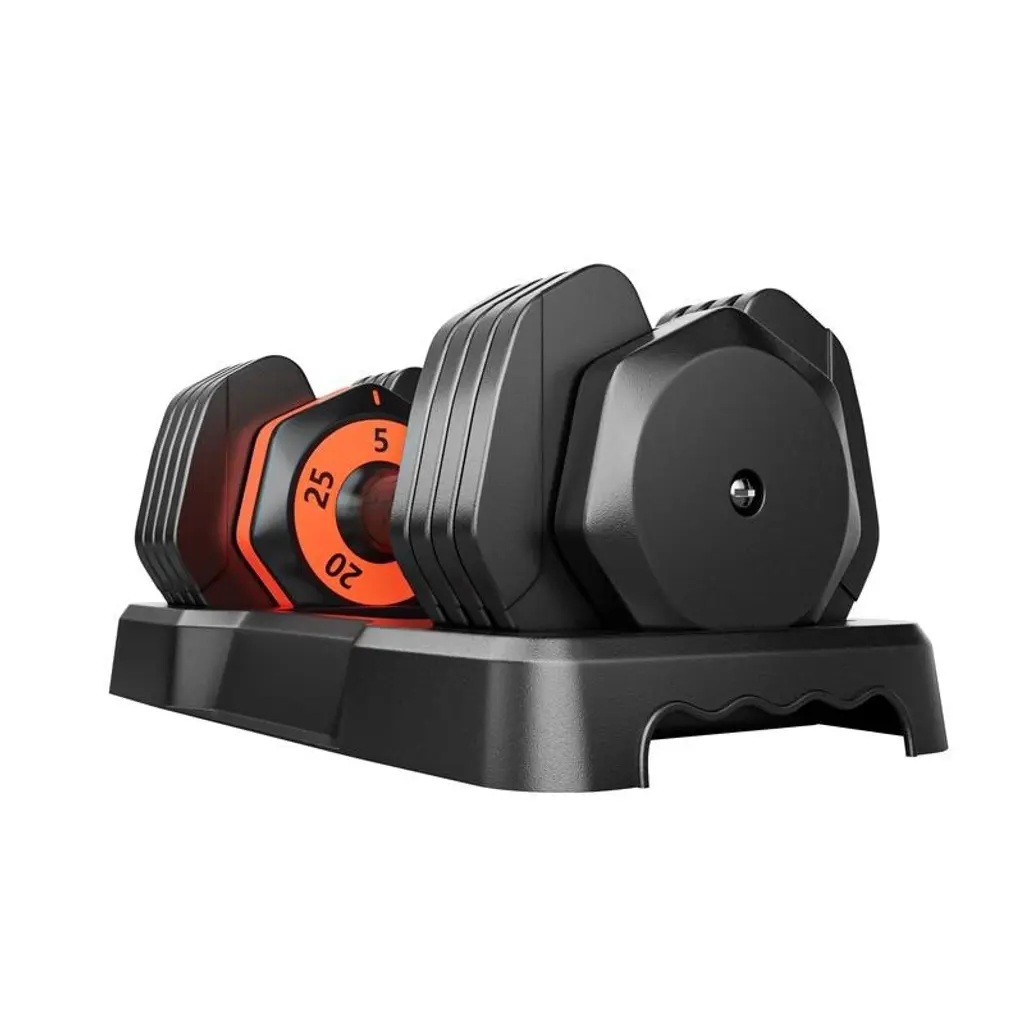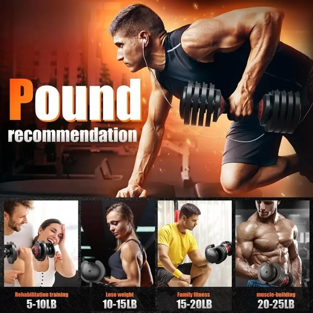 5-in-1 Versatile Training System Replace your entire dumbbell rack with this space-saving solution that delivers five weight options in one compact unit (5LB/10LB/15LB/20LB/25LB). Designed for both home gym enthusiasts and professional trainers, its intelligent weight-adjustment technology grows with your fitness level - from beginner routines to advanced strength training.Instant One-Second Weight Transition Our patented rotary dial system lets you switch between weights effortlessly with just one hand. The audible "click" confirmation and visual indicator eliminate guesswork, ensuring perfect weight selection every time. Spend less time adjusting and more time training with this seamless transition technology.80% More Space Efficient Professional-athlete approved design delivers the equivalent of five traditional dumbbell sets while occupying minimal space. Perfect for apartments, home gyms, or on-the-go training - get full workout variety without the clutter of multiple dumbbells.Dual-Lock Safety Certified System Featuring engineer-tested double locking mechanisms (tray + handle), our safety-first design prevents accidental disengagement. Weights securely lock during use and only release when properly docked, meeting ASTM fitness equipment safety standards for worry-free workouts.Total Body Transformation Tool From isolated muscle toning to full metabolic conditioning, this adjustable dumbbell promotes: ✓ Lean muscle growth ✓ Fat burning & calorie torching ✓ Cardiovascular endurance ✓ Balanced strength development ✓ Stress-relieving endorphin releaseAll in one premium, space-saving package that outlasts traditional dumbbell sets.