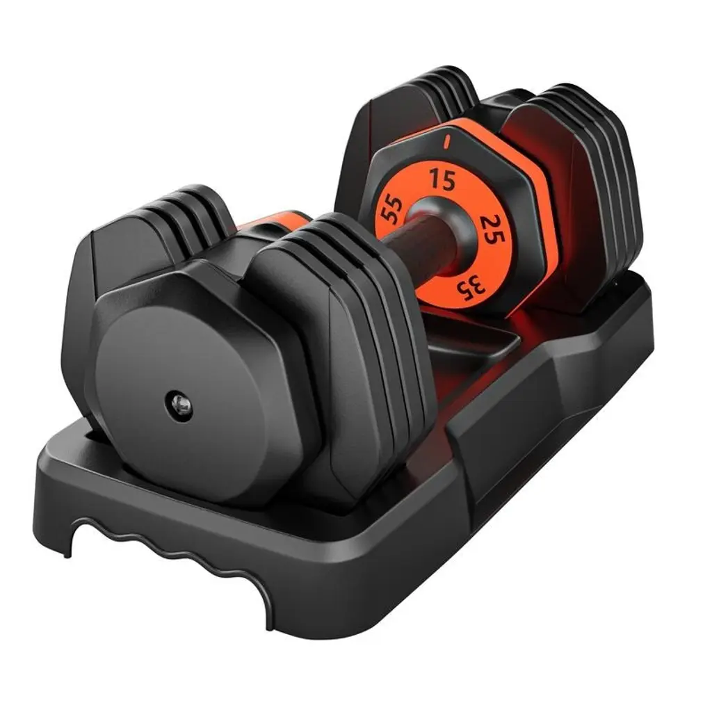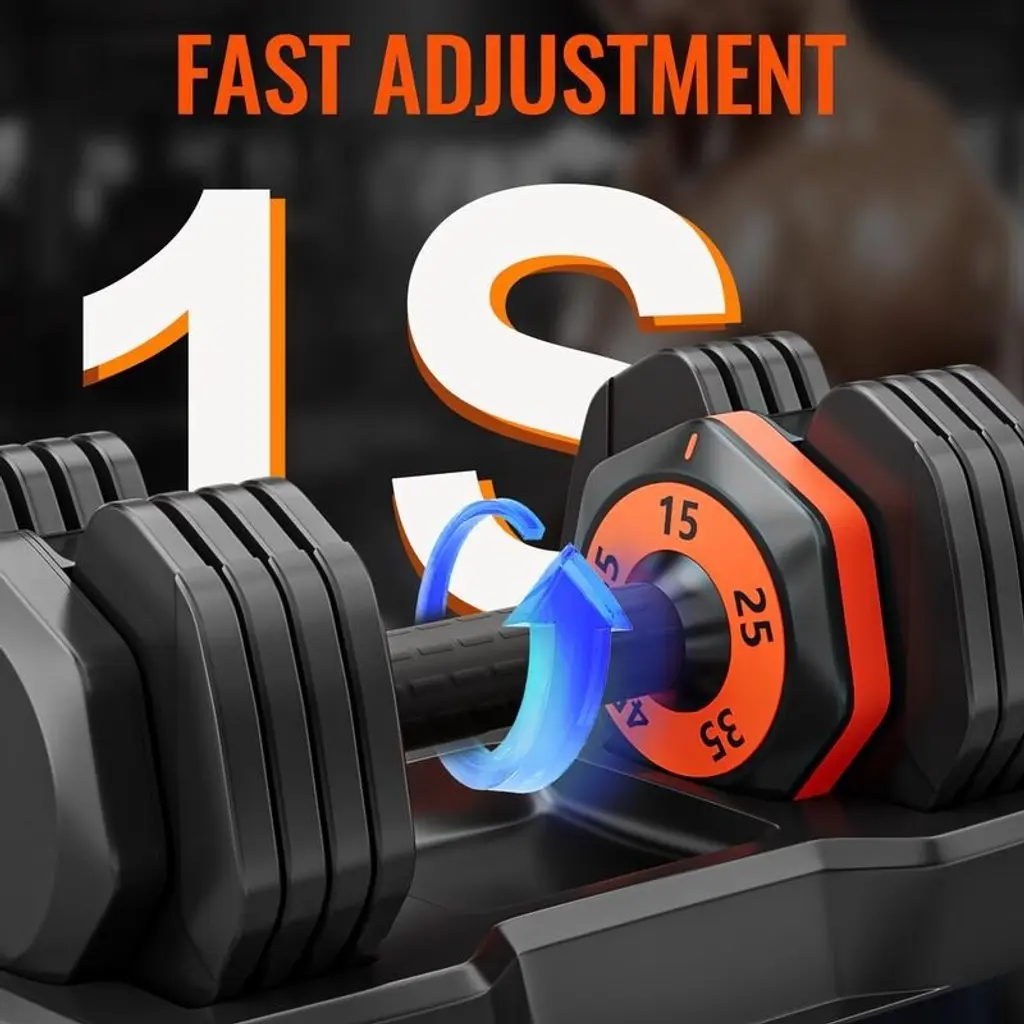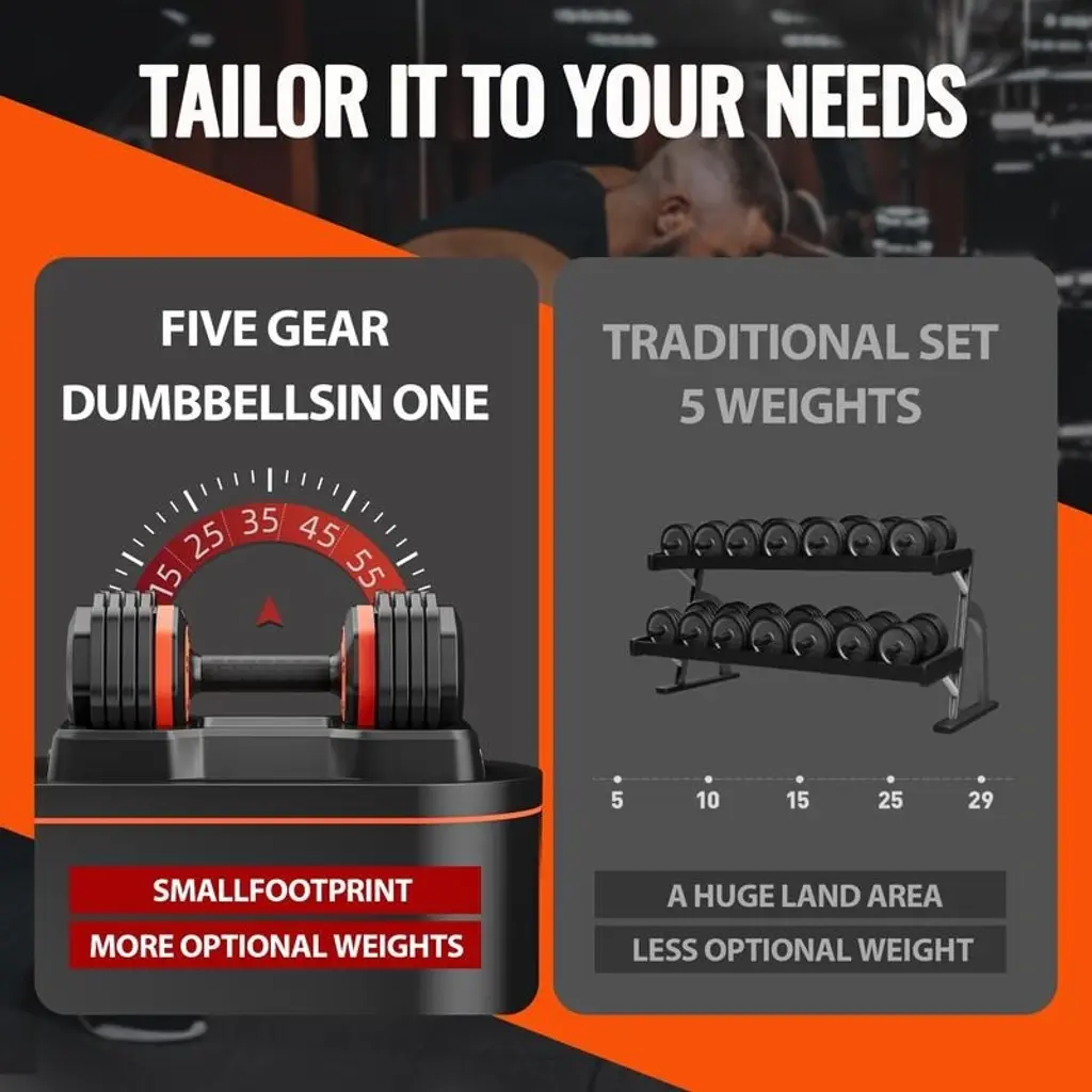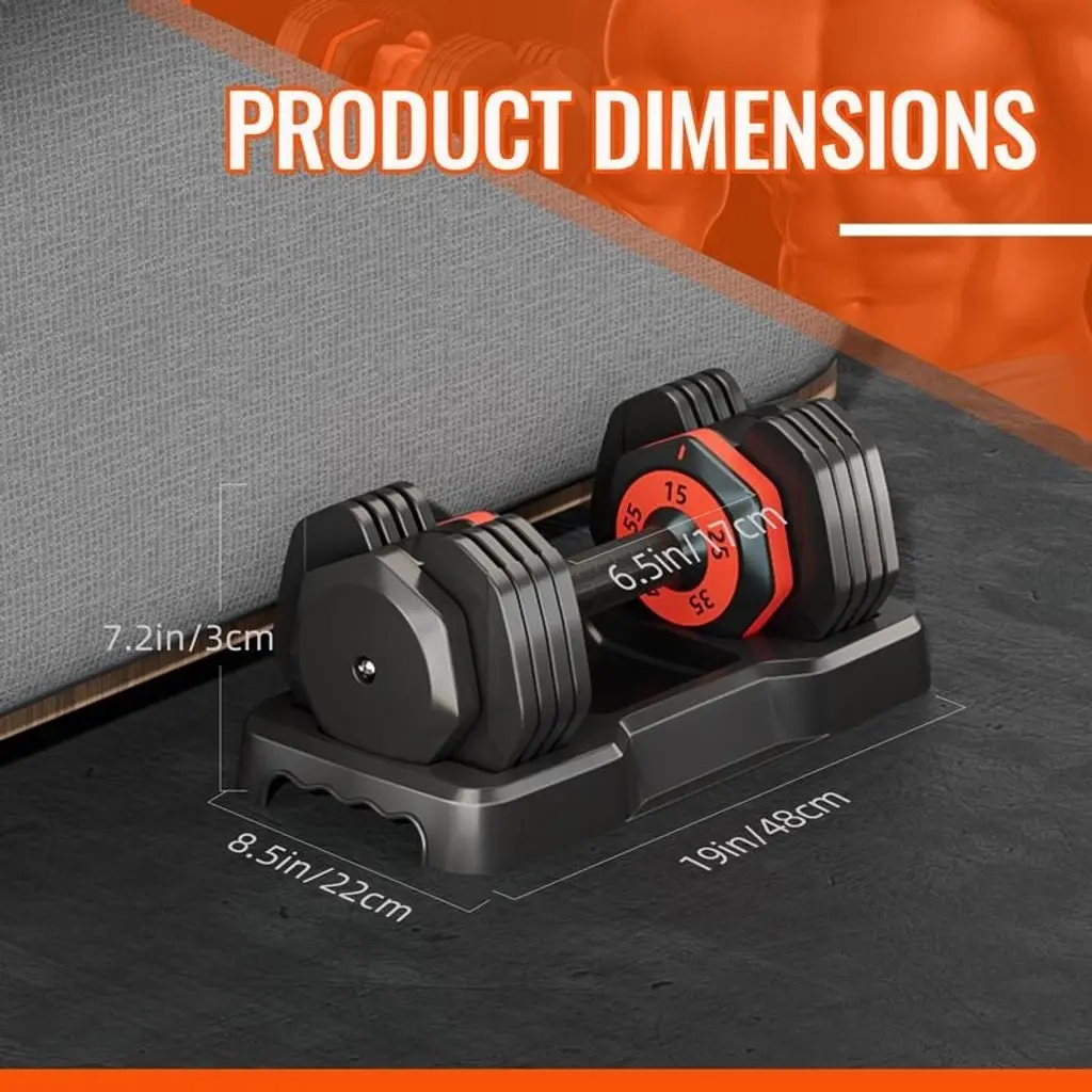 5-in-1 Versatile Training System Experience the convenience of five dumbbell sets in one compact design. This adjustable dumbbell adapts to your fitness level with seamless weight transitions, perfect for both beginners and professional trainers. Its intelligent engineering eliminates clutter while delivering full-range resistance training.Instant Weight Selection Technology Change weights in just one second with our patented rotary dial system. The audible click and visual indicator confirm each adjustment, ensuring uninterrupted workouts. No more fumbling with loose plates - just smooth transitions between exercises.Space-Saving Gym Solution Replace five traditional dumbbell sets with our innovative 80% space-efficient design. Professional-coach approved for optimal weight distribution and grip balance, this all-in-one system delivers diverse training options without sacrificing your floor space.Dual-Lock Safety Mechanism Our engineer-certified safety system features twin locking buckles on both tray and handle. Weight plates securely lock during use and only release when properly docked, preventing accidental disengagement for worry-free training sessions.Total-Body Transformation Tool From targeted muscle isolation to full-body HIIT routines, this multi-weight dumbbell promotes muscle growth, fat burning, and cardiovascular health. Correct strength imbalances while enjoying the mental benefits of efficient, varied workouts - all with one premium piece of equipment.