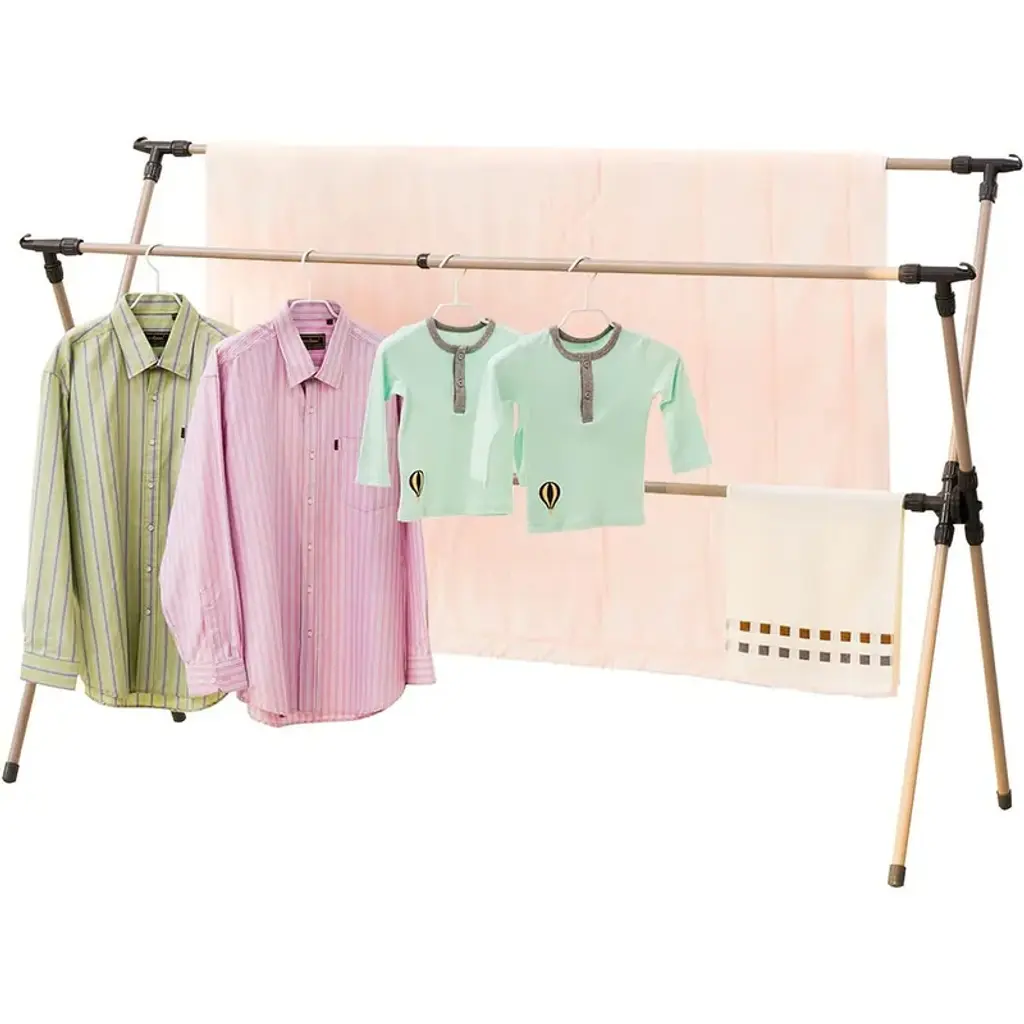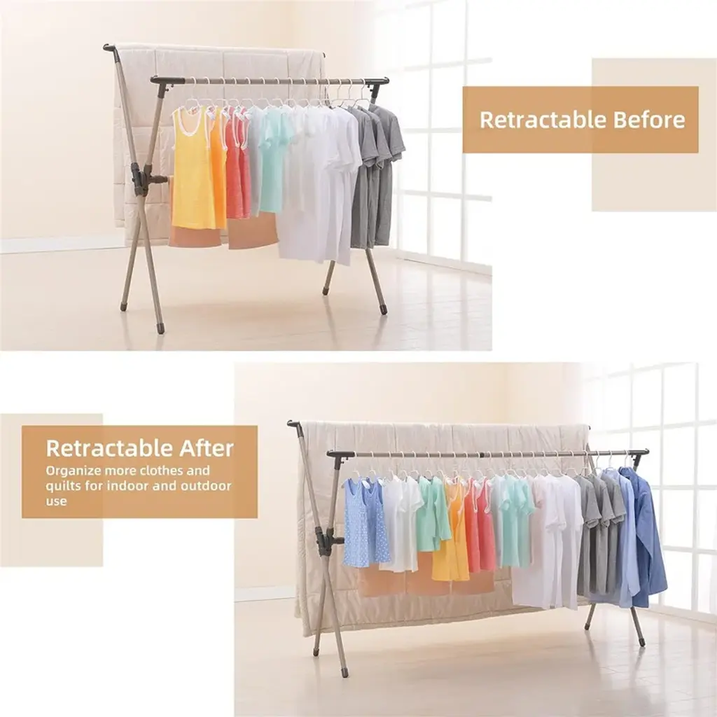 1. **Thickened Material**: This drying rack is constructed from carbon steel and ABS parts, ensuring stability, anti-rust properties, and a load capacity of up to 66 lbs. 2. **Adjustable Size**: The horizontal rods can extend from 47 to 79 inches, while the height adjusts from 43 to 49 inches, accommodating various drying needs. 3. **Space-Saving Design**: Easily foldable and retractable, this rack can be stored in corners without taking up much room, perfect for small spaces. 4. **Anti-Slip Features**: Equipped with tough foot covers that increase friction, preventing sliding and protecting your floors from damage. 5. **Versatile Use**: Ideal for drying quilts, clothes, and shoes, this rack is perfect for both indoor and outdoor settings, keeping everything organized.