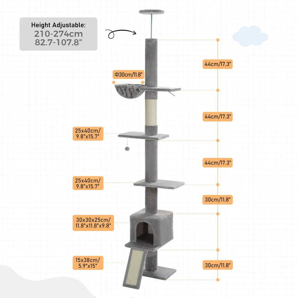 Adjustable Height Floor To Ceiling 5-Tier Tall Cat Tree Tower For Indoor Cats With Cat Condo, Cat Scratching Post And Cat Ladder - Grey