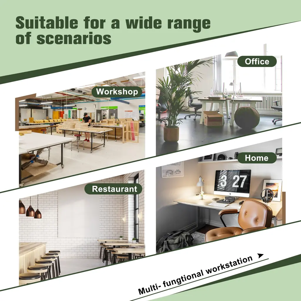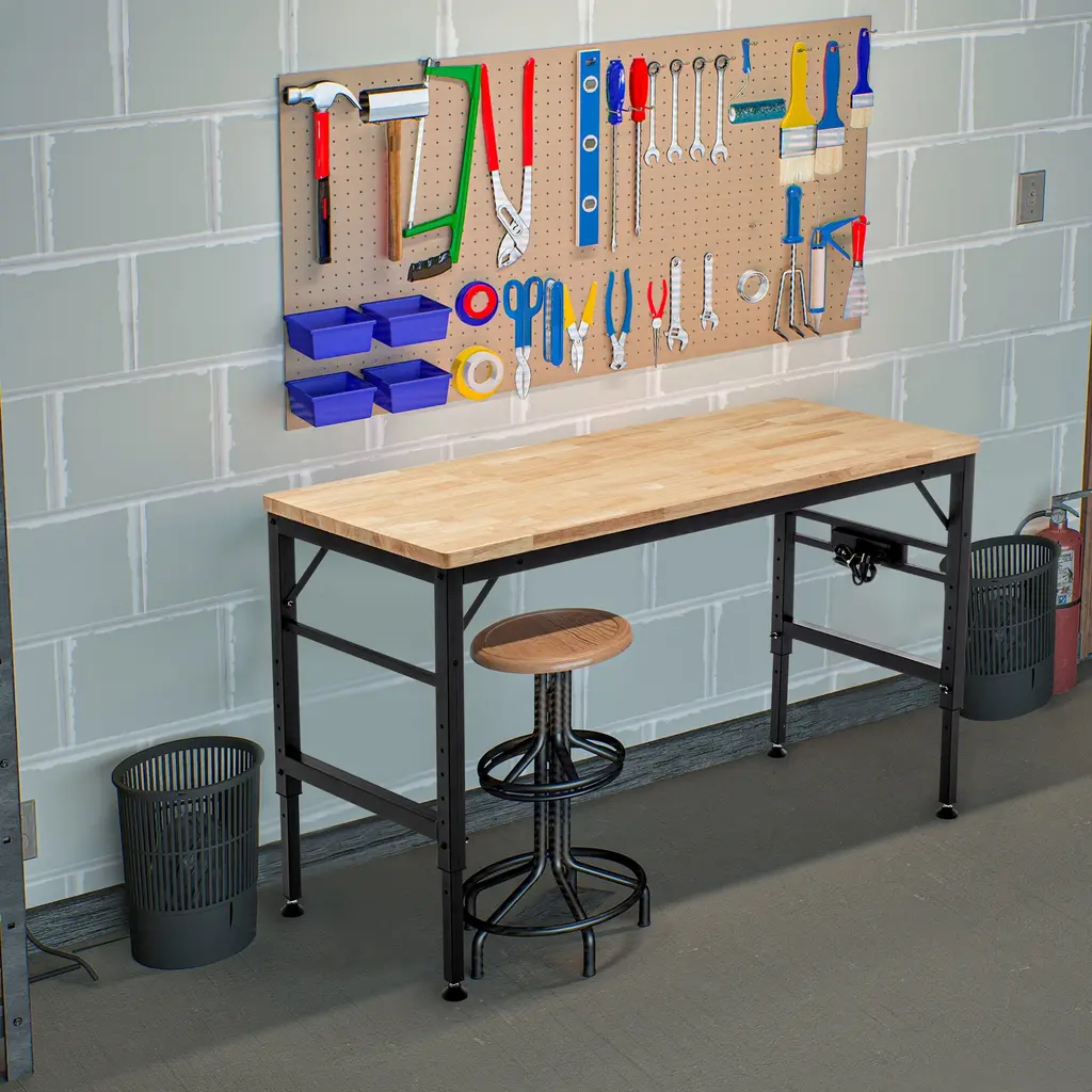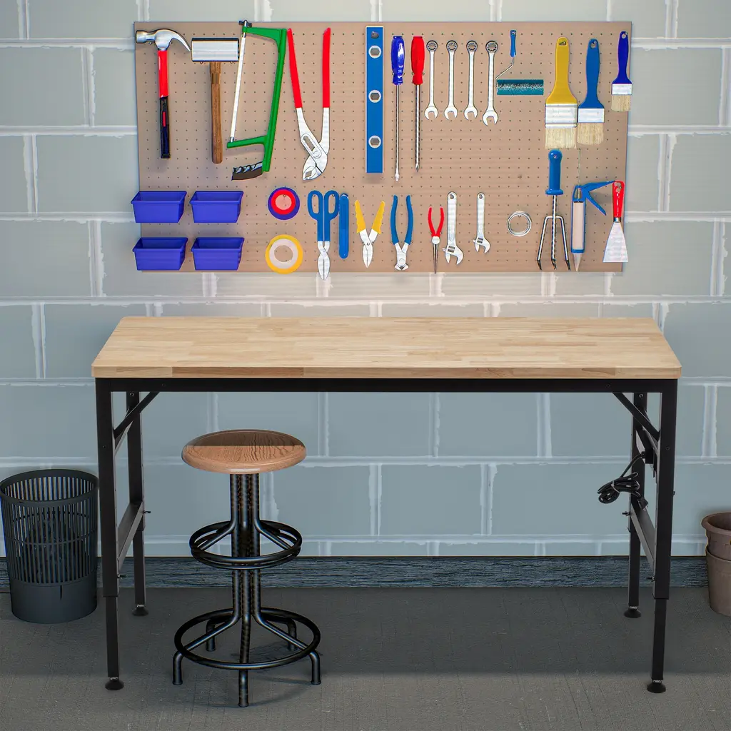 Warm tips: Product after-sales guide 🚀Thank you for purchasing our products!Please do not return the product in case of problems. Please take a photo and send it to us, we will quickly process and provide a reasonable solution. Thank you for your cooperation! 🙏Product Information: 【Solid Wood & Reinforcing Rod】 60" x 24" solid rubber wood top with metal frame, the weight load capacity of this heavy duty workbench over 2000 lbs, the extra support rod to make the table more stable horizontally. 【6-Level Adjustable Height Workstation】 No additional tools required, 28.74" to 39.37" freely adjust, allowing you to work comfortably standing or sitting, preventing the same working posture for too long. 【4 AC Power Outlets】 The ETL certified power strip has 4 AC Outlets and 1 Switch, making it easy to equip the worktable with various electric tools and lights. 【Adjustable Non-slip Foot Pad】 Each leg of the work bench is equipped with an adjustable rubber non-slip foot pad, so when the ground is uneven, you can freely adjust it properly to keep desktop horizontal. 【Perfect for Office & Commercial】 This is a beautiful and durable adjustable height desk, it's not just for garage or workshop, you can place it freely, home computer desk or shop table etc. It's very practical, it can do that!