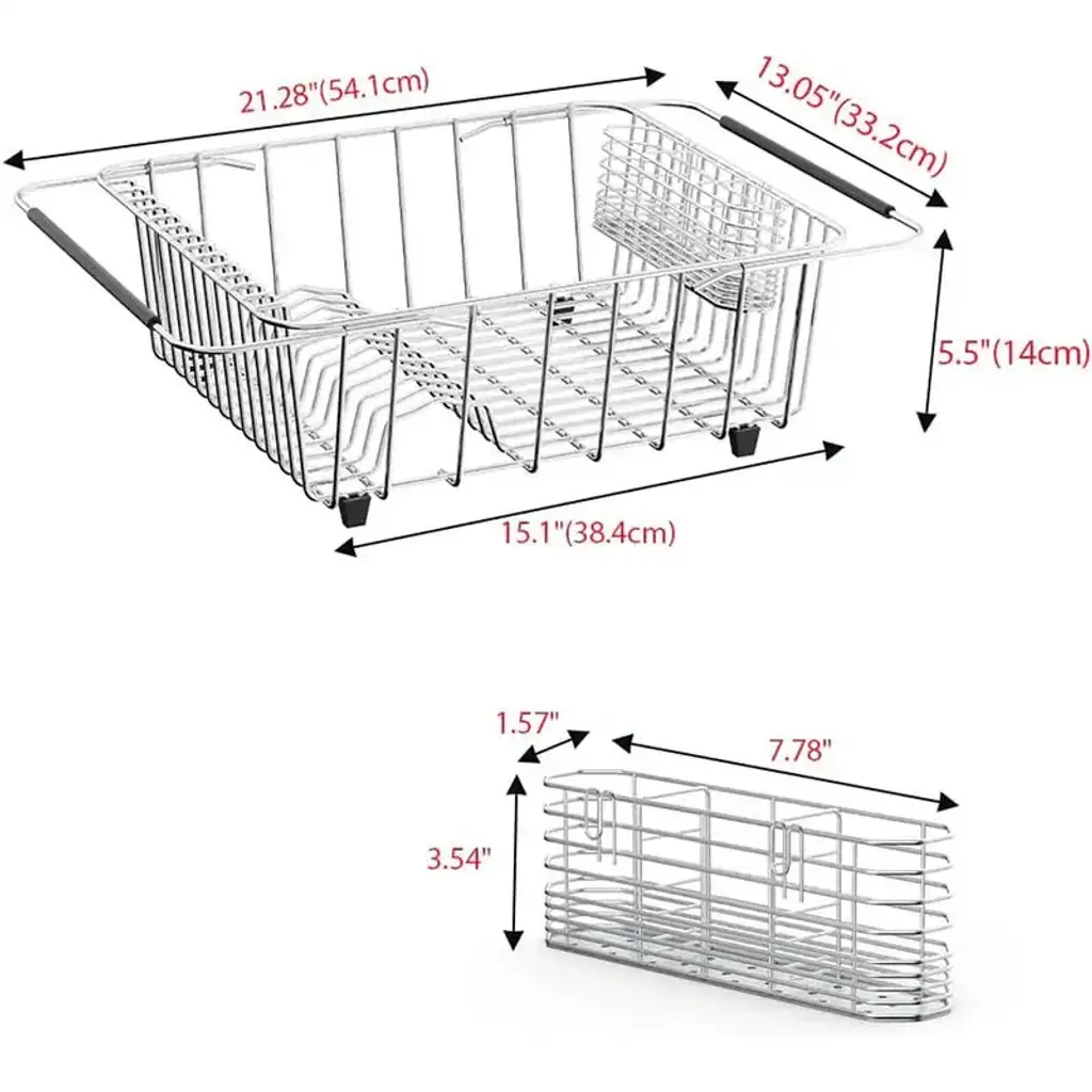 1. **Expansive Capacity**: This extra-large sink drying rack expands from 15.1 to 21.28 inches, holding up to 14 dishes vertically, ideal for families of 3-6. 2. **Versatile Use**: Suitable for various sink sizes, this rack can be used inside or over the sink, offering flexibility in your kitchen. 3. **Superior Material Quality**: Unlike chrome-plated materials, this food-grade 304 stainless steel is rust-resistant and built for longevity. 4. **Removable Silverware Holder**: The detachable silverware holder makes it easy to clean and organize your utensils efficiently. 5. **Multi-Functional Design**: This rack serves not only as a dish drainer but also for rinsing fruits and vegetables, maximizing its utility in the kitchen.
