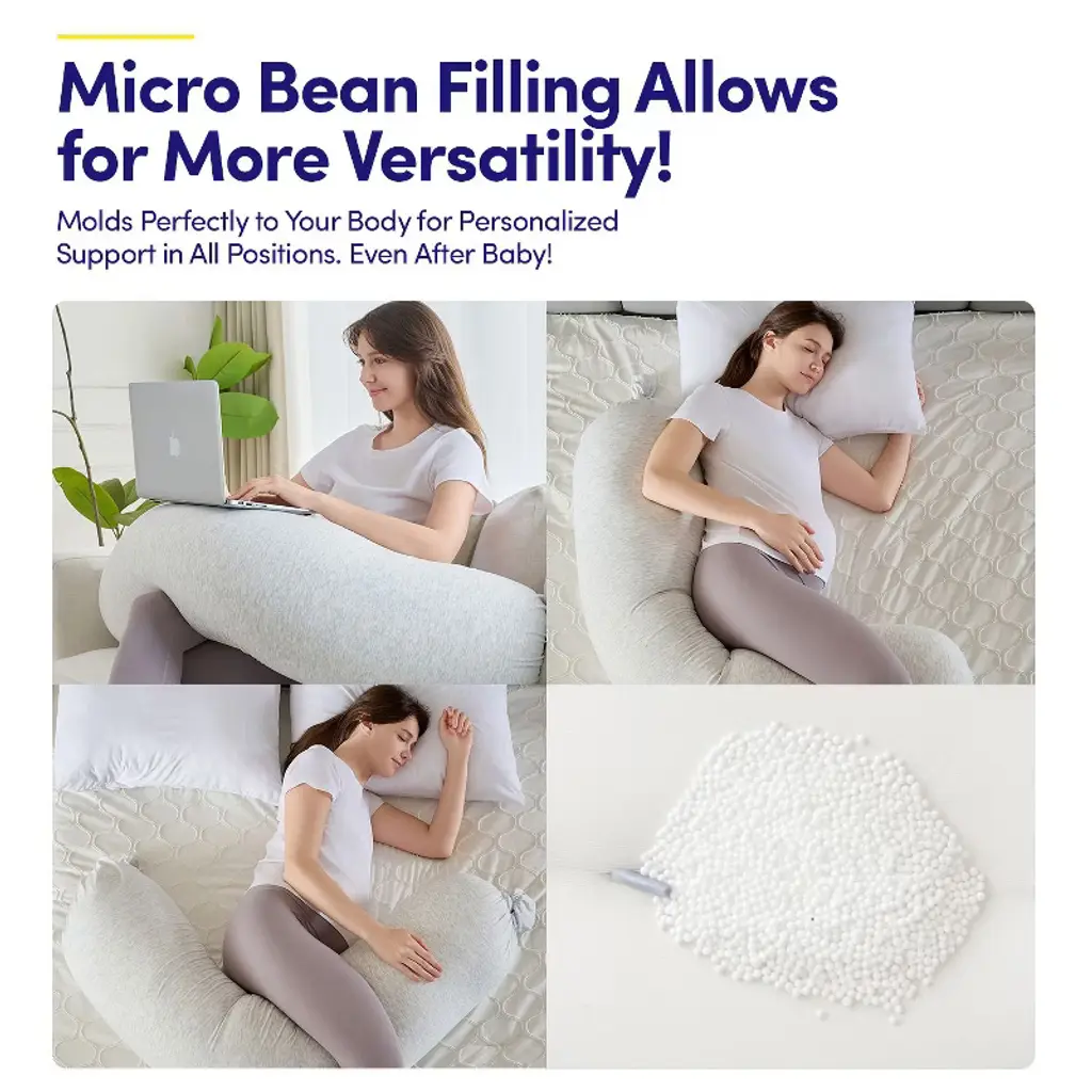 Experience the ultimate comfort and support with our Ultra Soft Full Body Maternity Pillow. Thoughtfully designed for moms-to-be, this pillow is filled with premium micro beans that contour perfectly to your body, reducing pressure on your back, hips, and legs while promoting proper sleep posture. Crafted with a soft and stretchy cotton-spandex outer cover and a durable 100% polyester inner cover, this pillow delivers long-lasting comfort and flexibility. The removable, machine-washable cover ensures easy cleaning and freshness night after night. Perfect for pregnancy, postpartum recovery, or anyone in need of extra support, this pillow provides all-night comfort whether you’re sleeping, lounging, or relaxing.